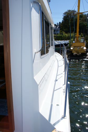 When cruising you need to be close to the water. That's why we have a large aft cockpit. Close to the swimming or close to the fishing. And while in port there is room to lounge in the cockpit. You don't have to be perched on top of a cabin. When underway you command her from a spacious flybridge with 360° visibility and room for your family, too! All instruments are readily at hand. Below, there is a family-sized salon featuring an "L" shaped settee, a hi-low table, and a lower helm station. Plenty of opening windows, superb views, gentle fabrics. Two steps down and you're in the galley with its 2-burner stove, refrigerator, double sink, and teak parquet sole. To starboard is a very spacious head with separate shower. Forward there's a large private owner's stateroom complete with hanging locker and built-in bureau. All finished in richly appointed teak joinerwork by Cape Dory's famous craftsmen.