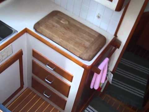 When cruising you need to be close to the water. That's why we have a large aft cockpit. Close to the swimming or close to the fishing. And while in port there is room to lounge in the cockpit. You don't have to be perched on top of a cabin. When underway you command her from a spacious flybridge with 360° visibility and room for your family, too! All instruments are readily at hand. Below, there is a family-sized salon featuring an "L" shaped settee, a hi-low table, and a lower helm station. Plenty of opening windows, superb views, gentle fabrics. Two steps down and you're in the galley with its 2-burner stove, refrigerator, double sink, and teak parquet sole. To starboard is a very spacious head with separate shower. Forward there's a large private owner's stateroom complete with hanging locker and built-in bureau. All finished in richly appointed teak joinerwork by Cape Dory's famous craftsmen.