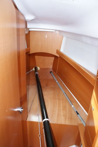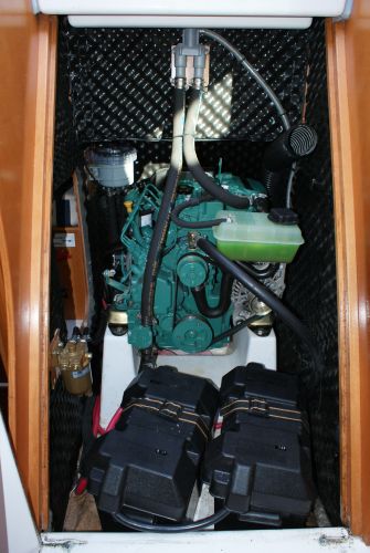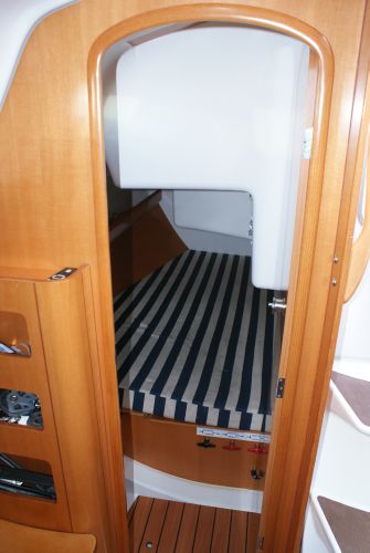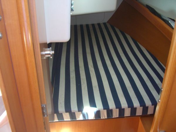 Two aft cabins complete her interior. The port cabin features a "queen" double berth (6' 6"x5' 8") and the starboard cabin has a an over-sized single berth (6' 6"x3' 8"). Other features in the cabins include: hanging lockers, shelves alongside the hull and storage space under the berths.