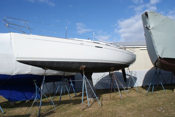"Slipstream" has "Beneteau white" gel-coat topsides with a painted silver boot stripe and vinyl cove stripe. She has black bottom paint.