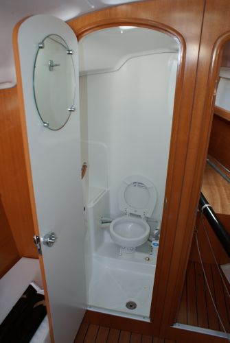 The headis just aft of the forward cabin. This is a fully molded compartment for easy cleaning. A round wash basin with mixer tap, pressurized hot and cold shower, mirror, towel hook and accessories complete this space.