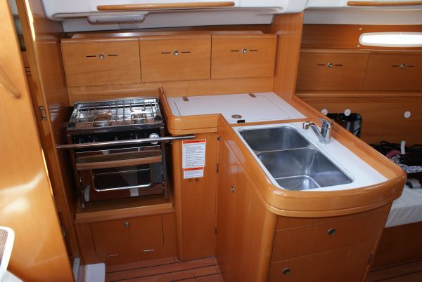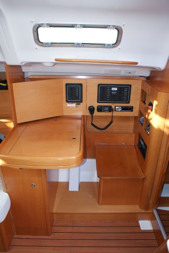 The galley is aft to port and the Nav station is aft to starboard of the salon. The nav station has a large table with space for storage, ample space for instrumentation and additional storage under the seat.