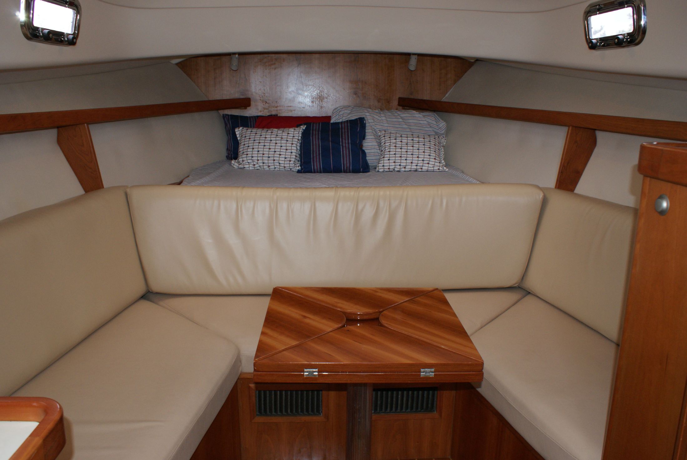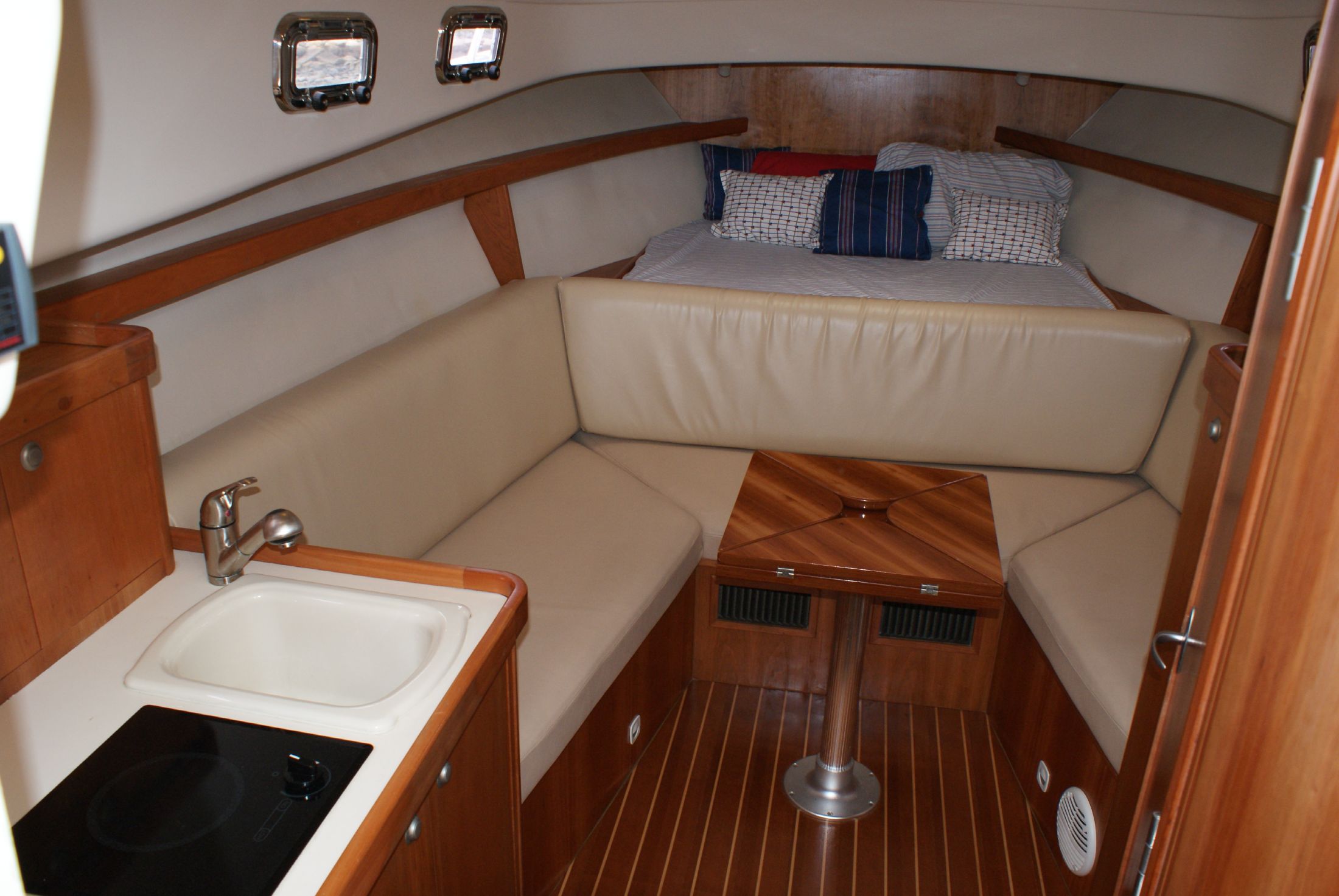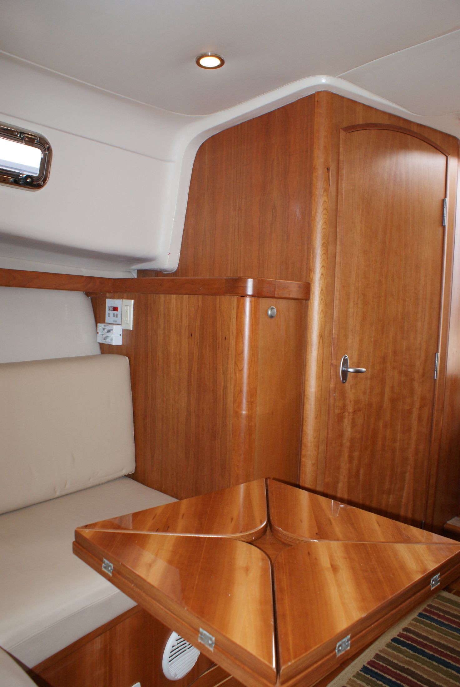 The cherry wood interior is complemented with an off-white overhead and a teak and holly cabin sole.