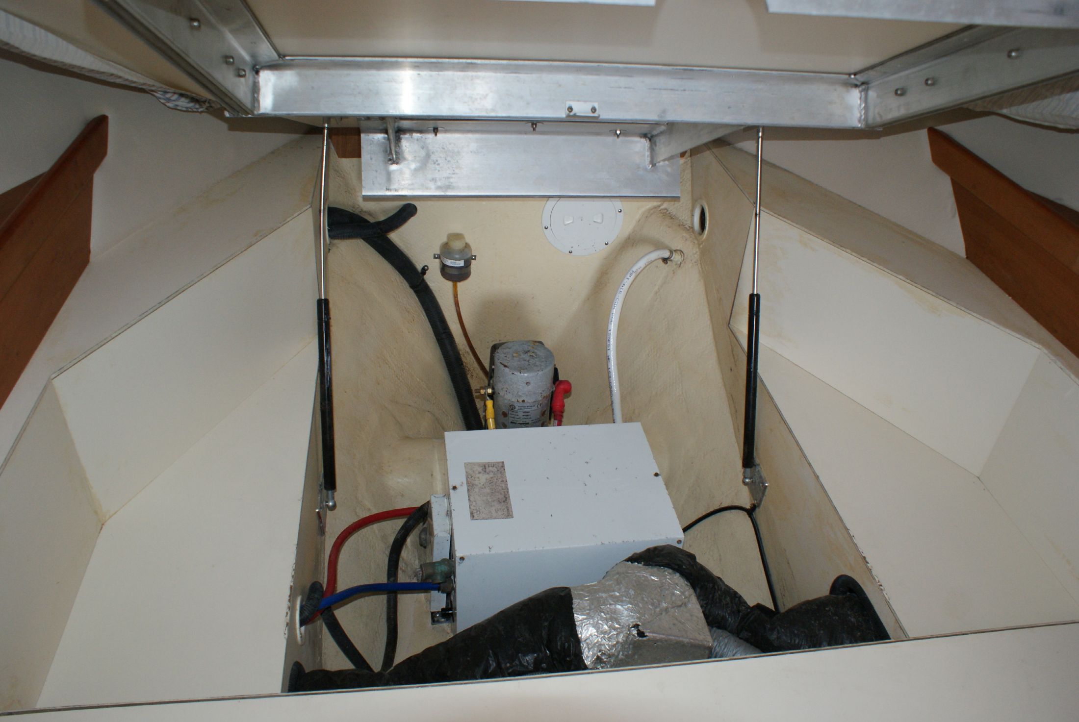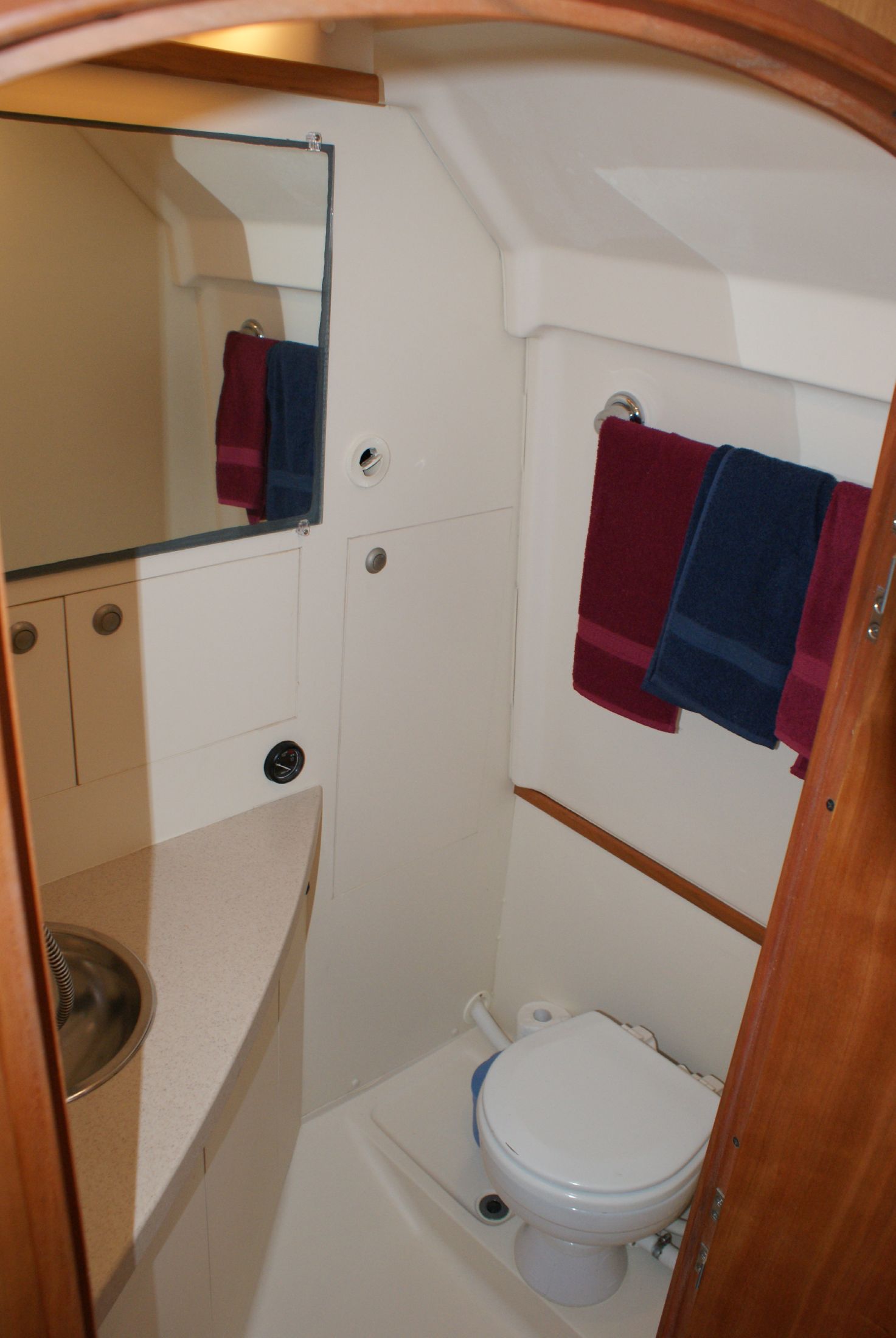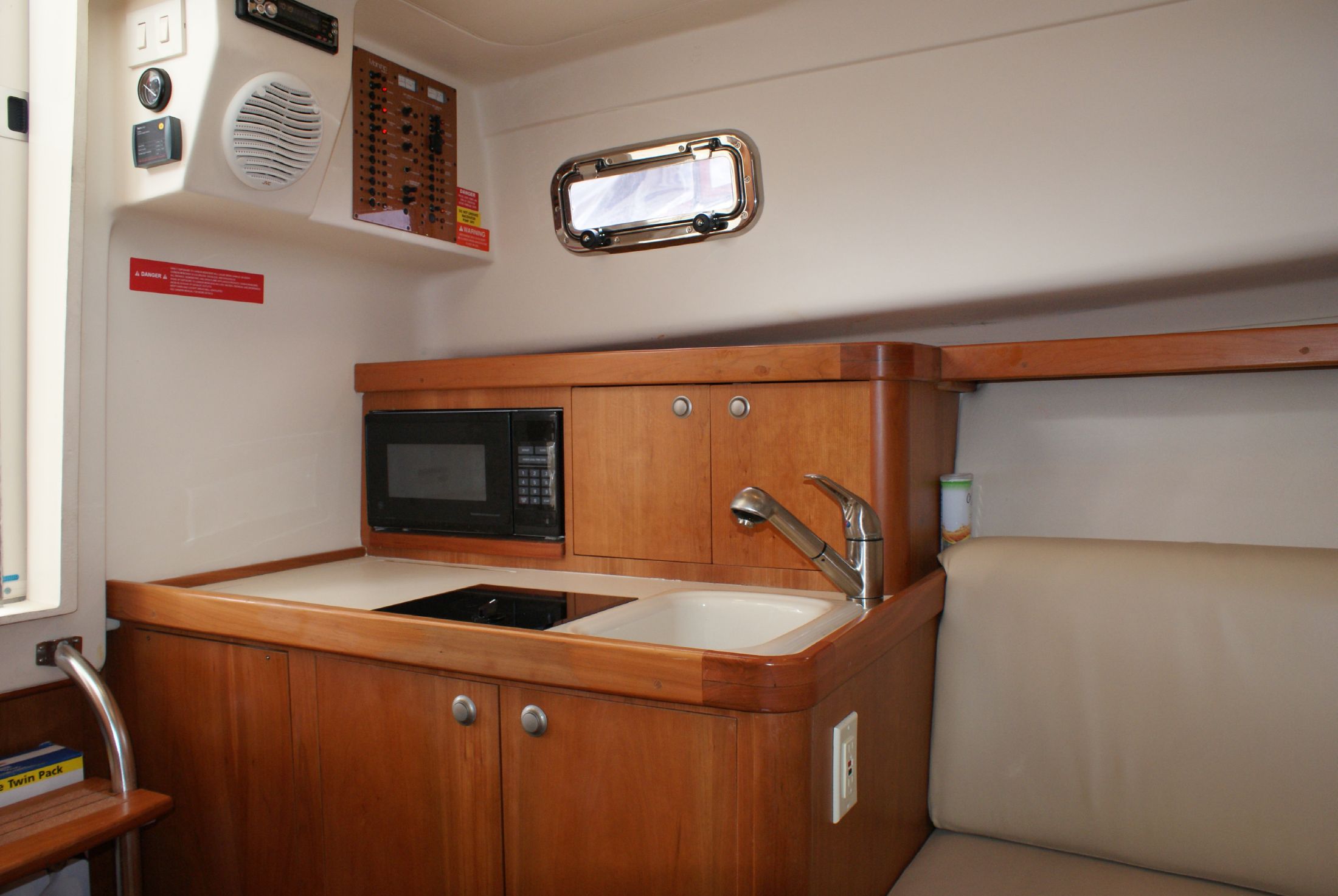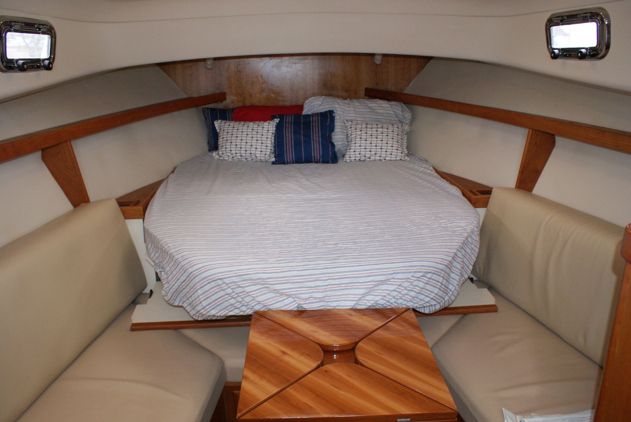 The cherry wood interior is complemented with an off-white overhead and a teak and holly cabin sole.