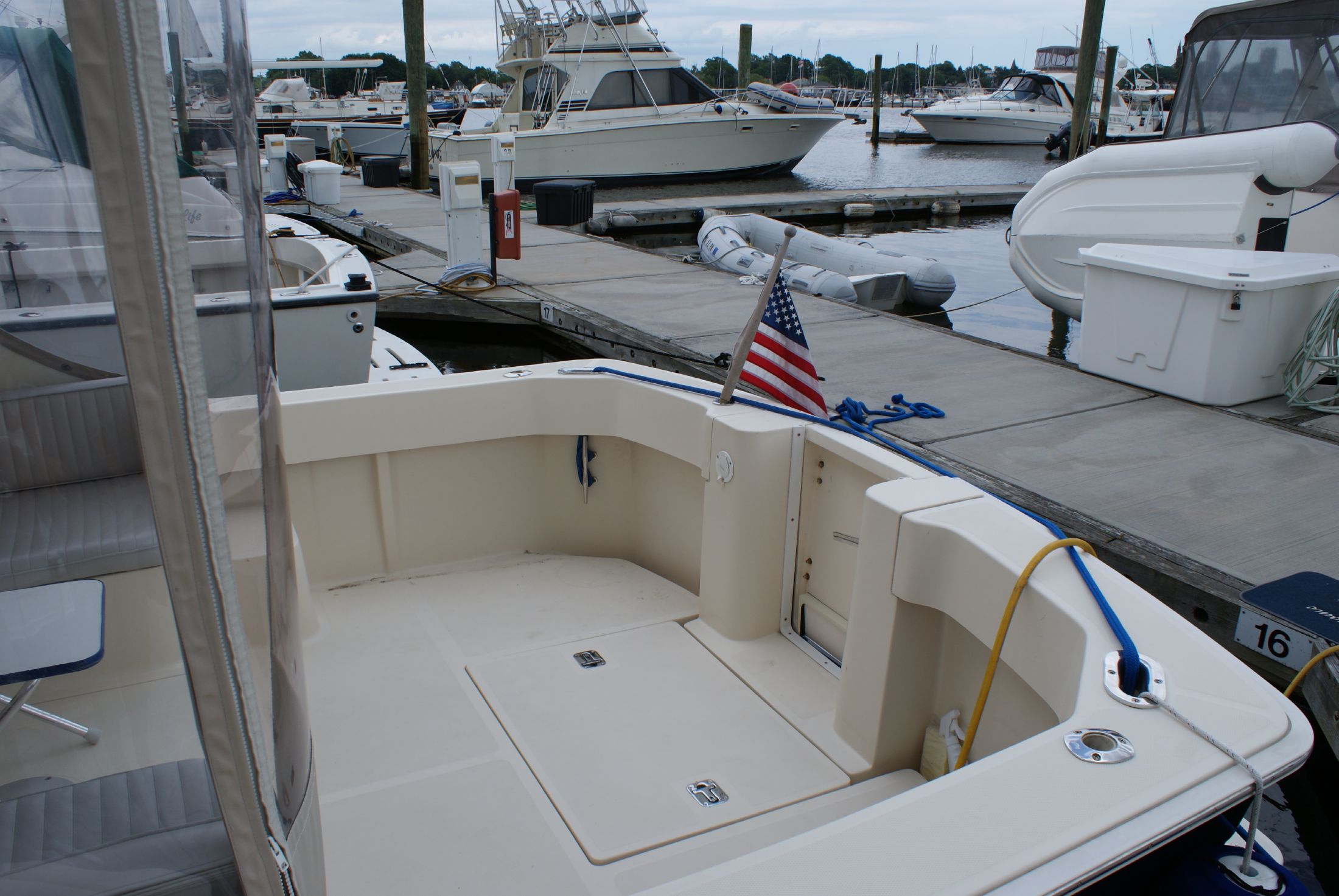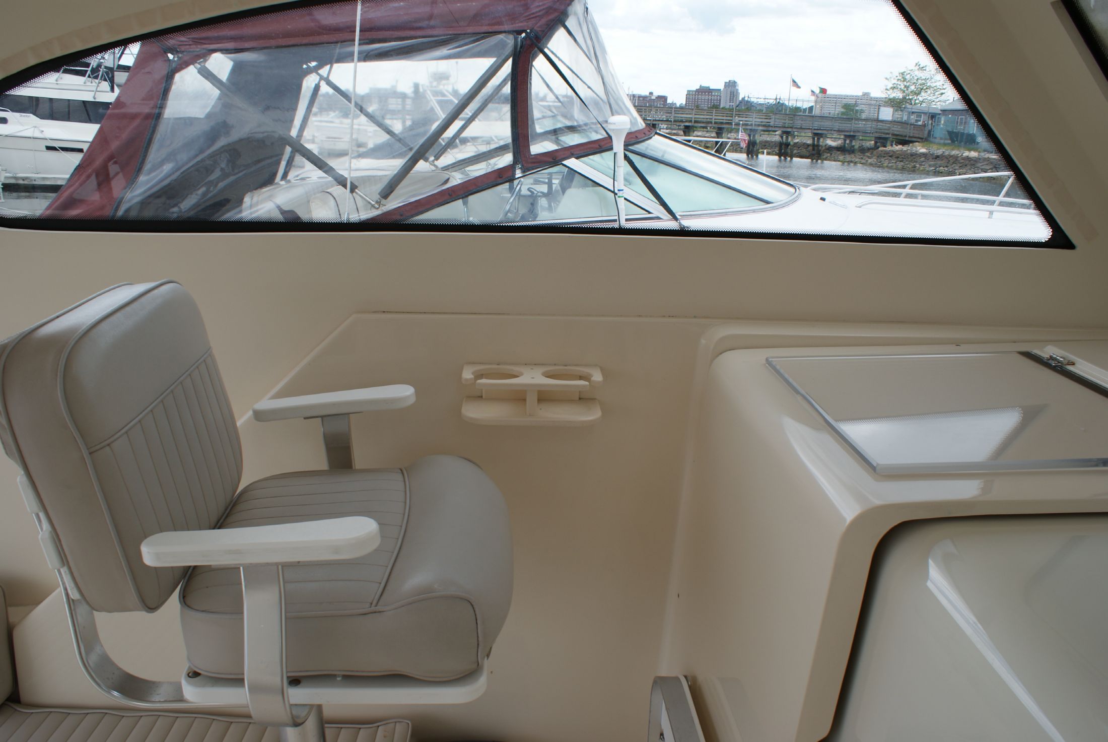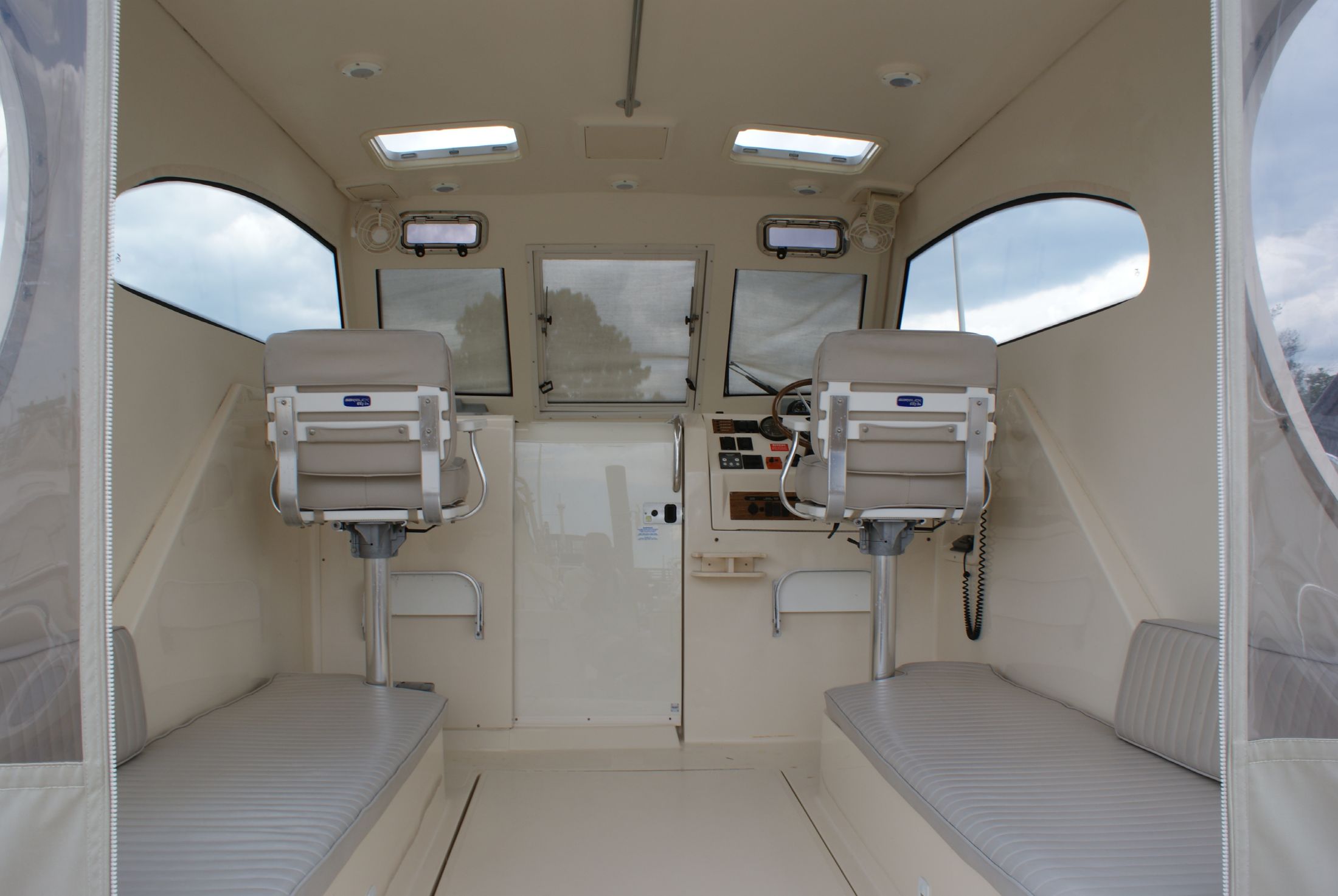 The helm deck has two pedestal chairs, a companion to port and a captain's to starboard, both chairs are at the forward end of the helm deck just aft of the wheel and controls on the starboard side and dash/chart area on the port side. There is additional bench seating aft on either side outboard. The bench seating is generous and allows for additional friends to come along. Access to the engine compartment is on centerline between the bench seating allowing excellant service access. The large windows provide outstanding visibility all around. A canvas enclosure with isenglass closes off the aft area of the bridgedeck.