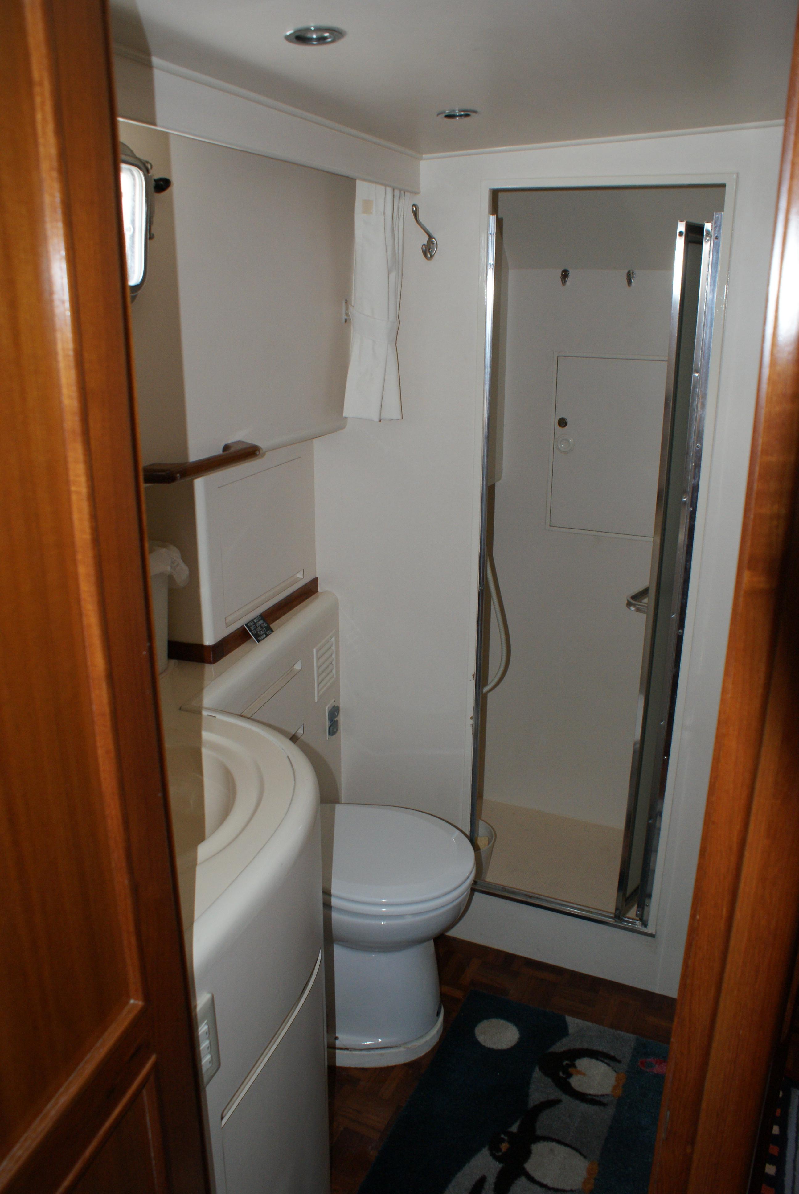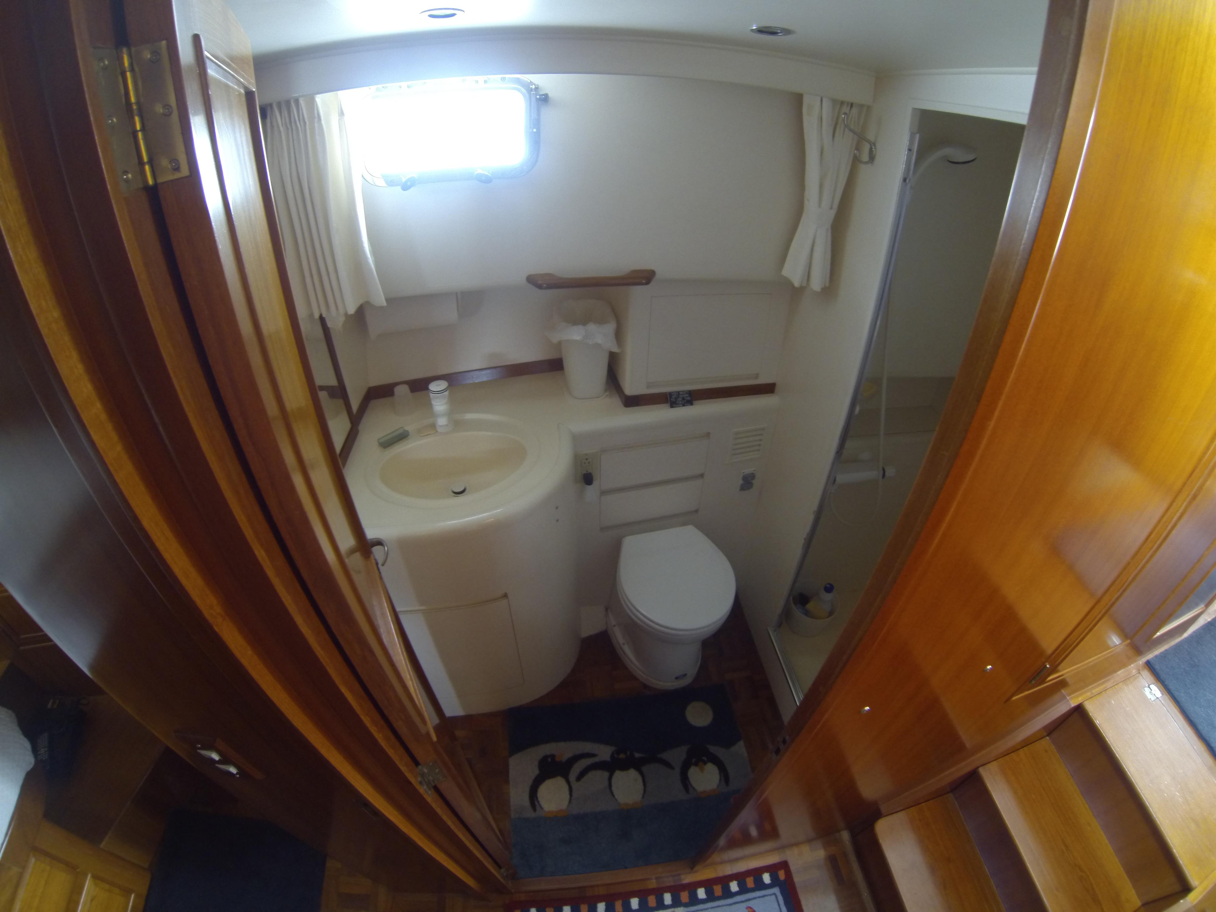 The full head is opposite to starboard and features an Electric Jabsco toilet, and a separate stall shower with folding door.