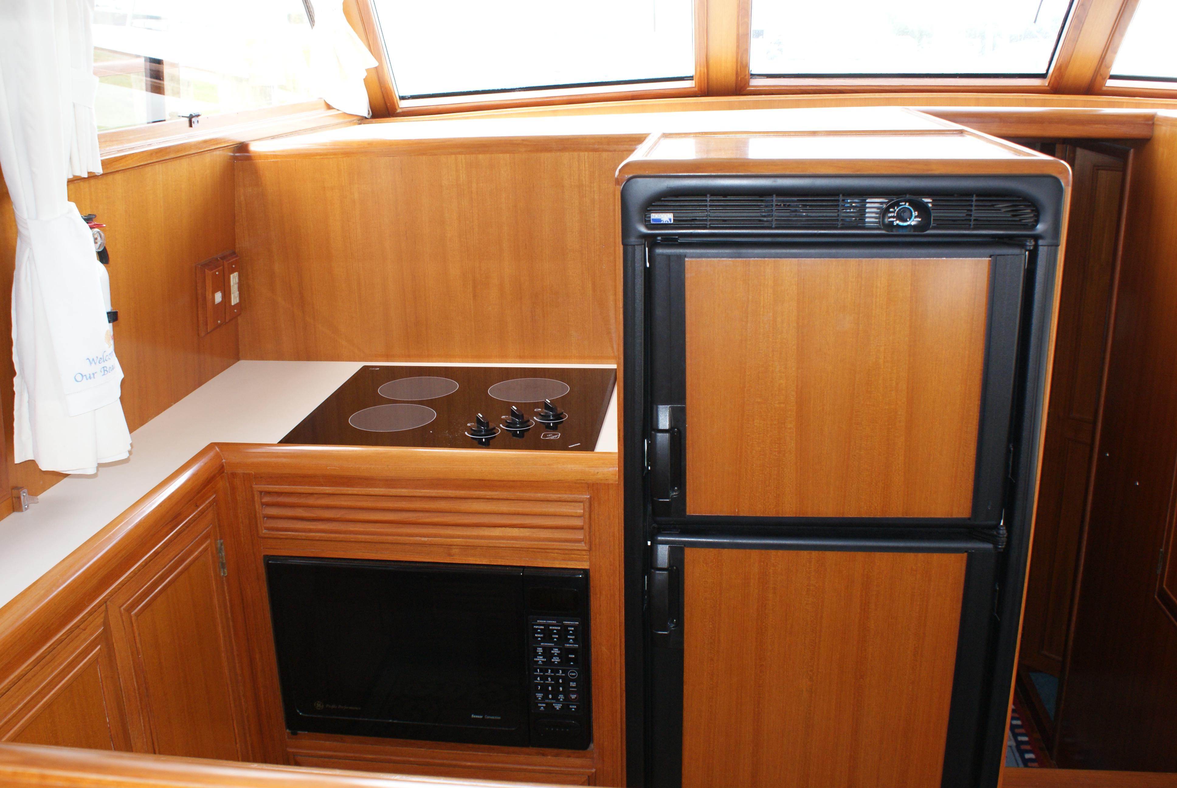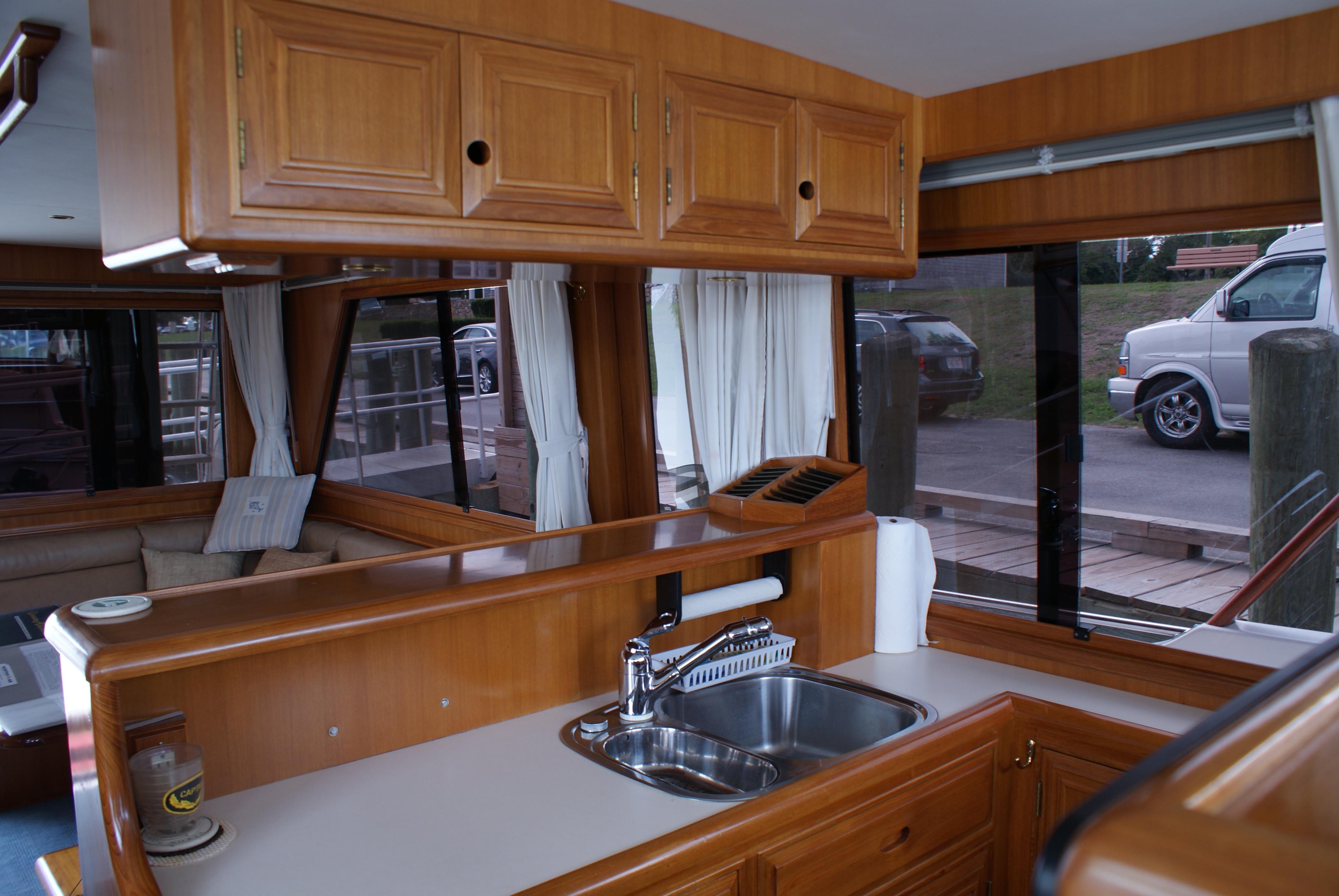 The large U-shaped galley benefits from being forward and has lots of natural lighting. The galley area has large windows for great visibility and natural ventilation. It is indeed an "up galley" and is centrally located in the boat for easy access and entertaining.