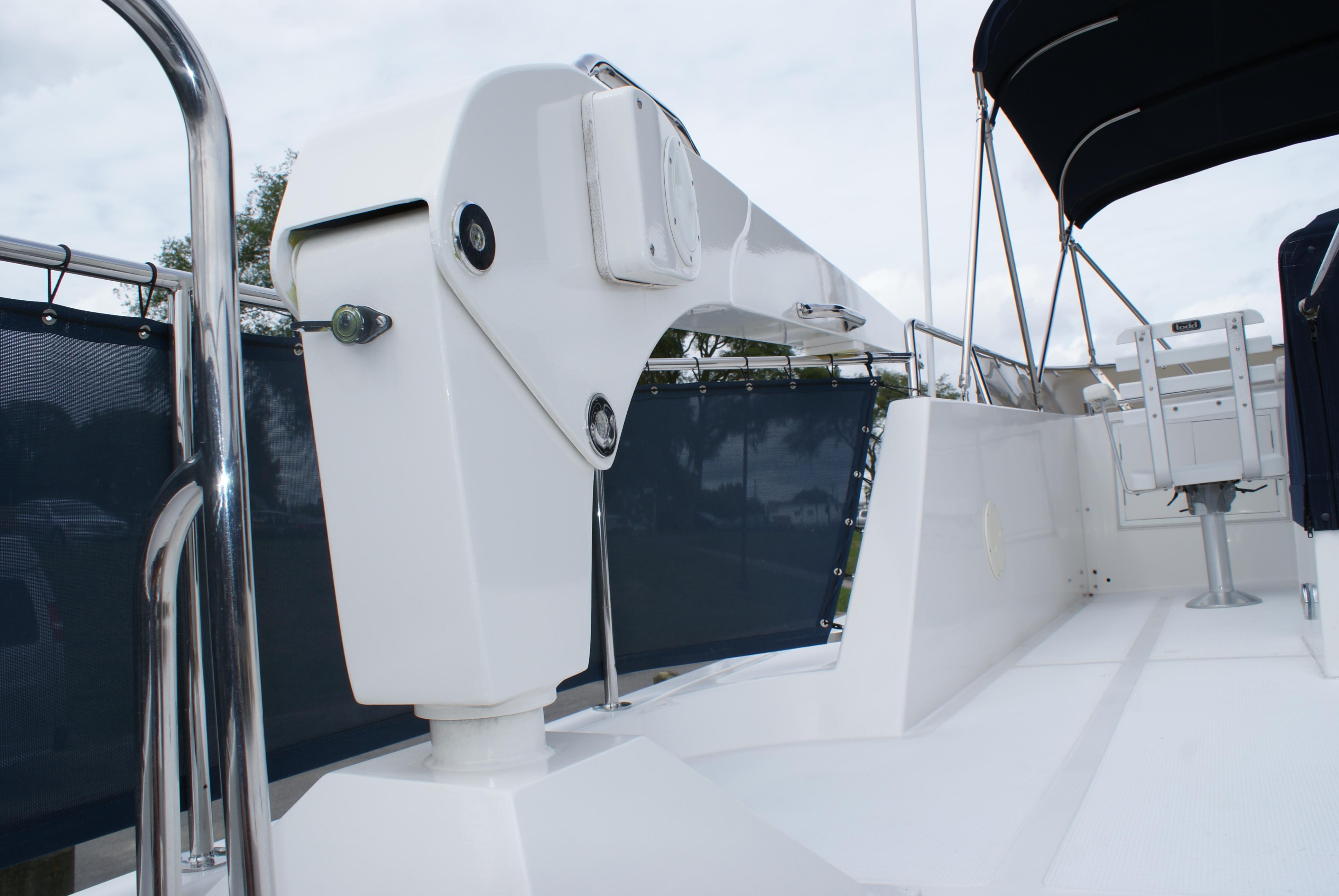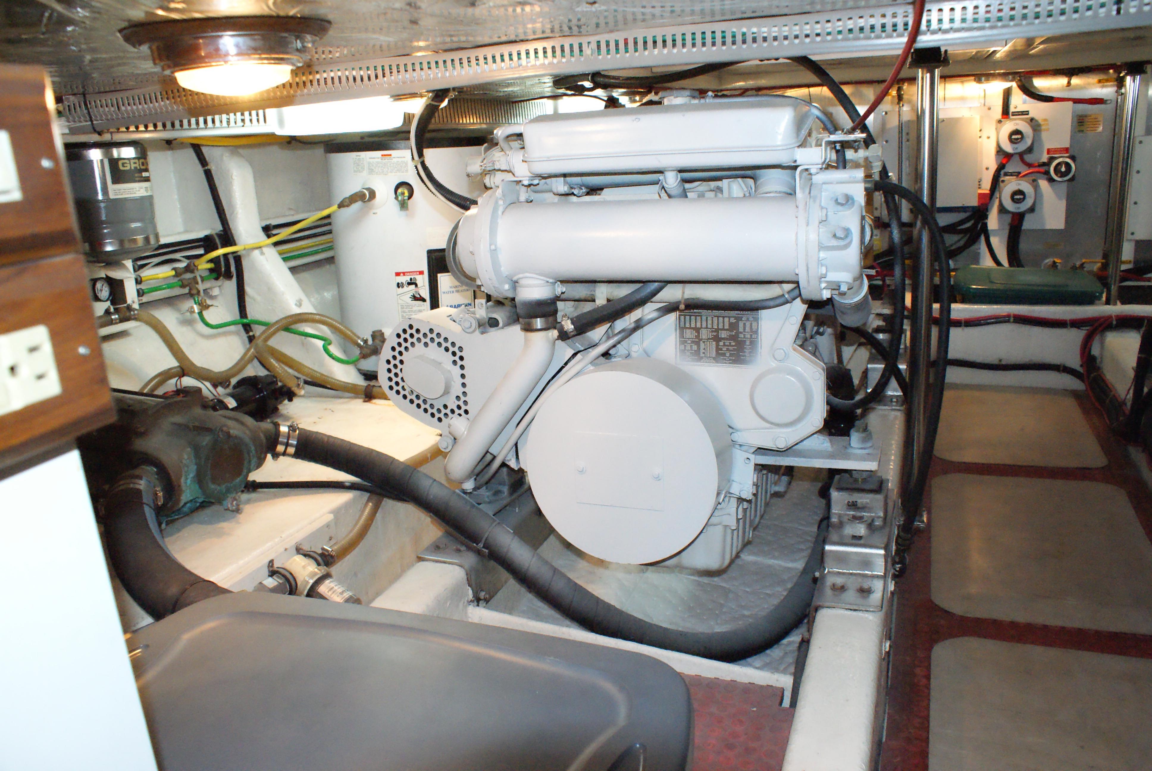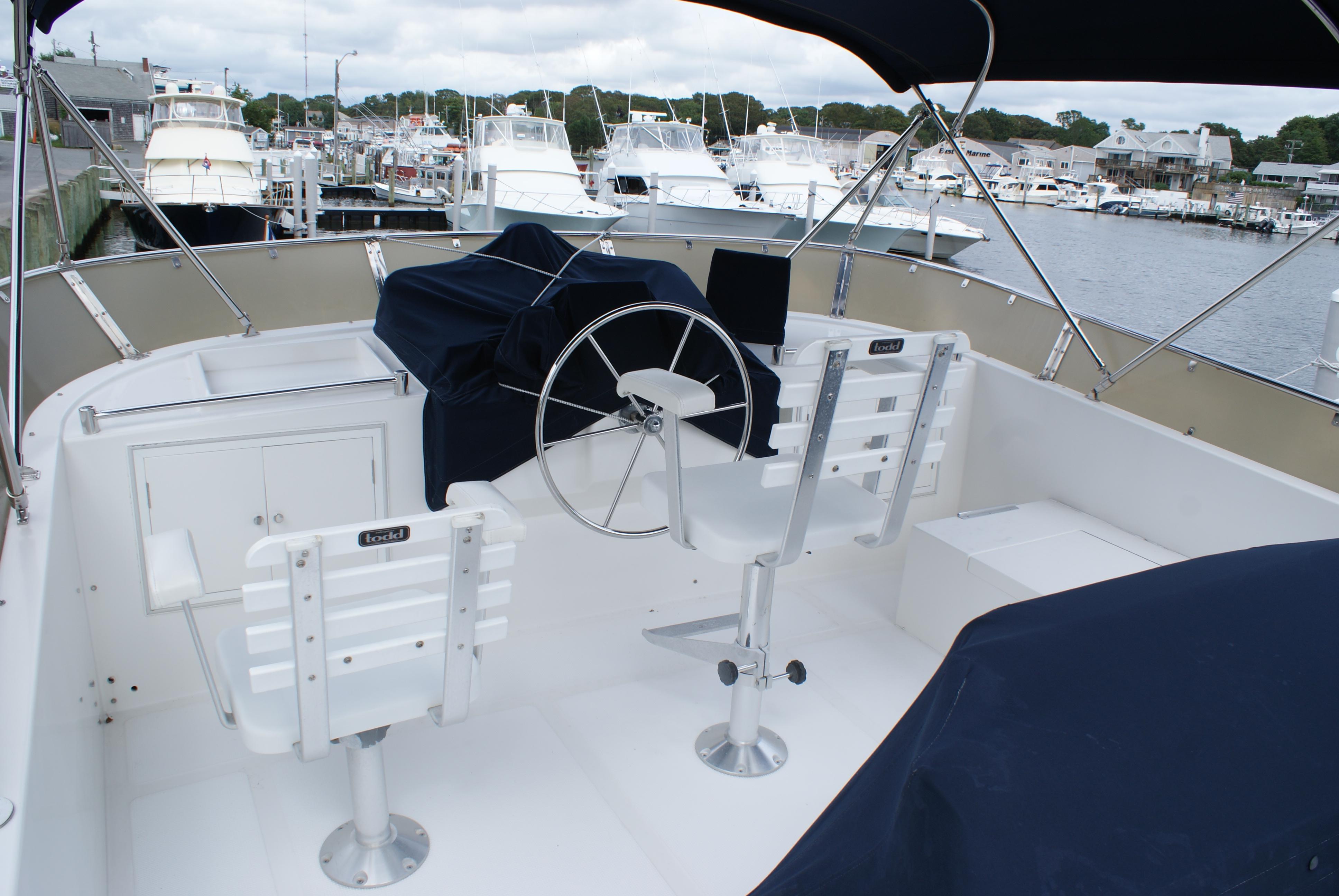 Topside, the extended fly-bridge can accommodate an 11-foot inflatable. Additional features include a full teak interior, radar arch, and a transom door. The 350hp Cats diesels cruise at 17 knots (about 20 knots top).