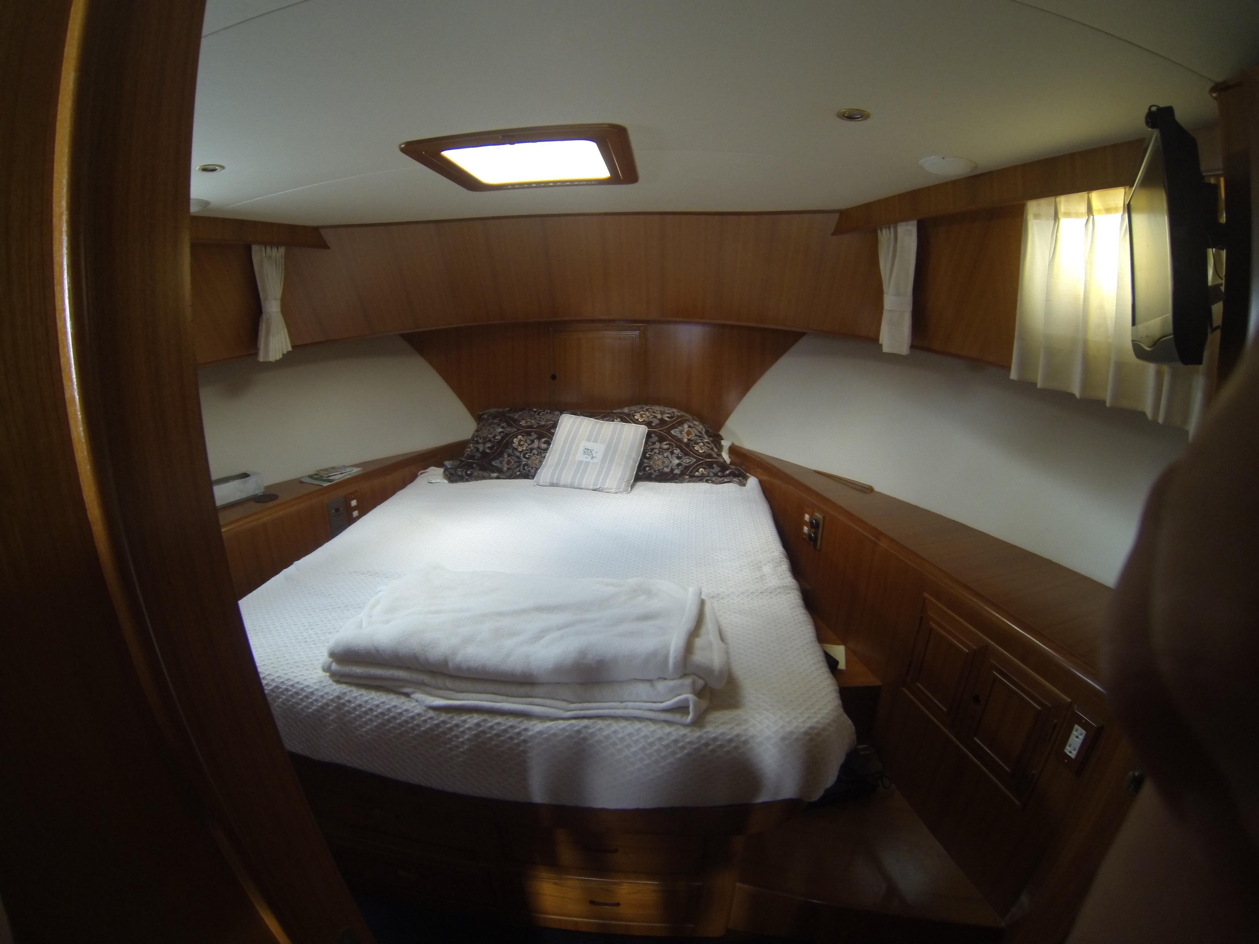 Starting forward is the owner's stateroom with a center-line queen berth with (4) drawers under, overhead ventilation via large deck hatch, additional natural ventilation provided by opening ports, two hanging lockers, additional storage, and a private entry to head aft.