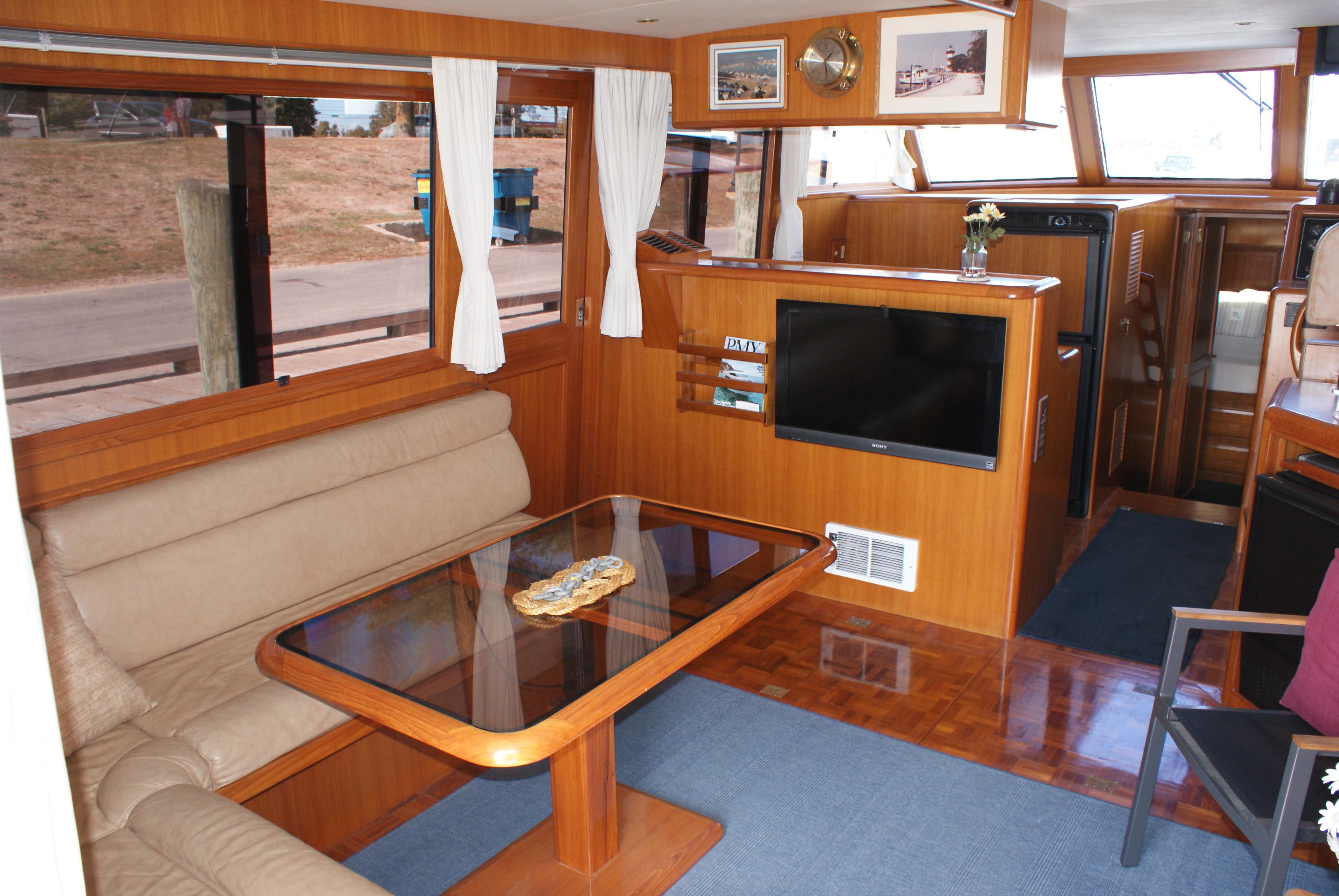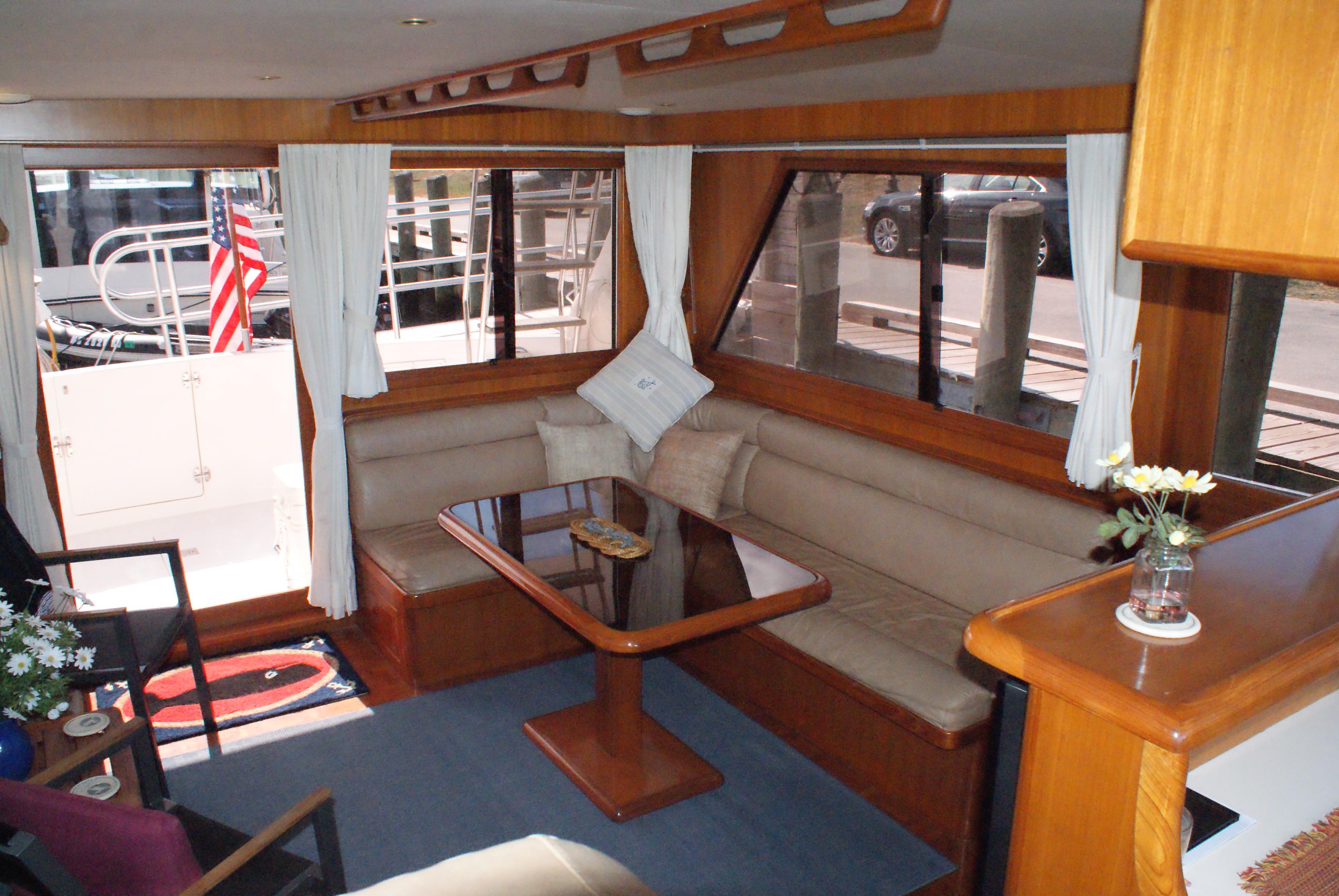 The salon is aft. Bright and airy with opening windows and mini blinds and drape coverings. To starboard is a built in U-line ice-maker, an entertainment center with Tambour doors. To port is the built in L-settee with a high-low table that offers a place for dining or cocktails. Between the salon and the galley is a serving counter and a port side sliding side deck door.