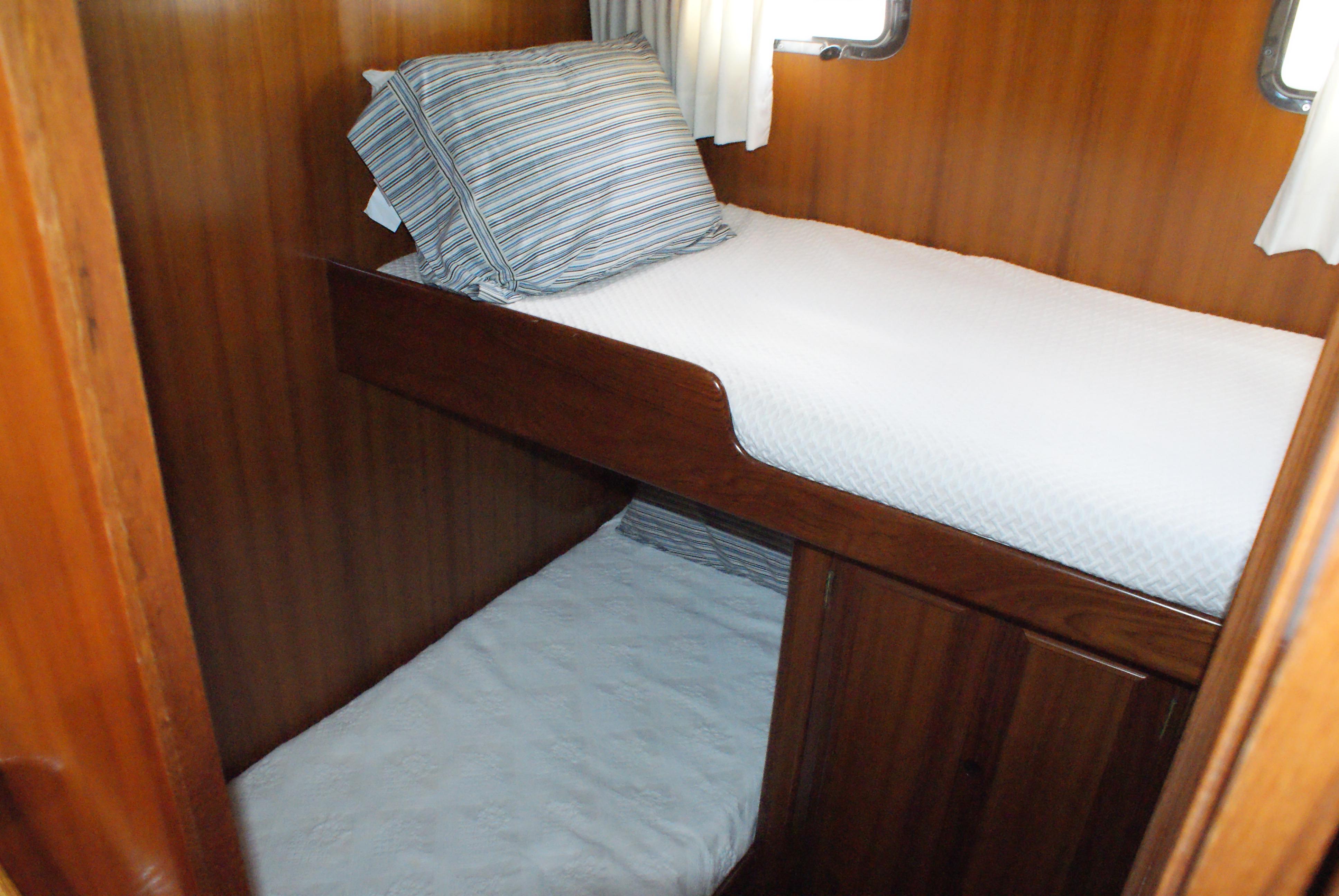To port aft of the master stateroom is the well thought out guest stateroom with over/under berths at right angles to each other, a hanging locker and drawer storage.
