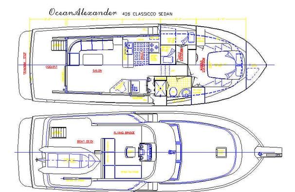 Nimble, quick and responsive handling are features of the Ocean Alexander 426 Classicco Sedan. Its floor plan easily handles a large cockpit and lazarette, two navigational stations, covered walkways, two side docking gates, an expansive salon / galley, two staterooms, and one head. This sedan model features a semidisplacement hull with a flat stern section for better speed, but it also provides enough keel for good seakeeping ability, a protected prop, and a no-nonsense spray chine for a dry ride on deck while at full throttle. Her standard galley-up floorplan includes two staterooms with a centerline queen berth in the owner's cabin and single berths in the guest stateroom. The head comes with a separate stall shower, and a sliding deck door at the lower helm provides convenient access to the foredeck. The salon dimensions of the 426 Sedan are quite generous in spite of the wide side decks. In a departure from most sedan layouts, there's a second portside deck door abaft the galley in the salon.