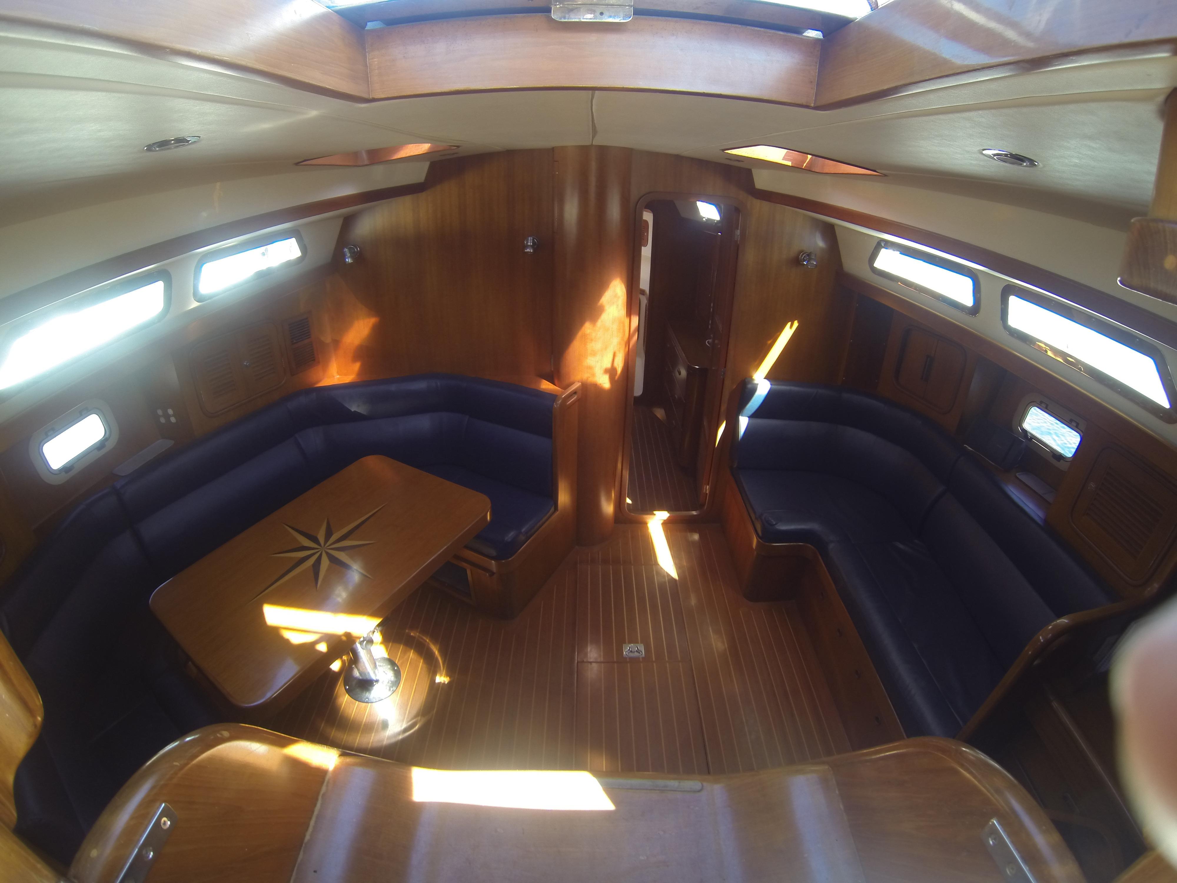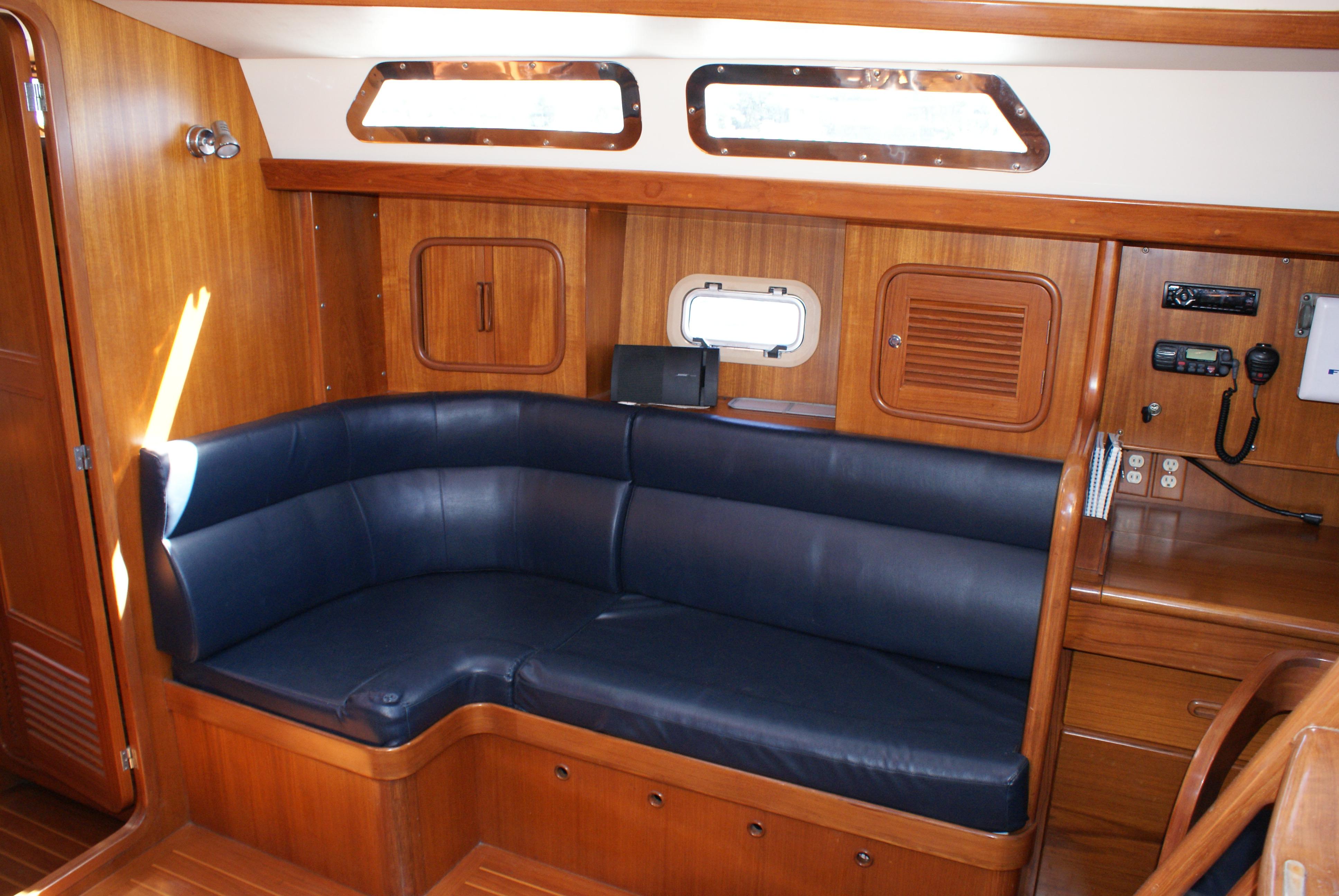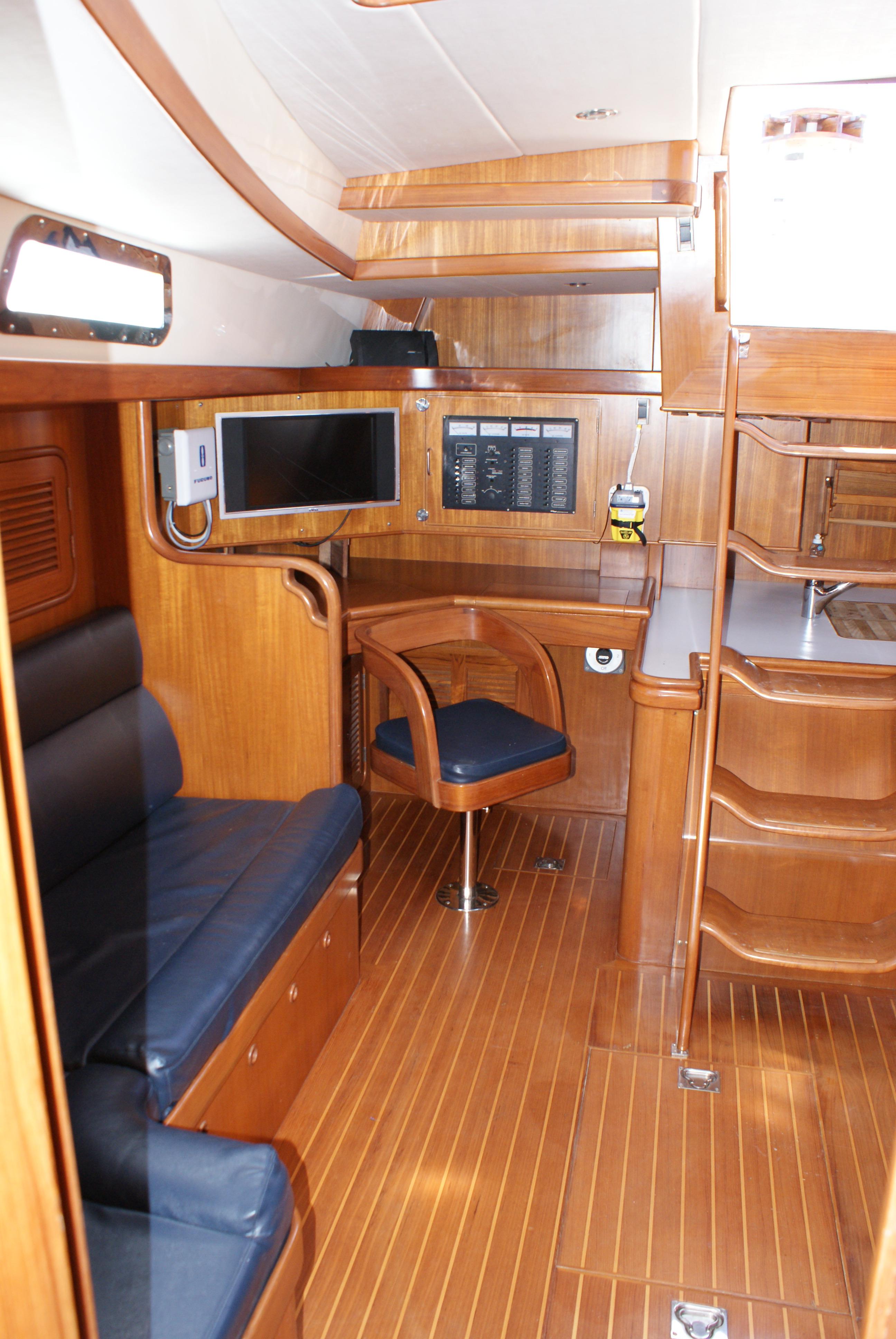To starboard is an "L"-shaped settee. Followed, just aft by a nice large navigation station.