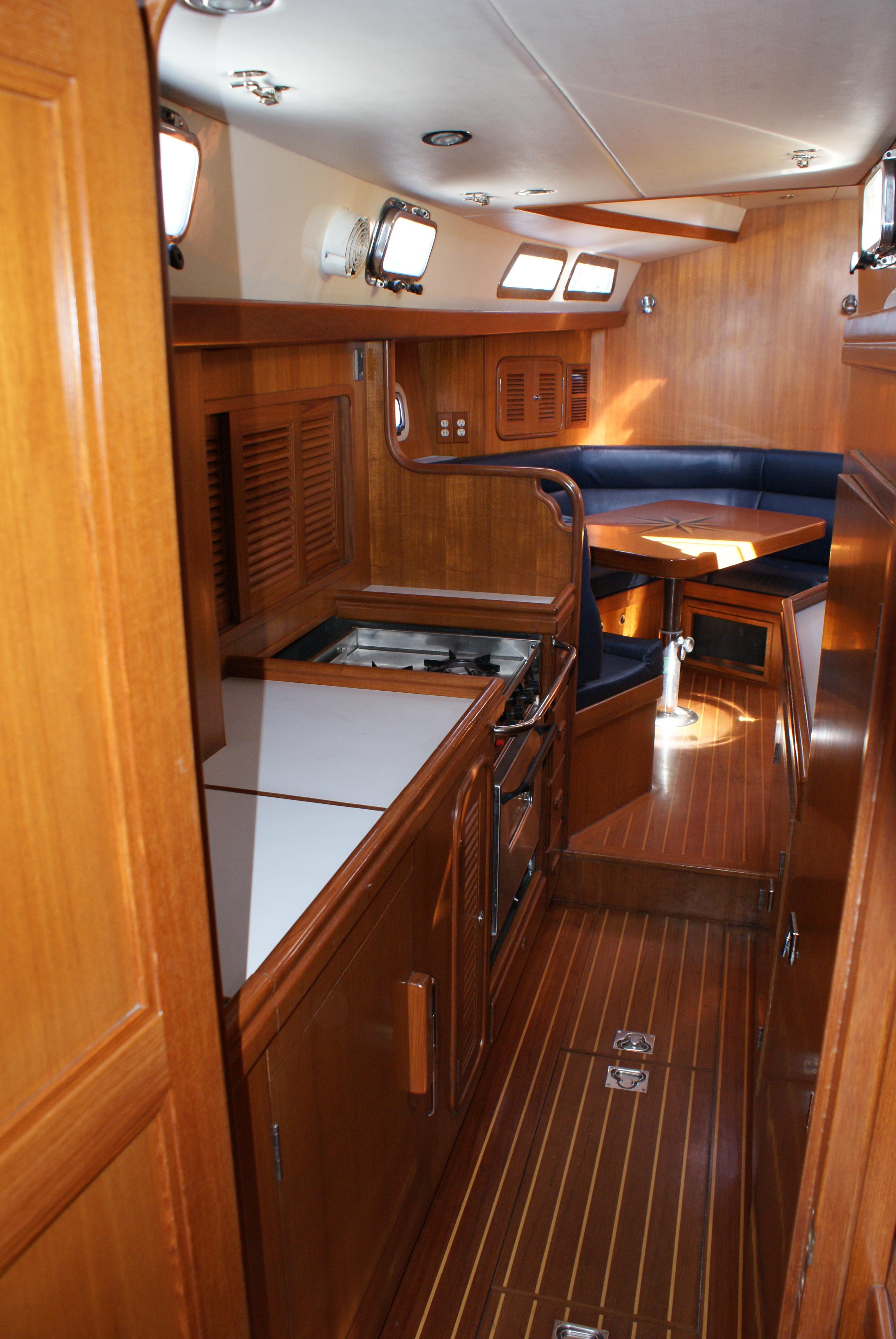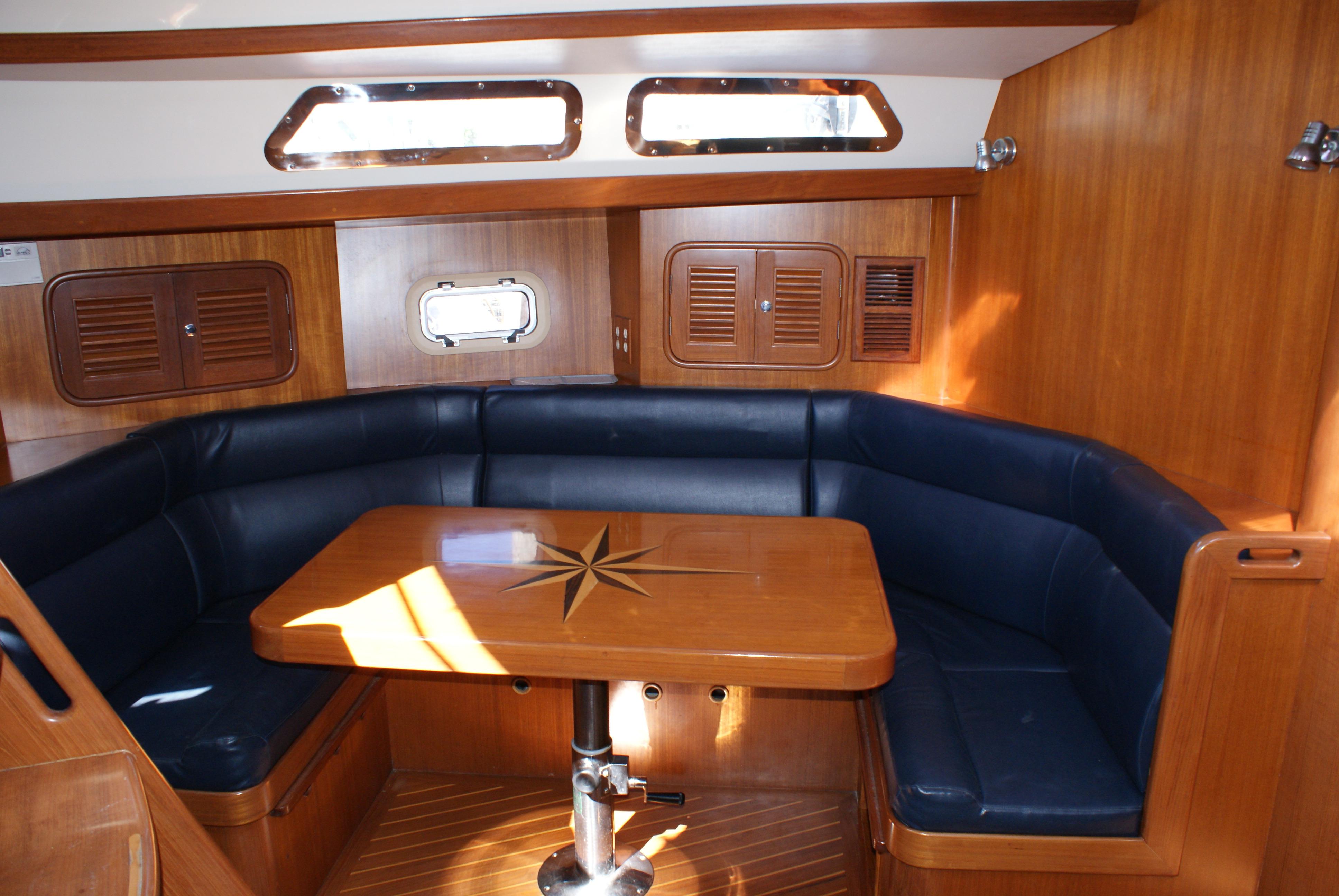 The main salon is accessed from the cockpit via the companionway with teak steps. Storage in the salon is above, behind and below settees. A "U"-shaped settee to port and a "High/Low" dining table that converts to a double berth. The salon area features two in hull opening ports, a factory upgrade, and two overhead hatches that provide great natural light and ventilation.