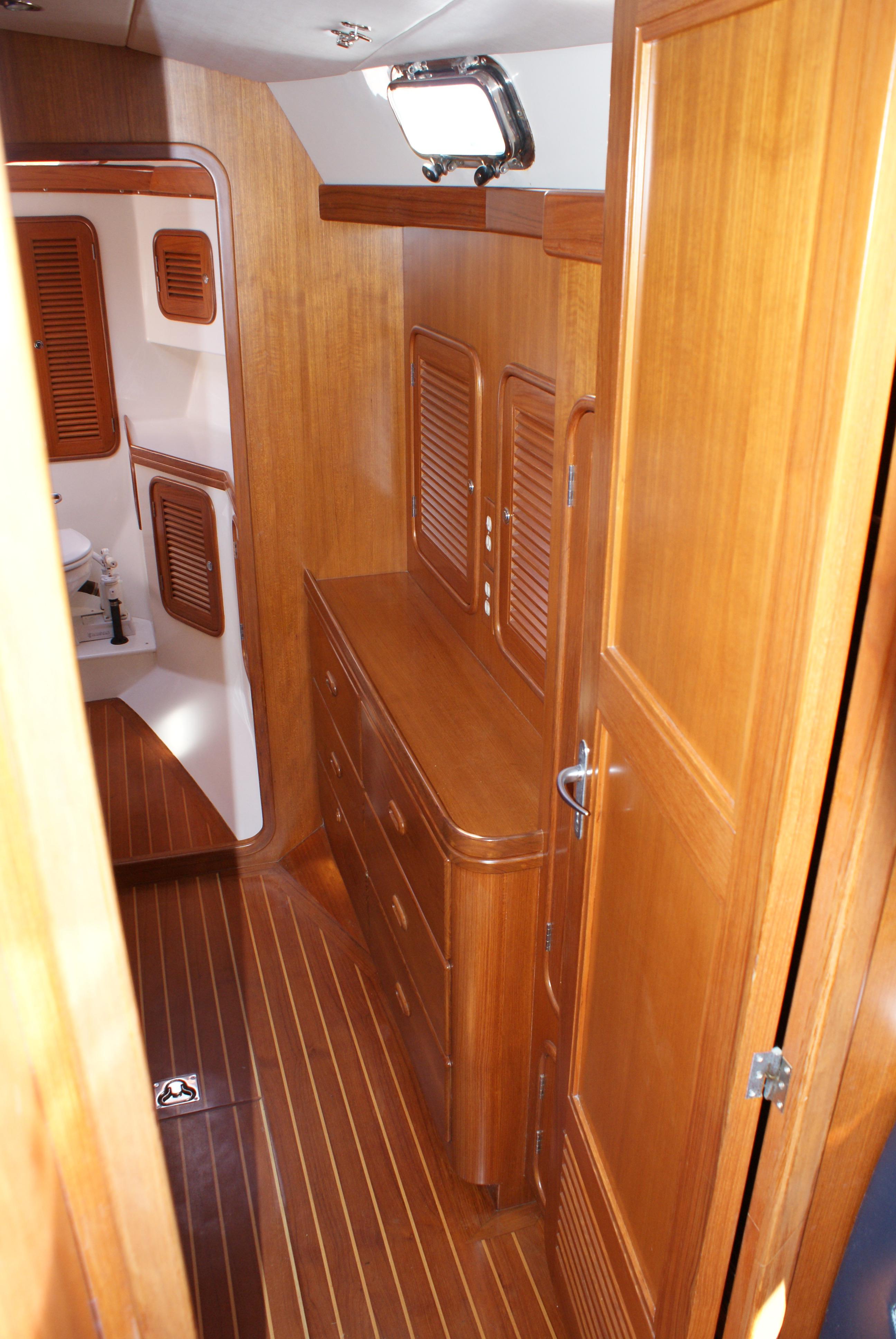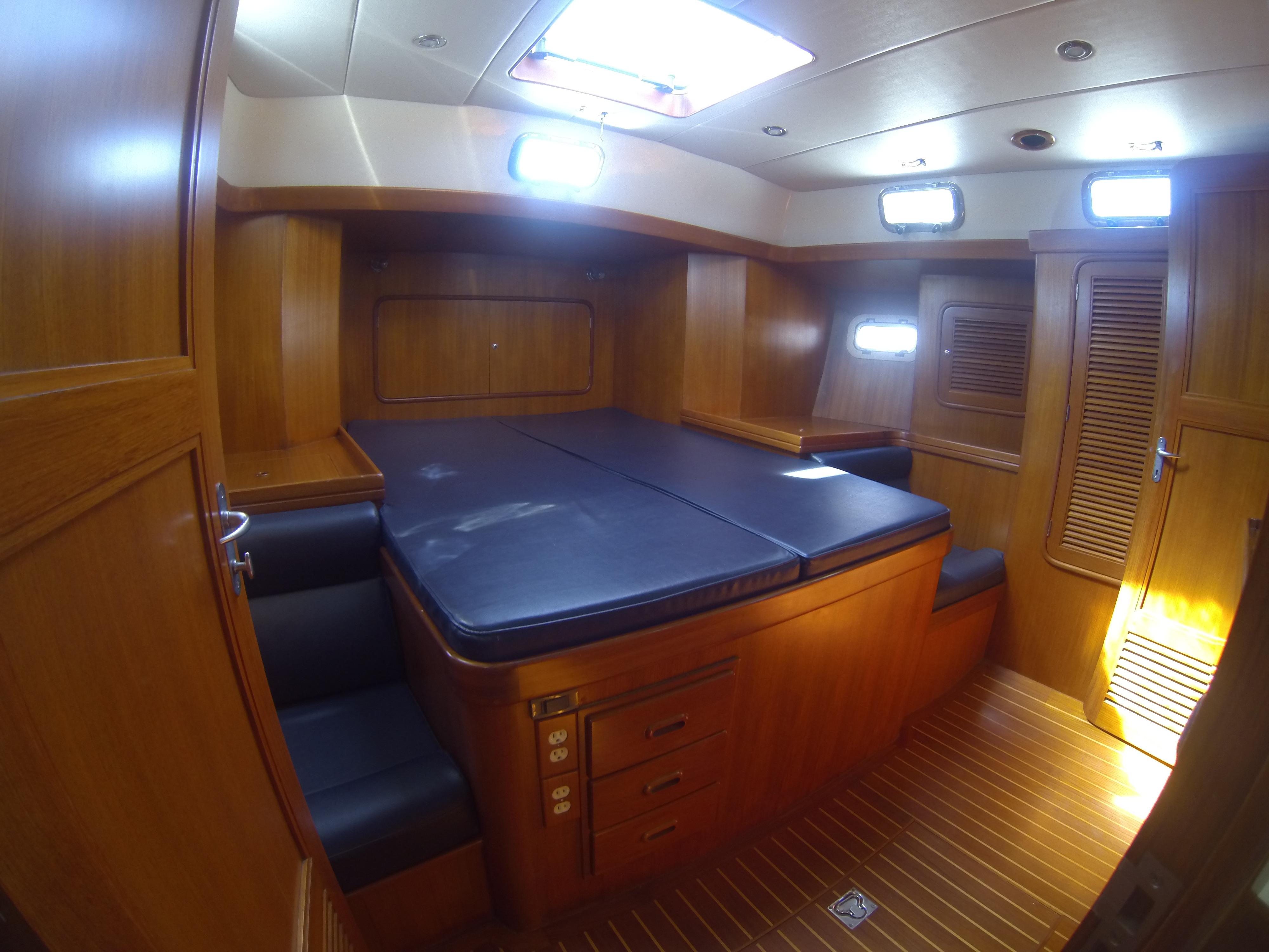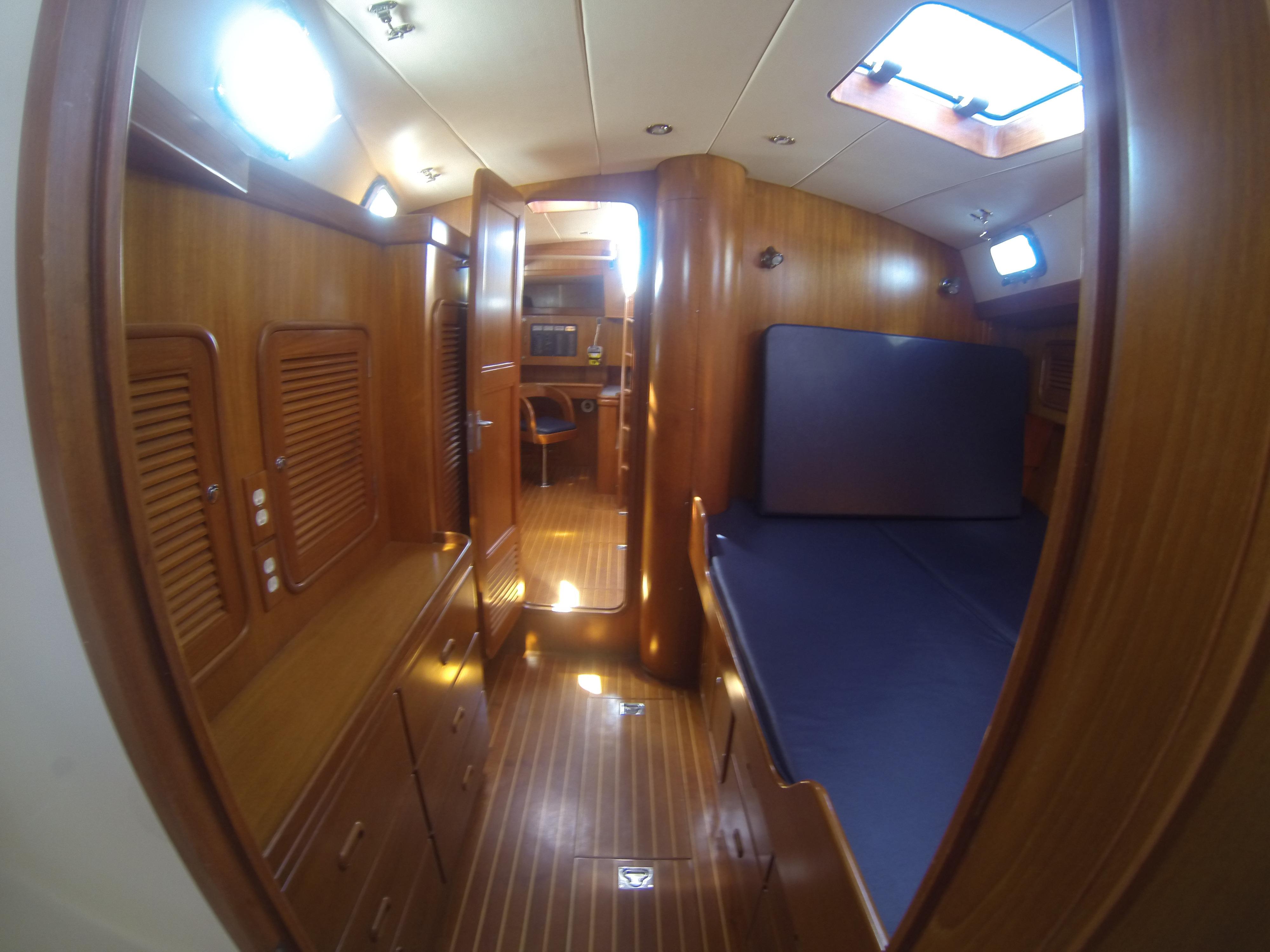 Aft of the head is the forward stateroom. The port side Pullman-Berth is large queen sized and comfortable. This forward stateroom has storage lockers under the berth with hanging locker and copious drawer storage starboard. A large hatch overhead hatch and four opening ports provide excellent ventilation. The locker has also been wired to accommodate a combination washer dryer.