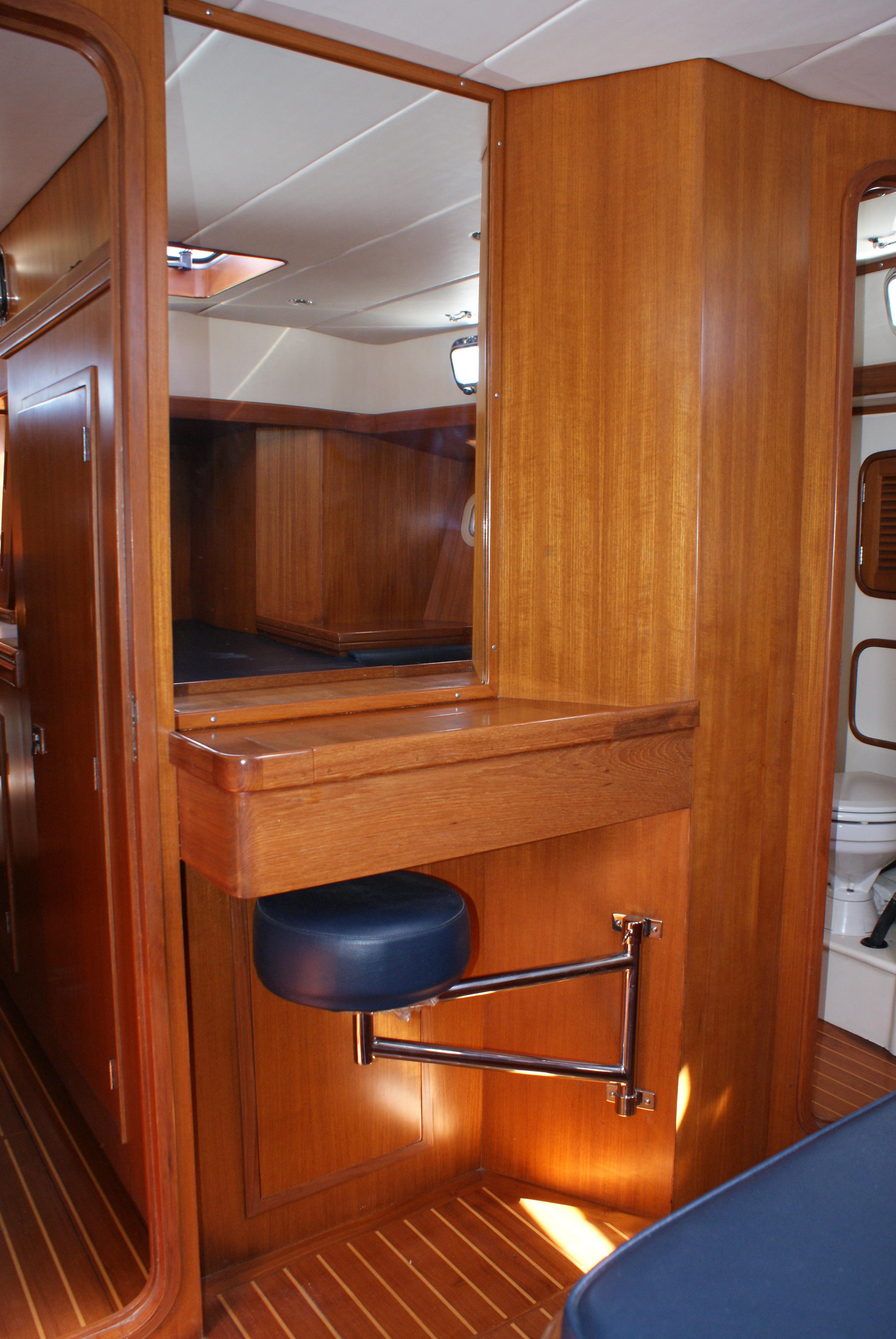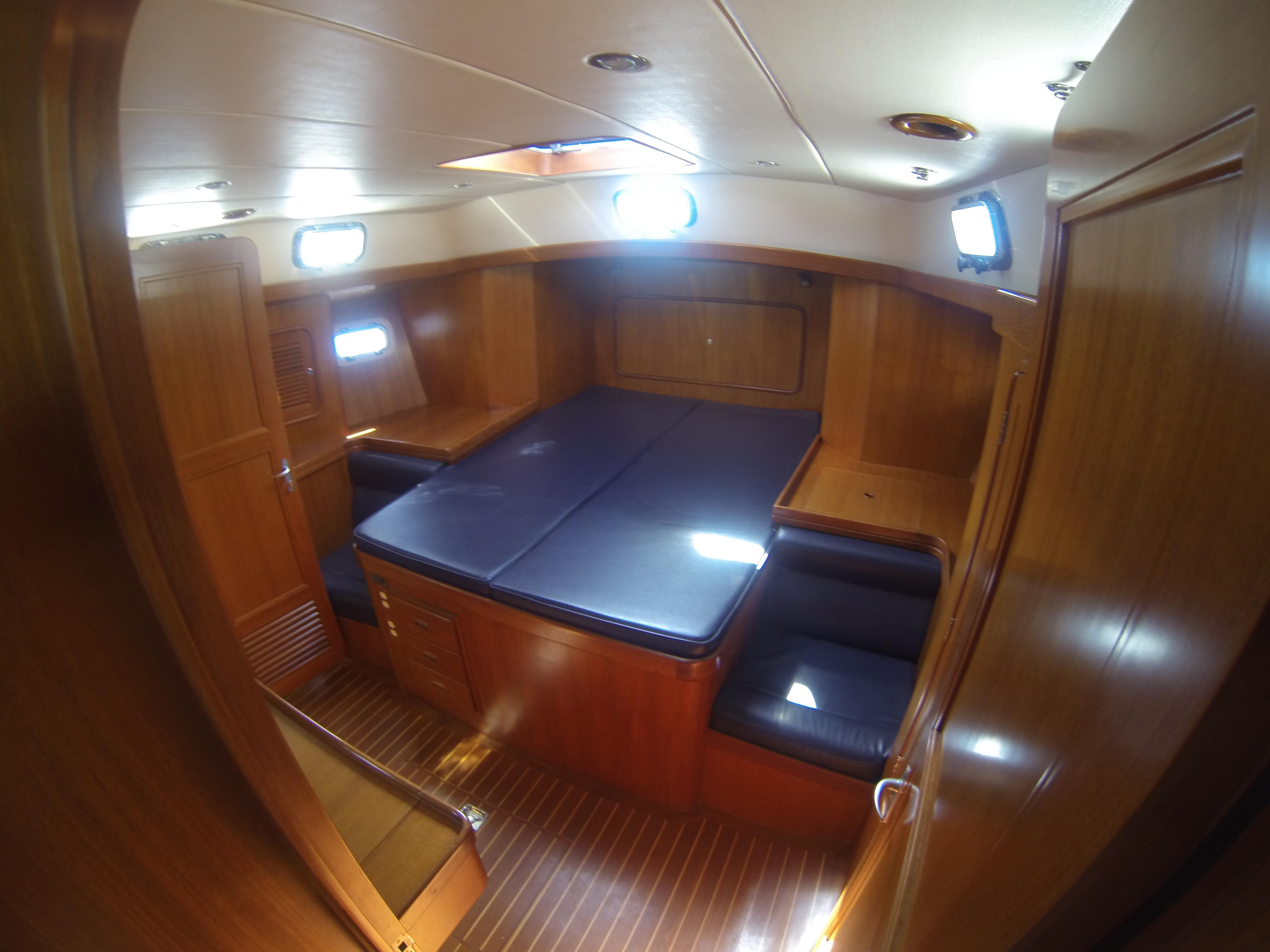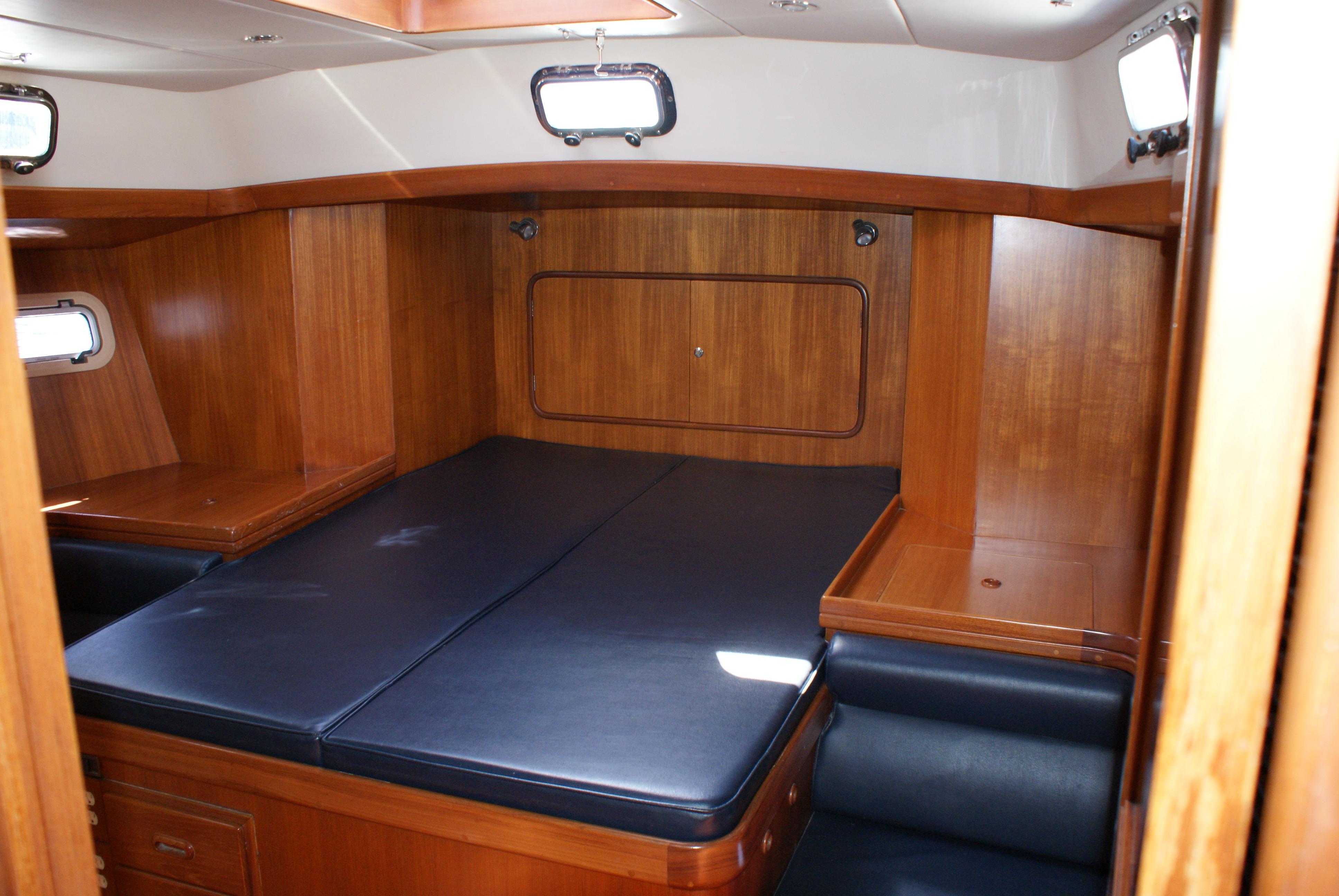 Aft of the head is the forward stateroom. The port side Pullman-Berth is large queen sized and comfortable. This forward stateroom has storage lockers under the berth with hanging locker and copious drawer storage starboard. A large hatch overhead hatch and four opening ports provide excellent ventilation. The locker has also been wired to accommodate a combination washer dryer.