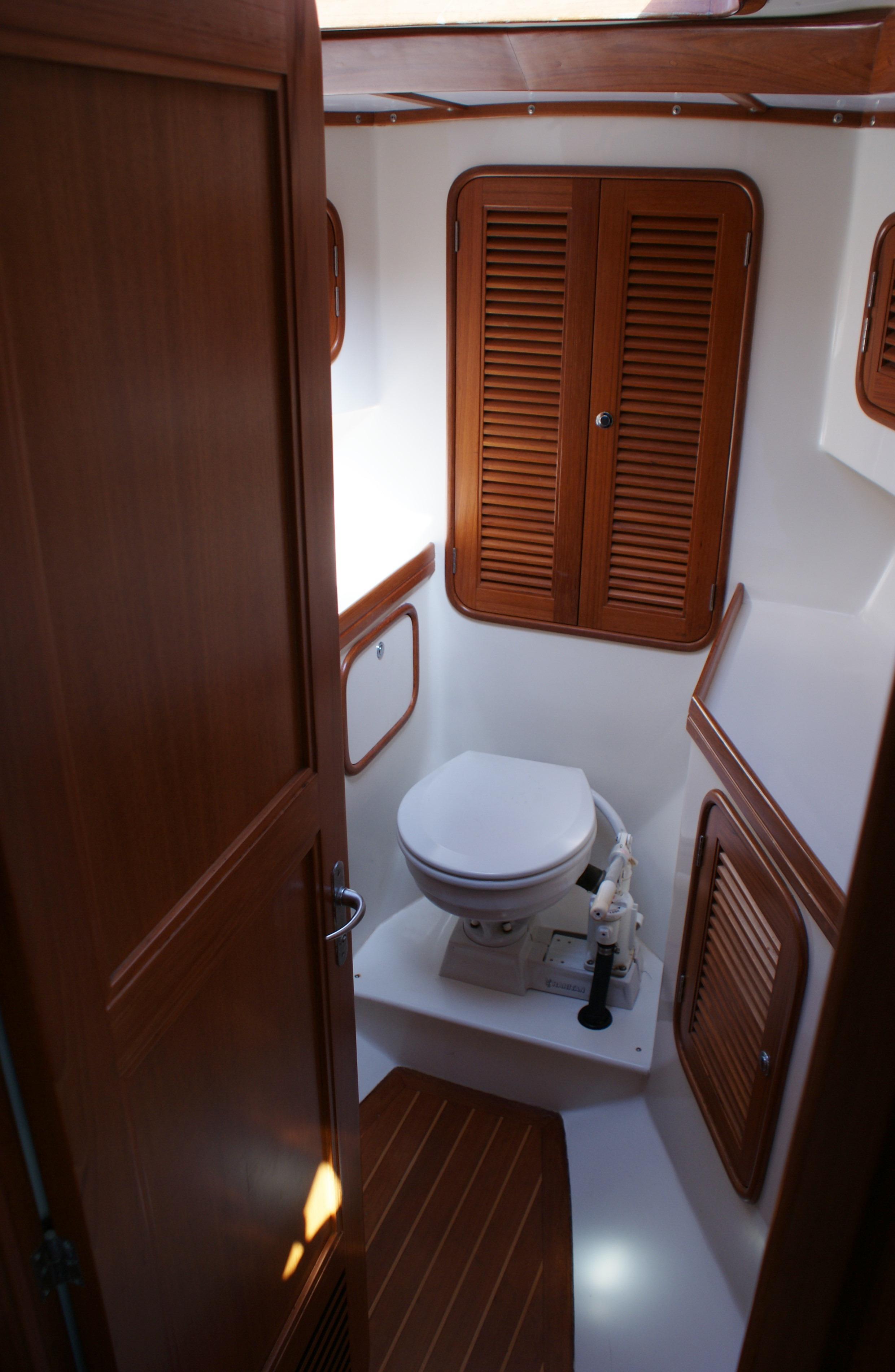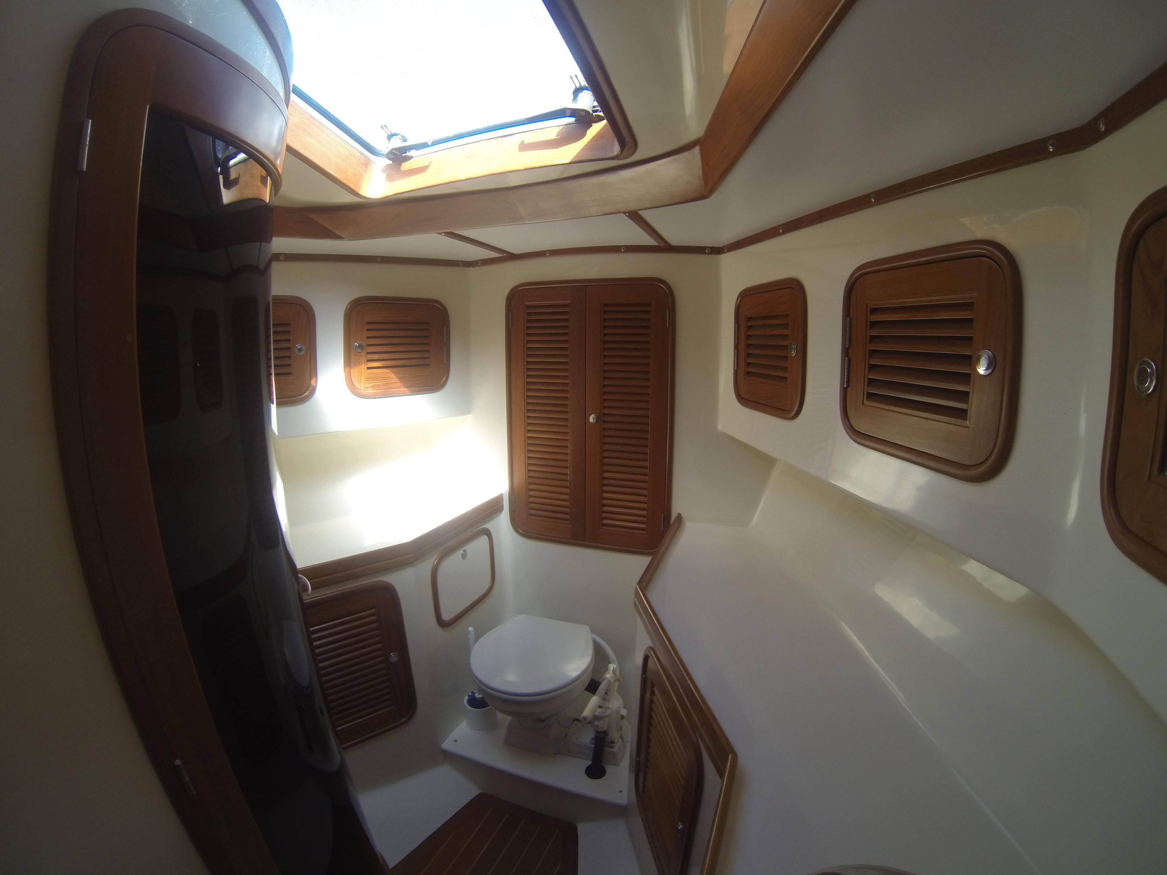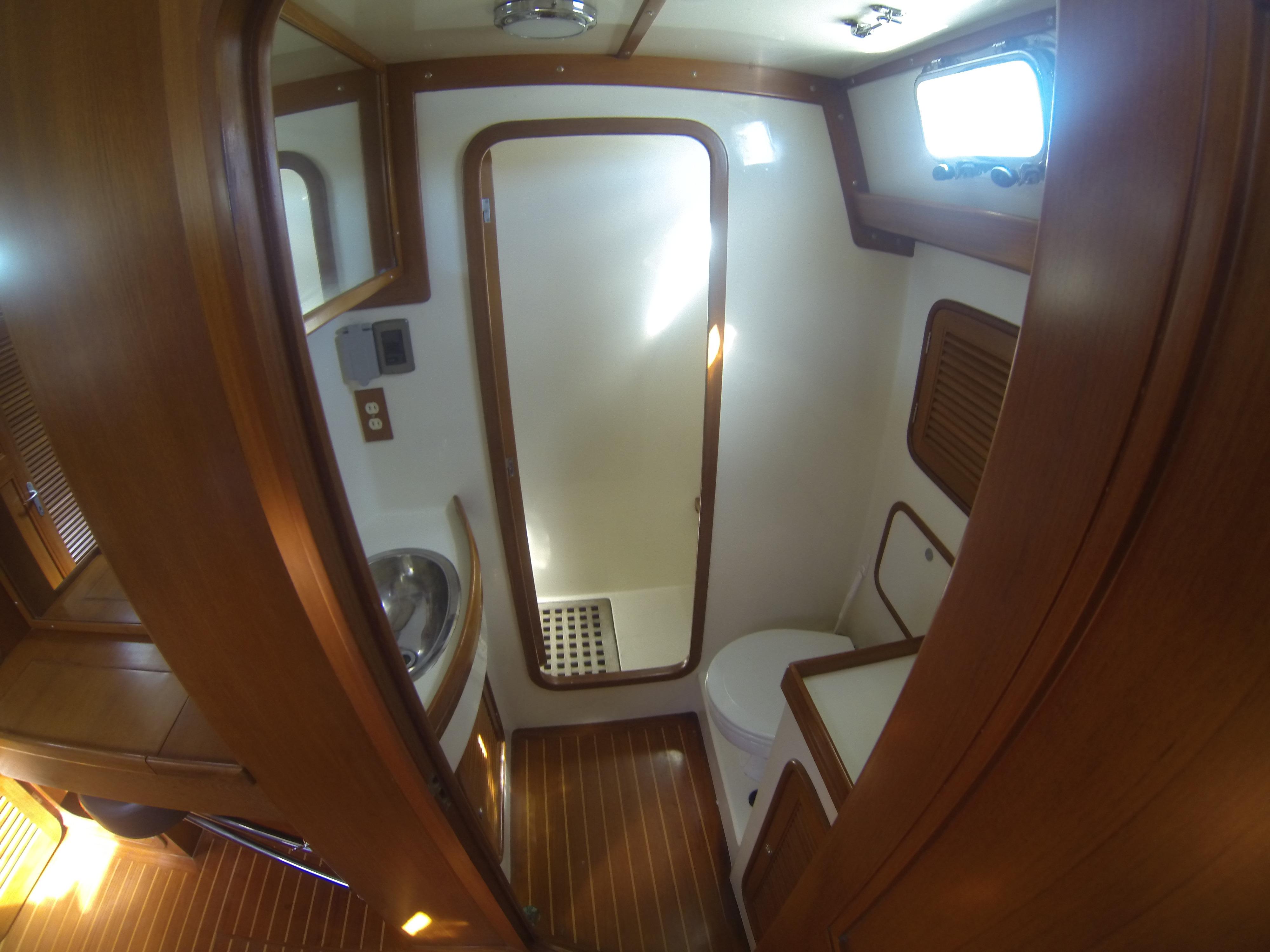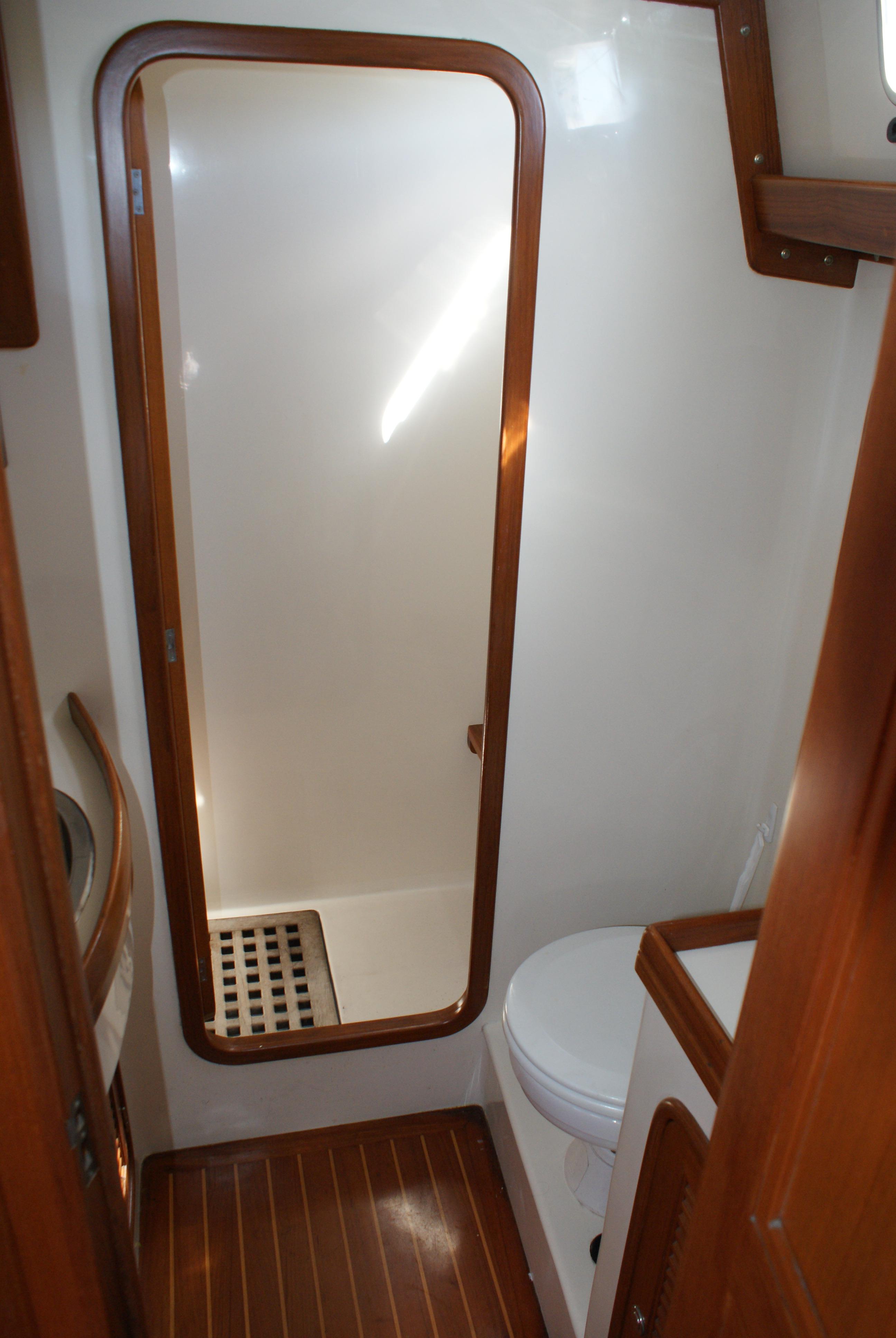 In the bow and forward of a hanging locker, is a large anchor locker, which is accessed from the forward head. There are storage lockers port and starboard. The roomy forward head includes a manual head and a fully enclosed shower.