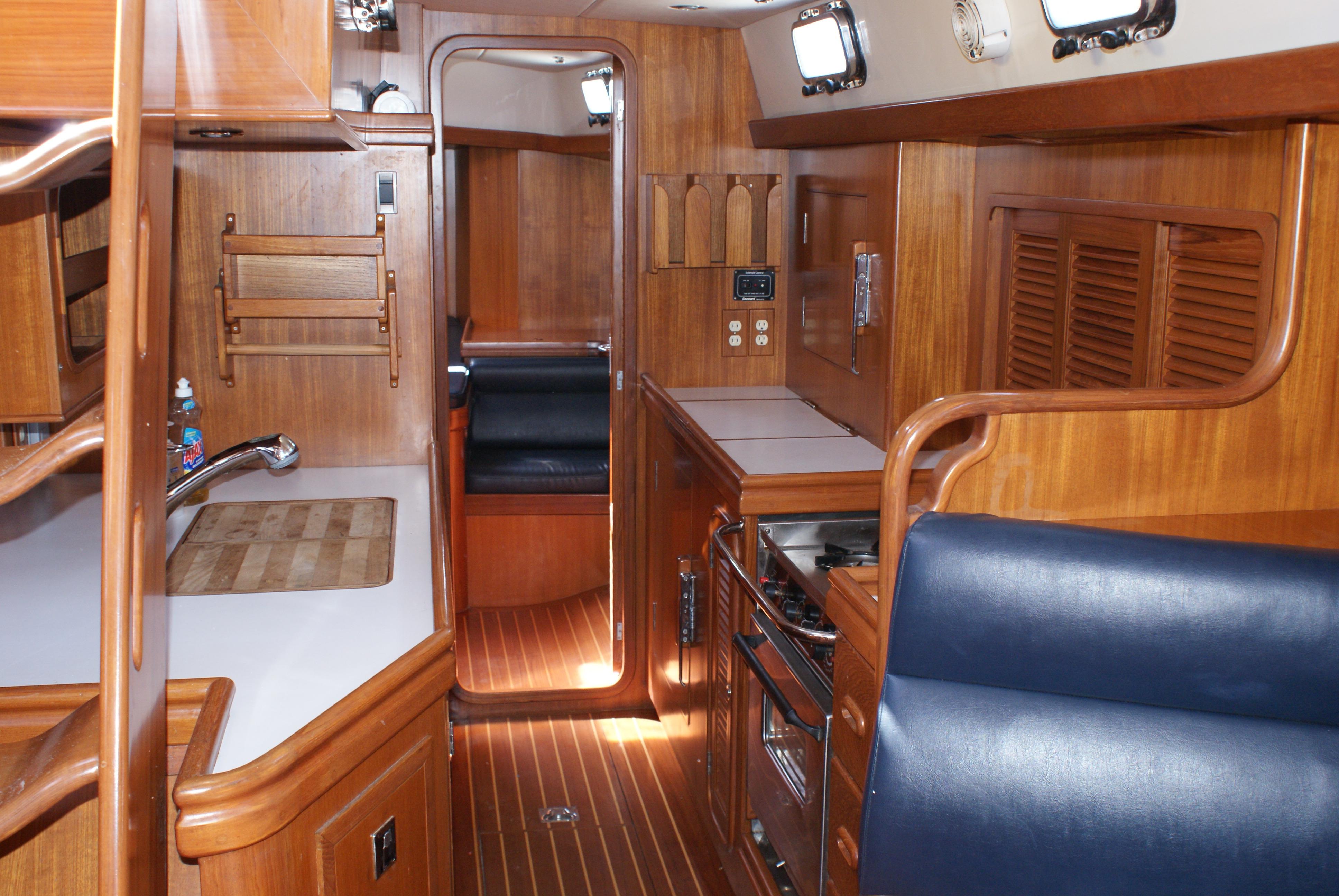 The galley is located to port in the walkthrough between main salon and master aft cabin. Amidships, below and behind the companionway steps, is an island with counter space and double sinks. Below this counter is the sound proofed engine/genset compartment, with four access hatches, forward, beneath and aft of the sink. The galley also features a custom over under refrigerator/freezer box set up that was factory built. The refrigerator is both top and front loading.