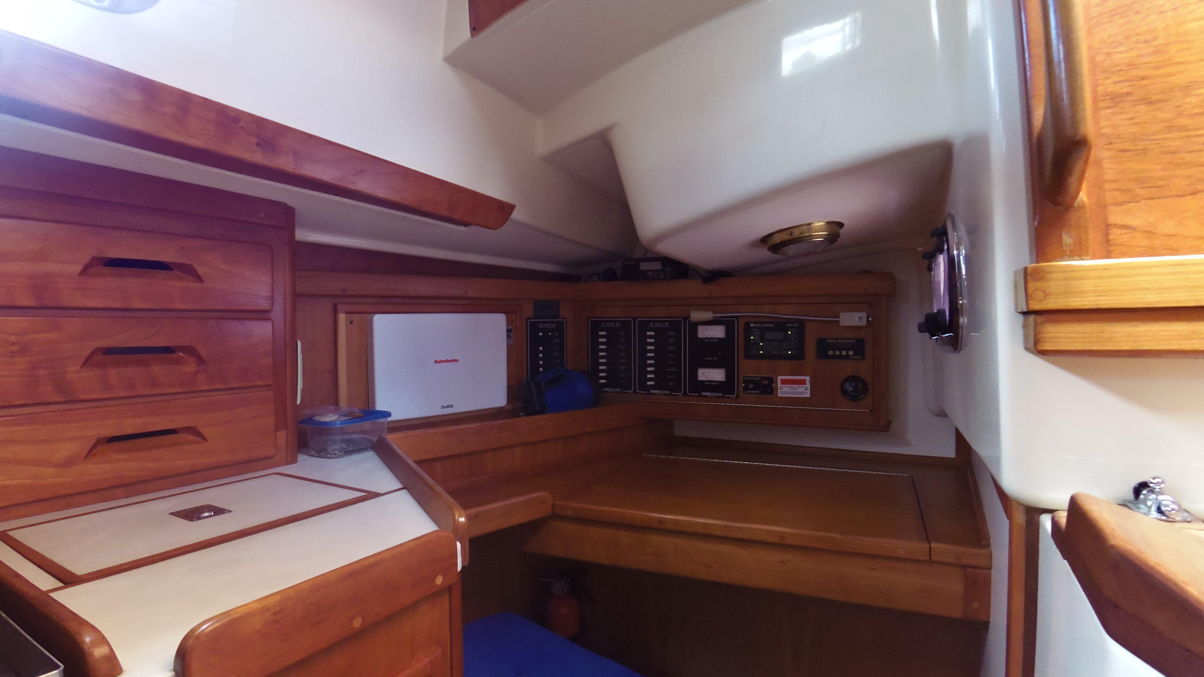 The forward cabin features a large double berth. The aft cabin also includes a full-sized double berth, a hanging locker and shelves and drawers. Another clever design feature is the aft-facing nav station tucked behind the galley.