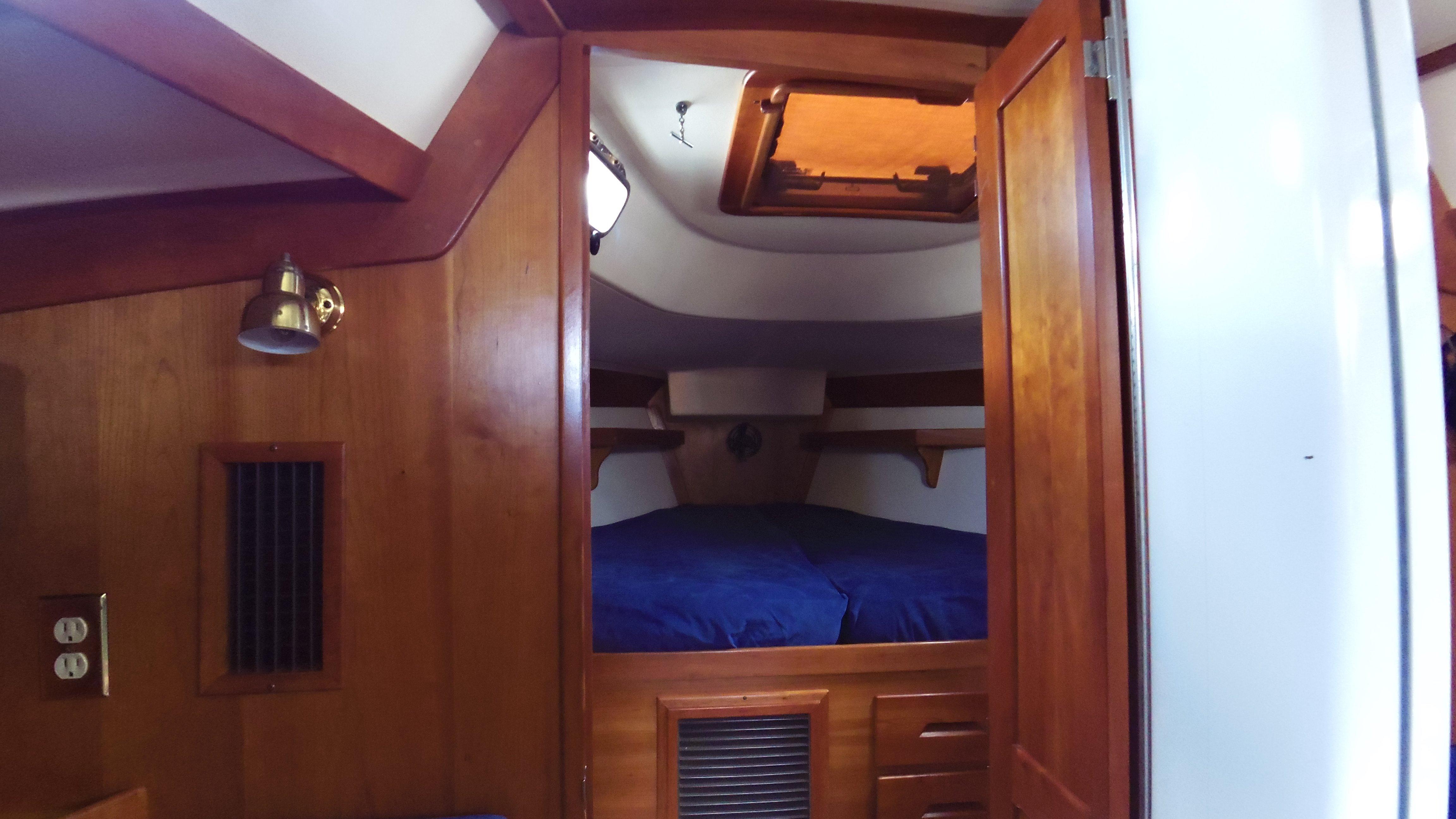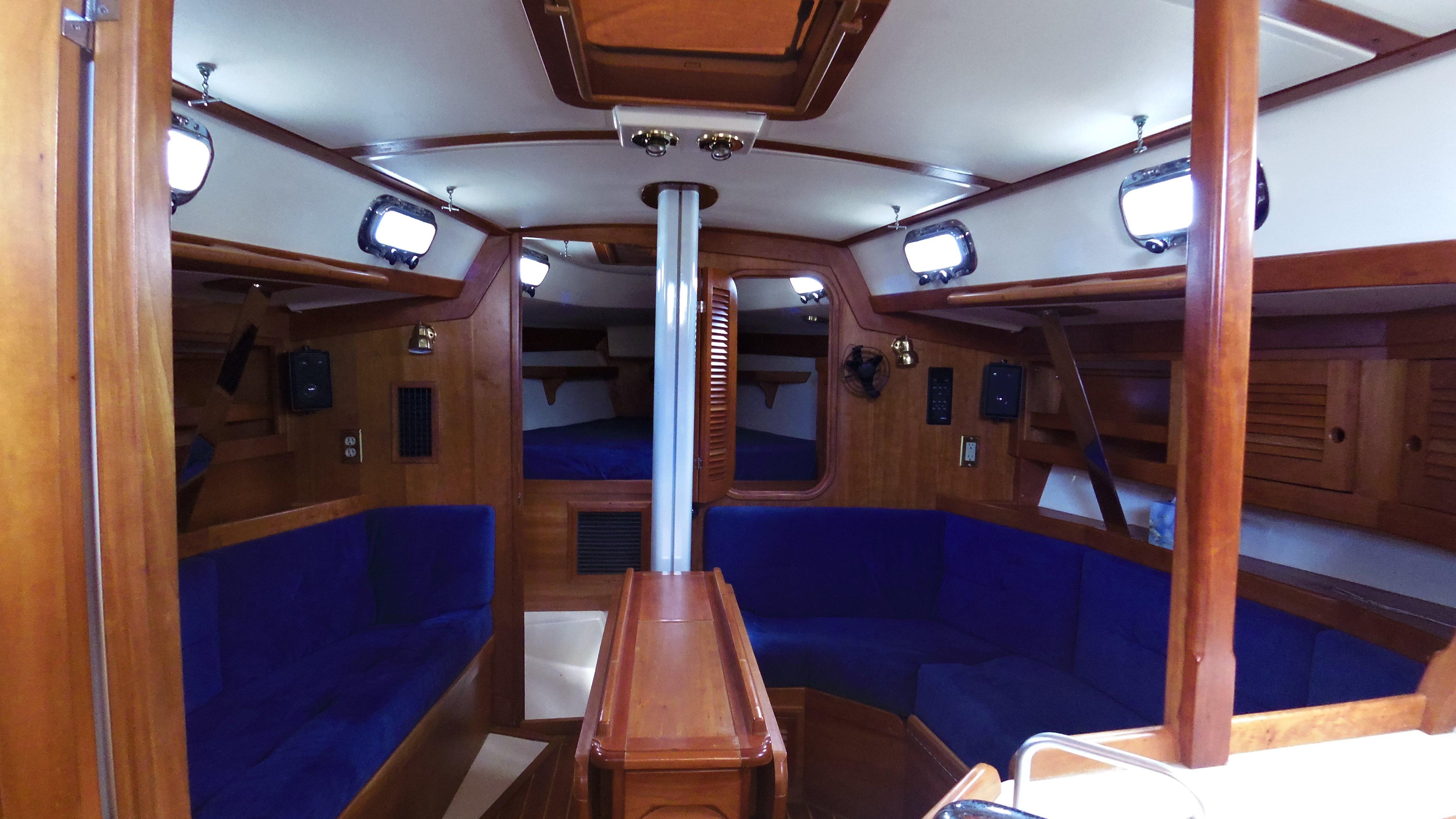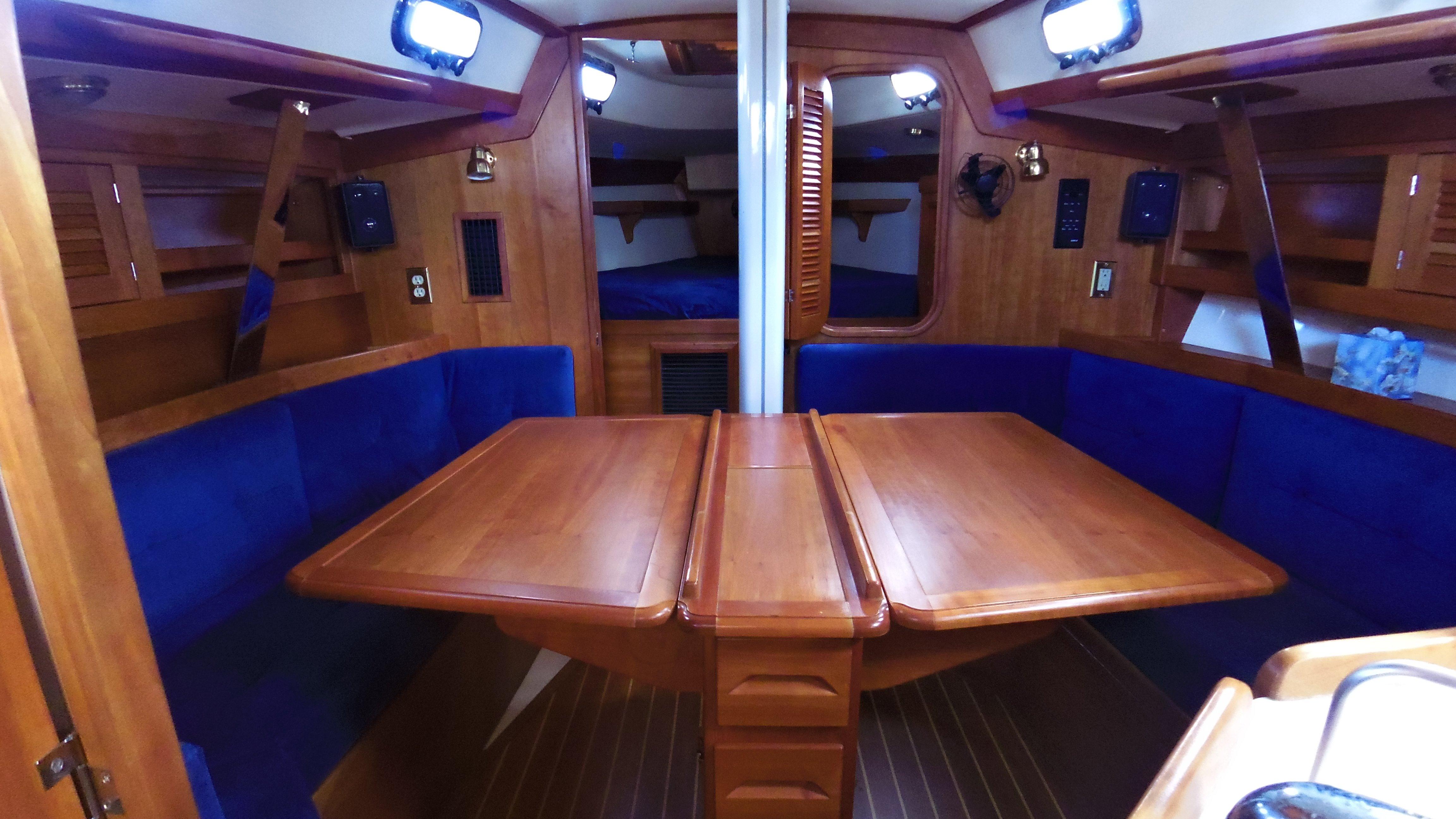 The saloon is finished in the optional maple interior and the cabin sole is teak with inlaid holly. The joiner-work is quite nice. There is center-line salon table with opening leaves on both sides. Excellent ventilation is provided by two Hood overhead deck hatches, S/S dorades and 10 stainless steel Hood portlights. The settees have contoured cushions that are quite comfortable. Additionally the Settee on this boat is convertible to a double, like the option that was available on the 3700's.