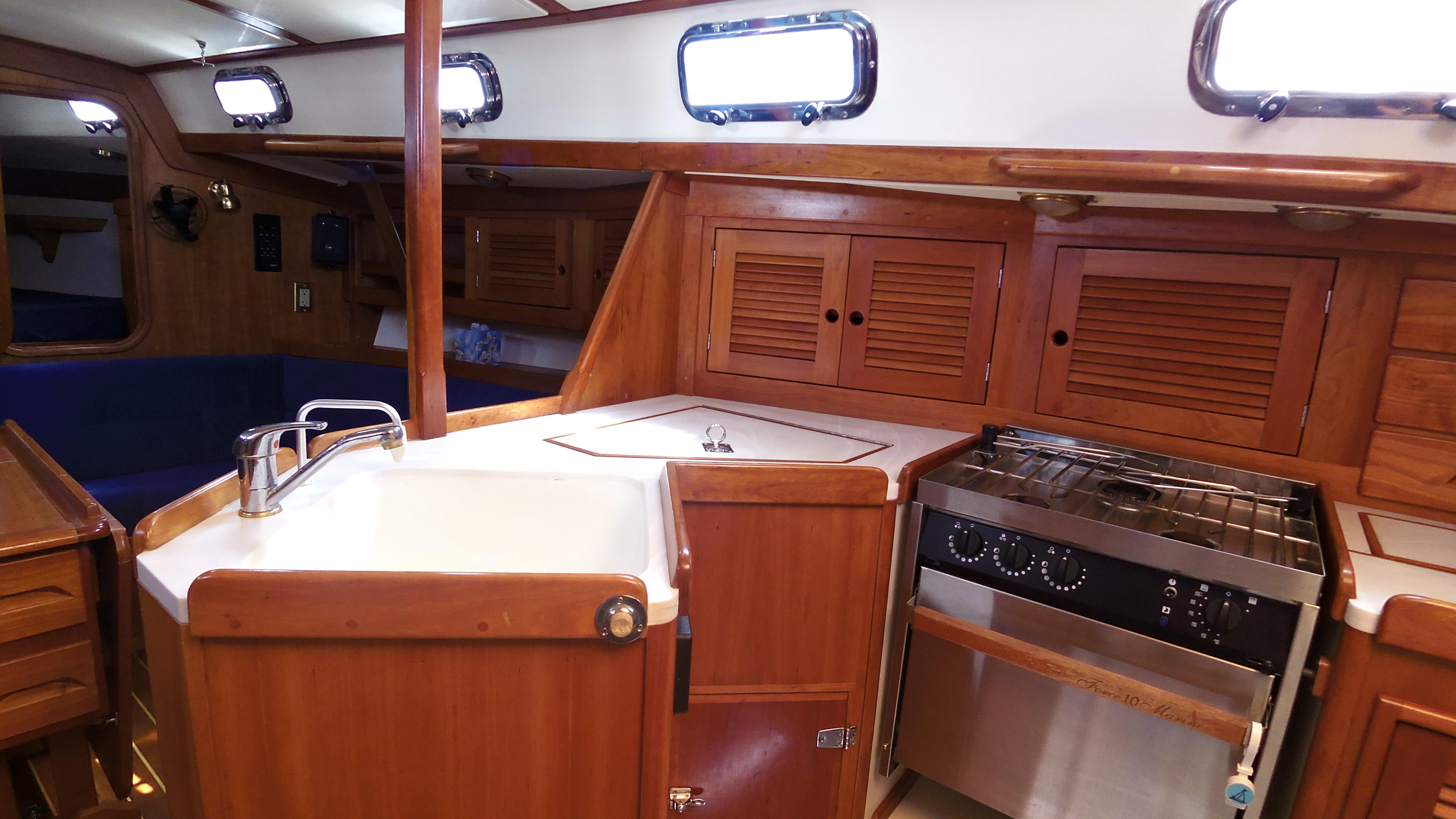 The galley includes a large single sink, an icebox/fridge, a three-burner stove and plenty of counter and storage space.