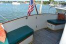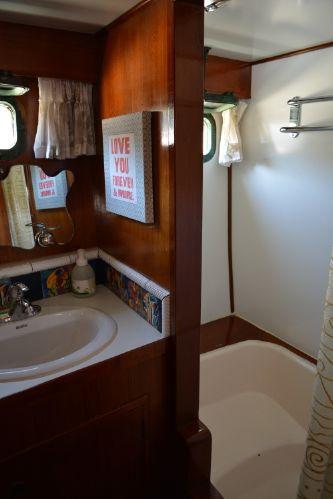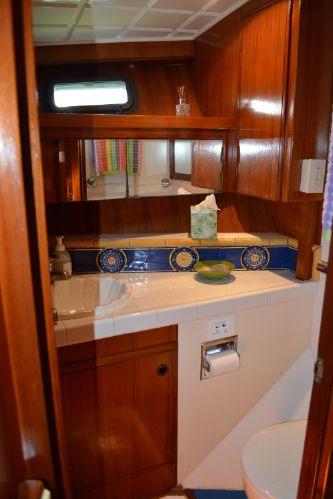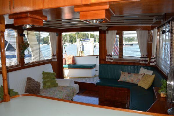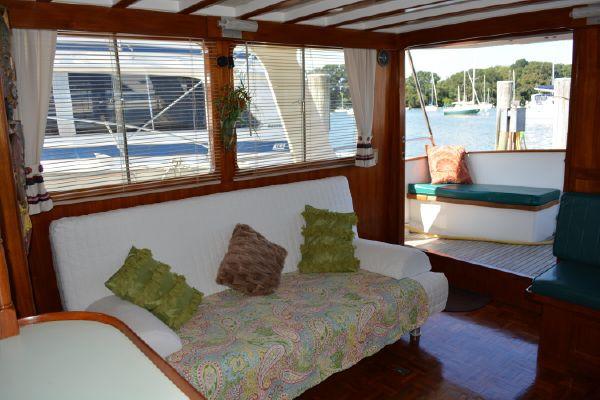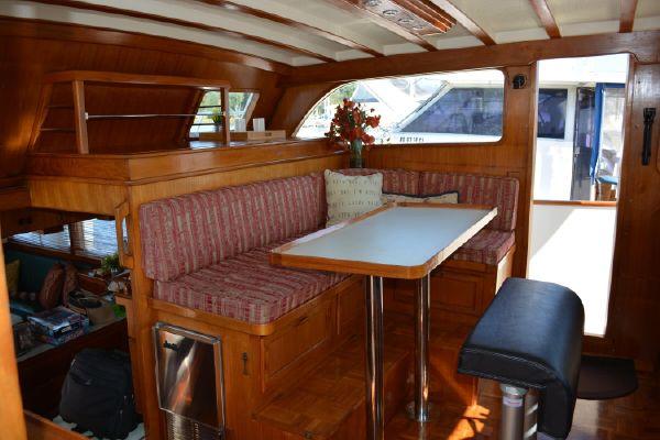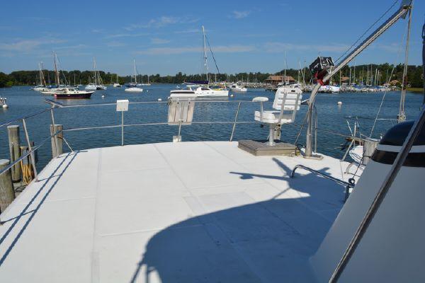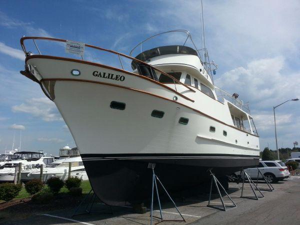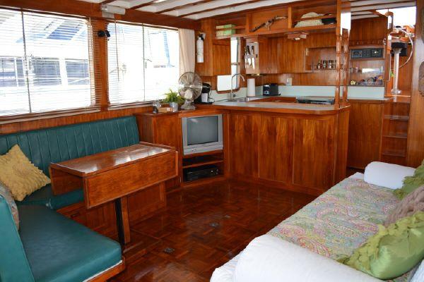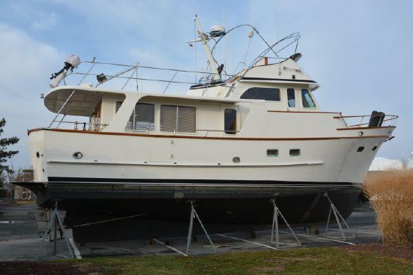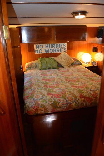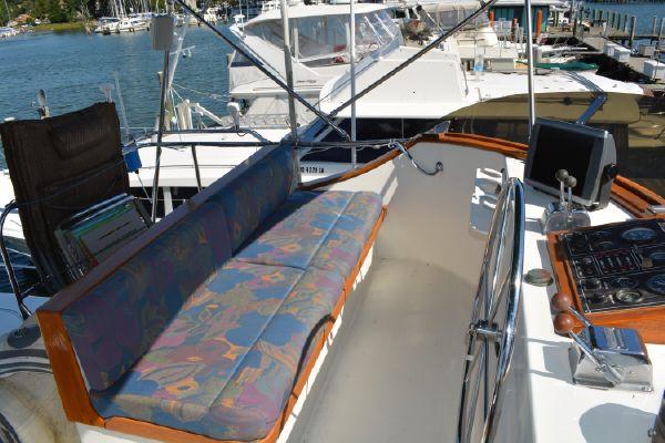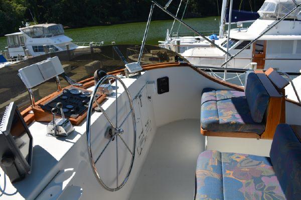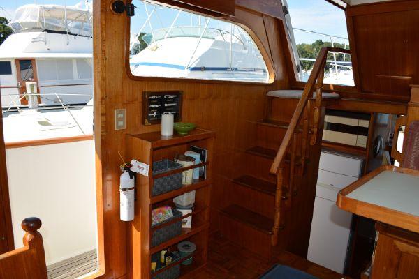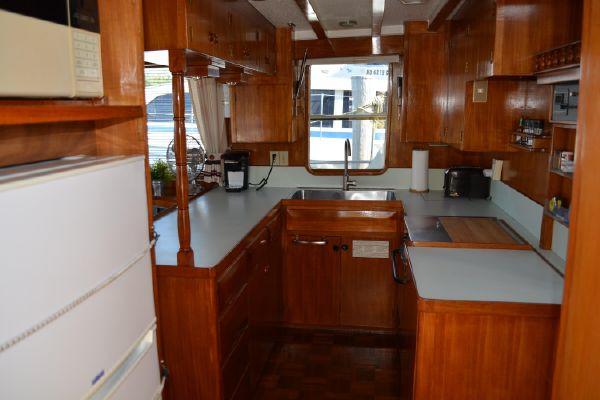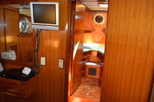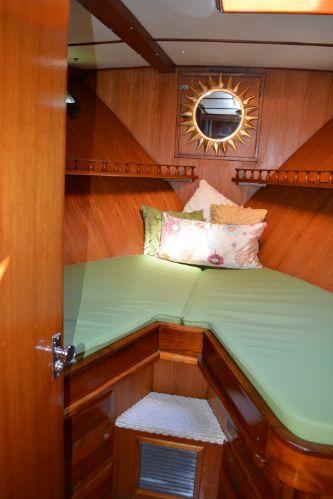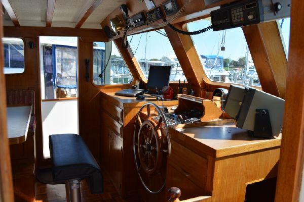Double teak opening doors provide entrance from the cockpit to the spacious salon which features a built-in settee to port and a couch to starboard. The galley is forward to port on the same level. The galley runs full beam with a deck access door on the starboard side. Up 3 steps is the pilothouse that is fitted with an L-shaped settee/dinette, watch berth and port and starboard pilothouse doors. The Owner's stateroom with a queen island berth and ensuite head with tub and shower. The day head which serves as the guest head is at the foot of the companionway. The bow stateroom features a V-berth with teak cabinetry and an opening deck hatch. Teak parquet flooring is featured throughout.