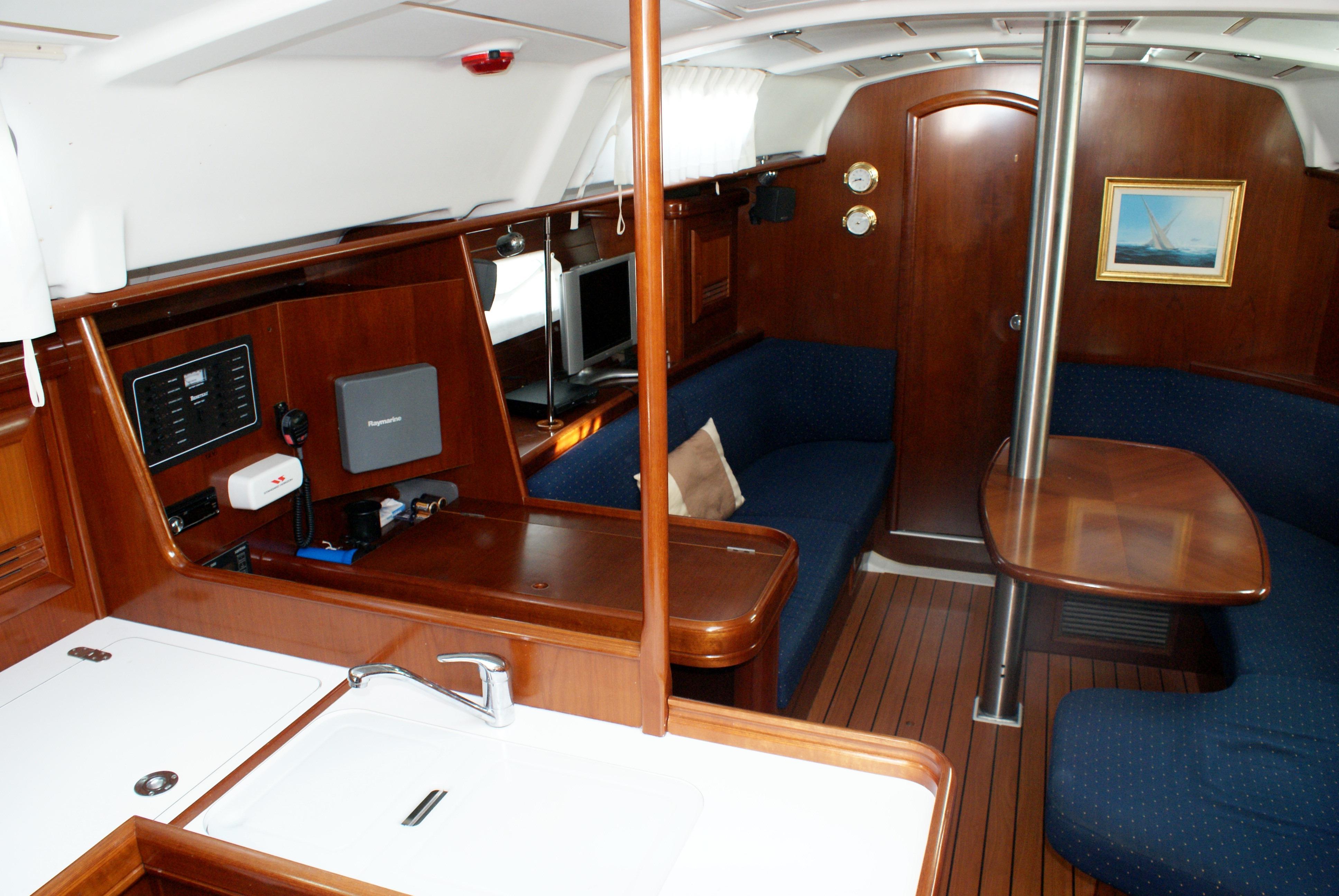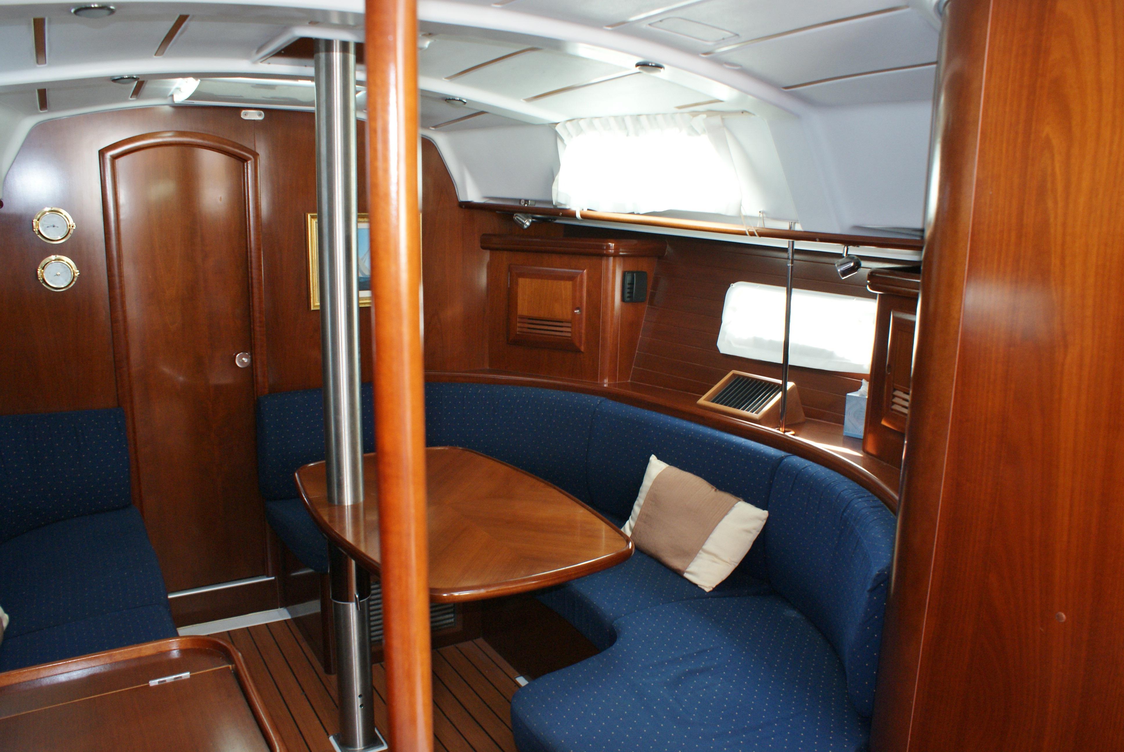 The well-lighted salon interior boasts 6”4”headroom and features a large deck hatch with closing blind, two opening portholes, halogen reading lights and overhead lights.