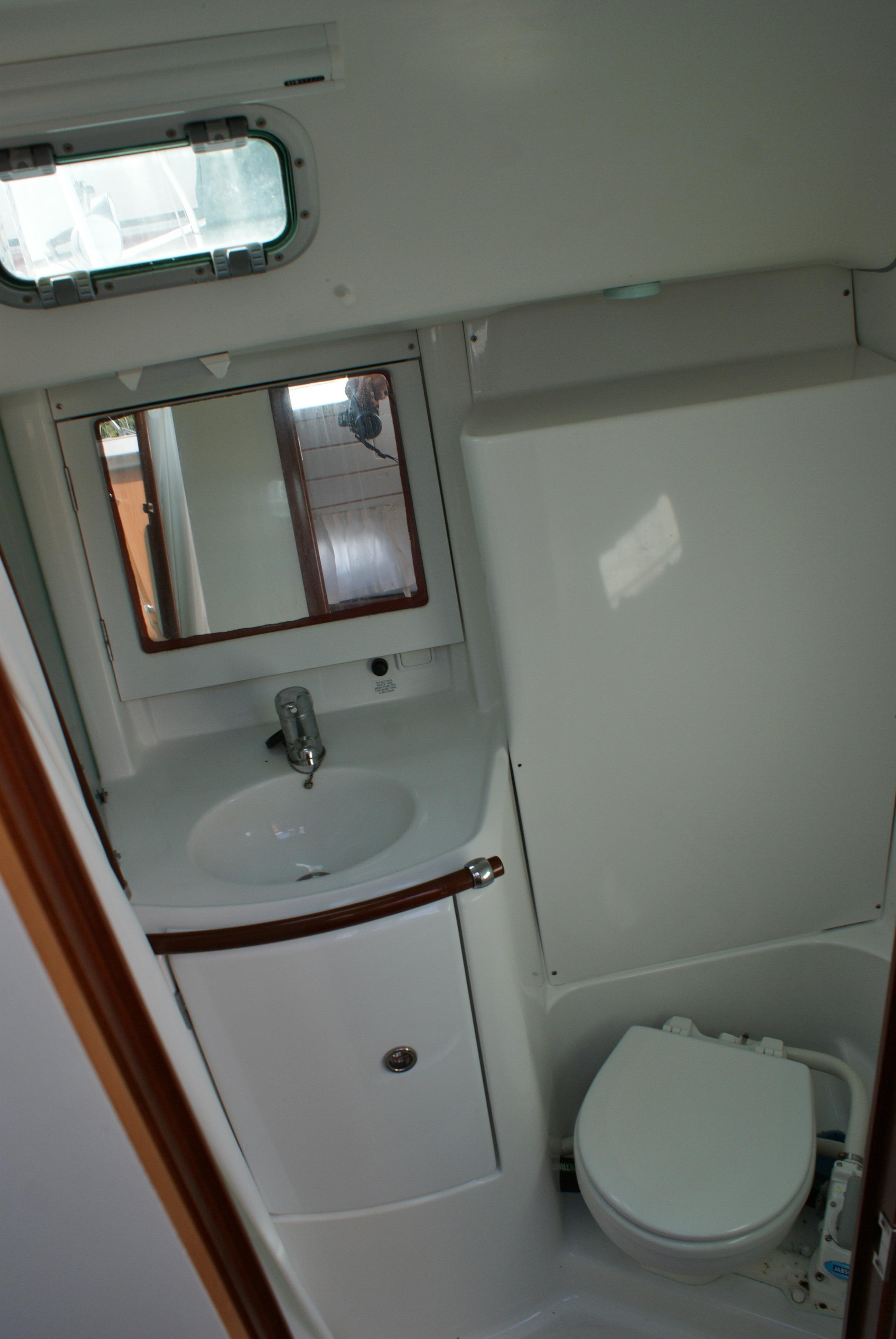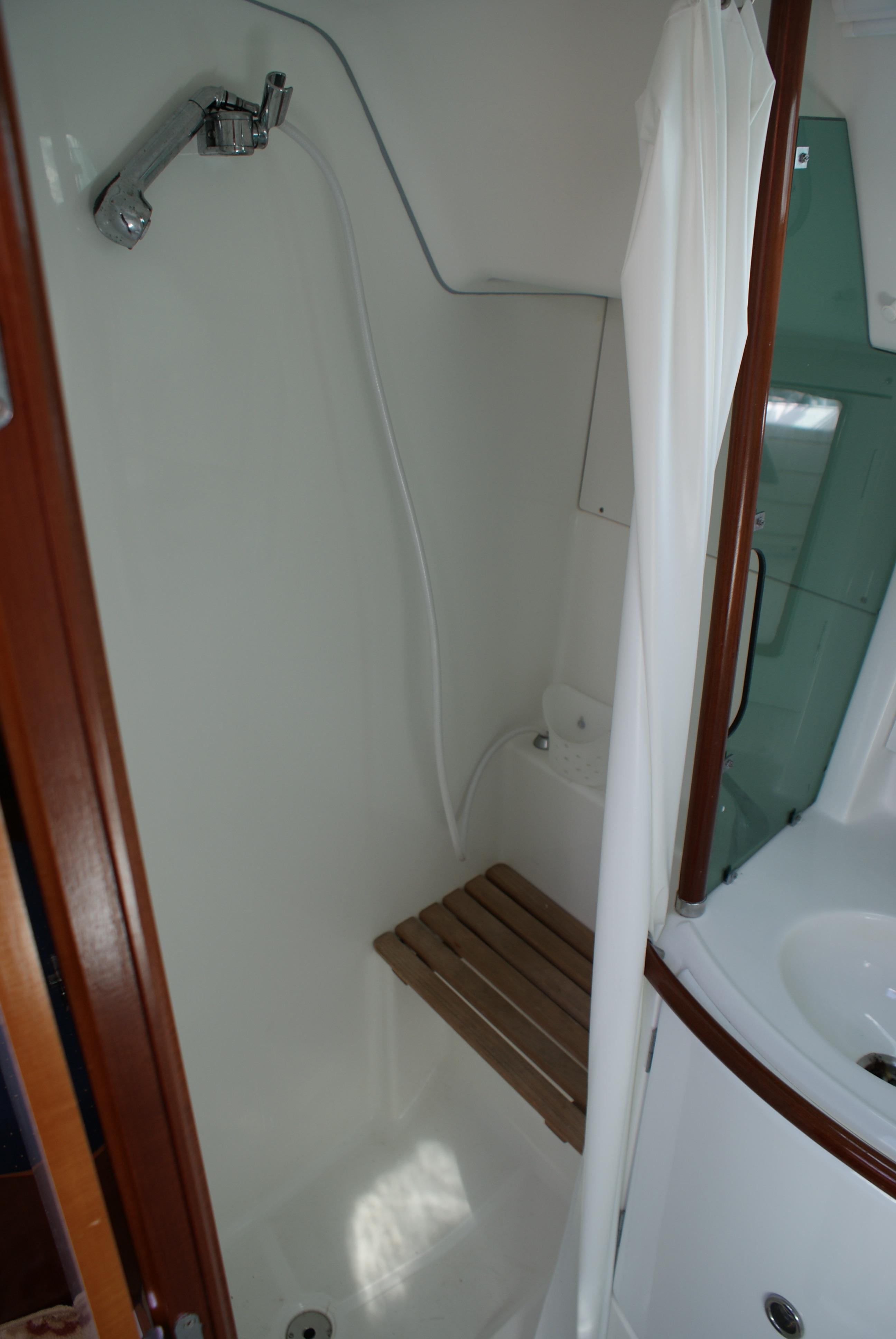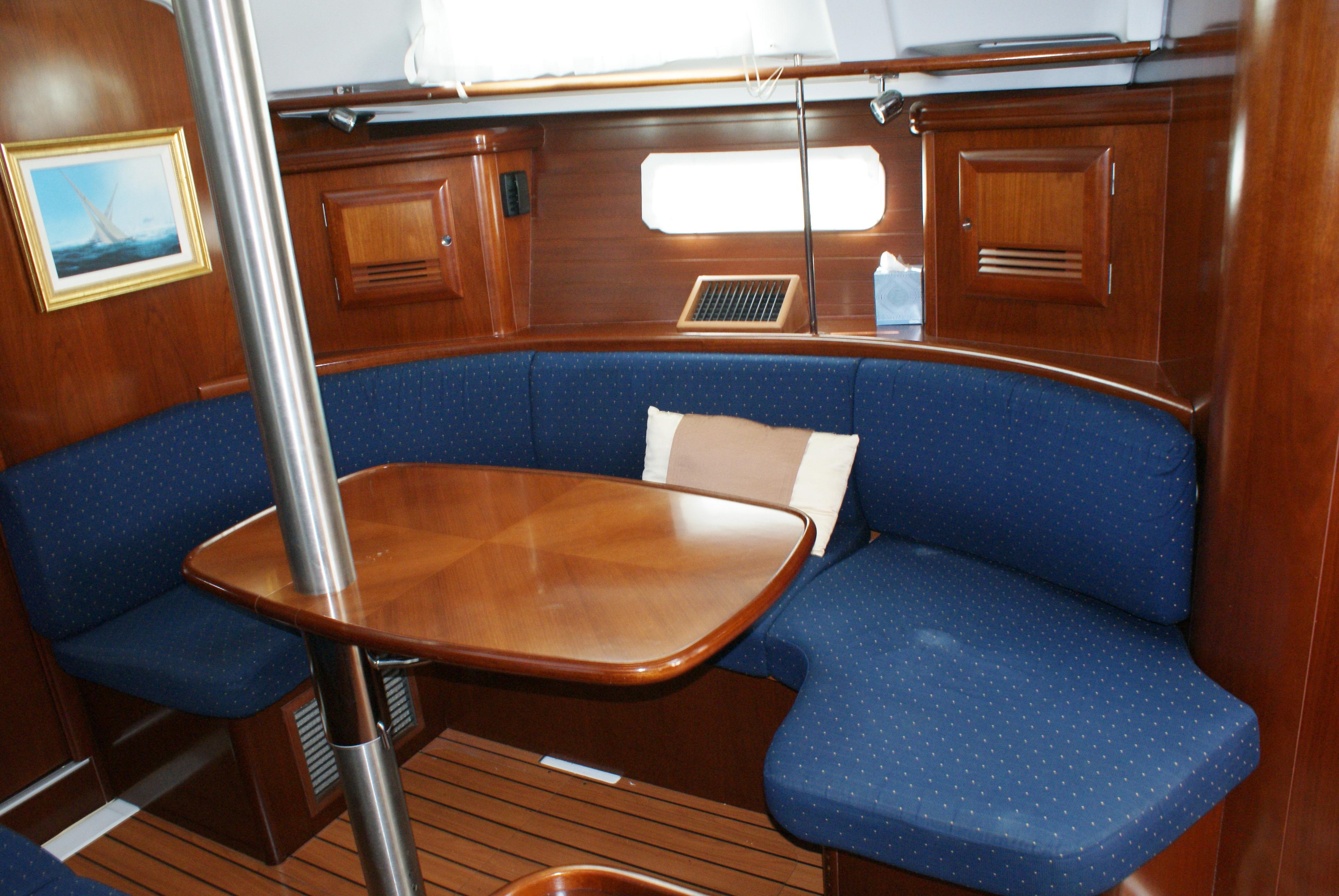 Entertaining the Salon, down the companionway stairs, you find the trade mark large head with separate stall shower to starboard. Opposite to port is the very well equipped galley. Moving forward to starboard there is a large dining table and U-shaped settee. The table converts to a berth for overnight guests. Portside, there’s a comfortable settee with bar storage behind the seat back. The forward facing navigation station is just aft of this settee and forward of the galley. Ample storage is found throughout the salon in cabinets, shelves and the settee bases.