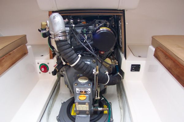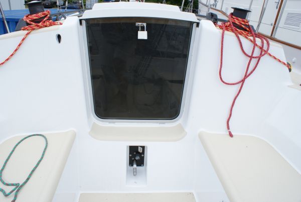 Starting forward you have an open forepeak area. This area can easily be fitted with a v-berth. Just aft you find the head. It has a Raritan PH-2 marine head with y-valve to a holding tank. The head area also has a molded sink with overboard drain. In the main cabin area you have two full berths covered in sunbrella "toast" colored canvas.