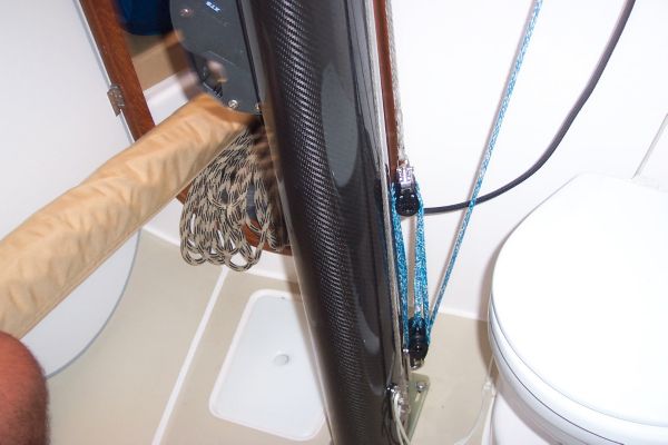 Hall 152C tapered carbon fiber mast, autoclave cured with double airfoil Aluminum spreaders, main, jib, spin halyard and topping lift sheaves, Spin/whisker pole track with sliding eye on front of mast, Harken System mainsail luff track, custom integrated electronic display mount, main and jib halyard exit inside cabin; mast finished in Awlgrip offwhite.