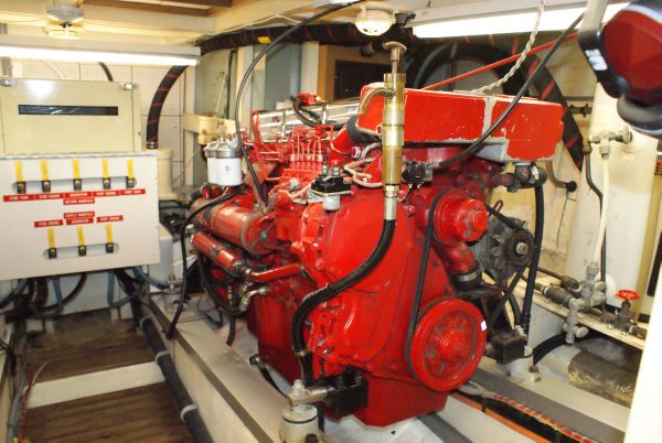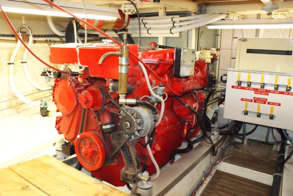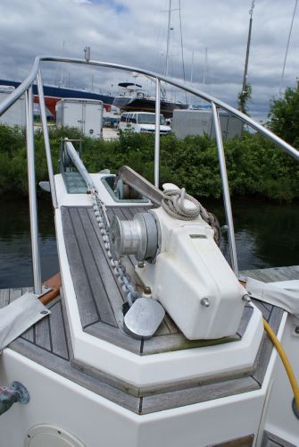 Forward the guest cabin features a V-berth and an ensuite head (2004 Groco toilet) and shower. A hanging locker is to port and there is six drawers beneath the berth. Ventalation is provided by three opening portlights and a large hinged hatch opens to the cabin top. The companionway steps lift to access the engineroom.