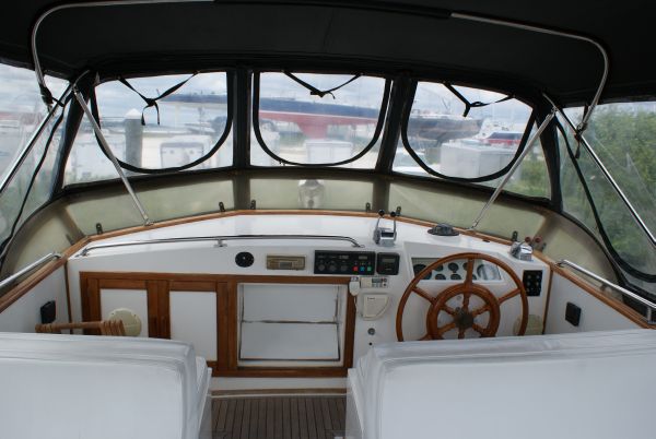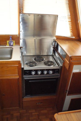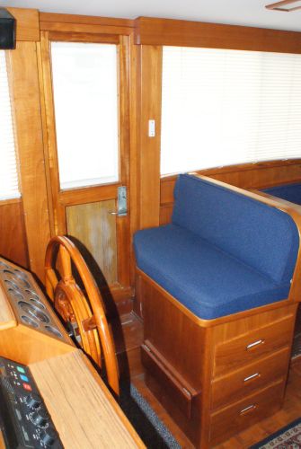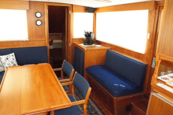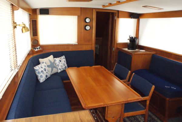 The main salon is spacious and features a galley portside and forward, a fully equipped helm station to starboard, port and starboard cabin entry doors, large opening windows on two sides, a built-in L-settee with storage, and a teak table with drop leaves. A a cabinet in the port aft corner opposite the settee is available as storage or a space to add additional refrigeration. The Salon upholstery was redone in 2008.