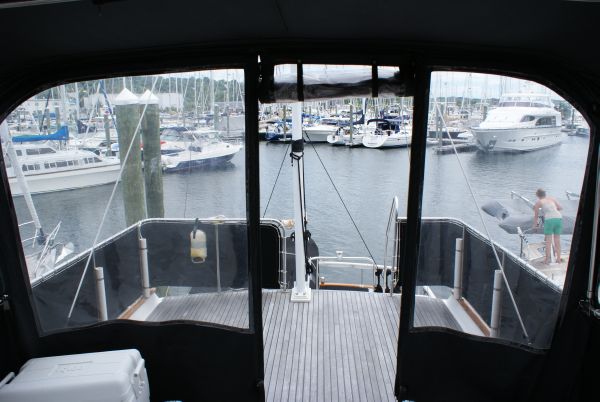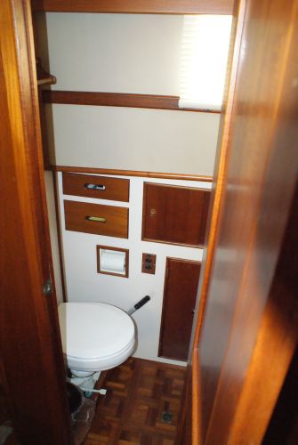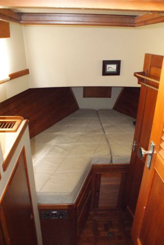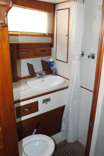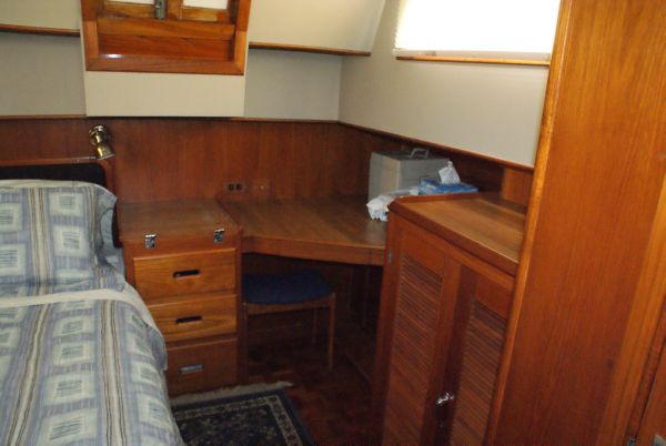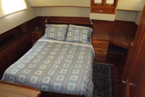 The aft master stateroom is down steps from the salon through teak doors. This cabin features a walk around queen berth with drawers underneath. A teak bureau/vanity is located in the port aft corner of the master suite. The ensuite head (2004 Groco), is to port and features; a mirrored vanity with sink,formica counter top w/ storage beneath. A large separate shower, a teak grate with a shower sump pump beneath is located on the starboard side.