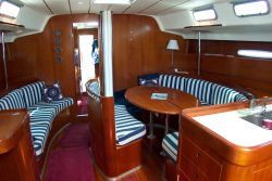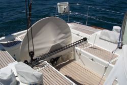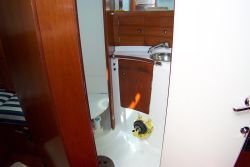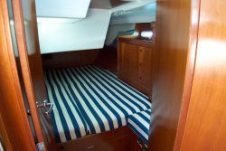 The Master Stateroom is forward featuring a large double berth to starboard, and custom upper and lower berths on the port side with storage under, two overhead hatches with sun screens and 24-hour solar fans (on all 4 main hatches). A large full width electric head and shower is forward. All berths are equipped with custom lee cloths; doubles have 2 lee cloths for offshore safety. The Main Salon is amidships, aft of the Master Stateroom with the preferred L-shaped galley to starboard and the Nav. station to port. An oval articulating teak table, seating up to 8 is to starboard with a separate settee to port. An second head is located aft of the nav. station. It also contains a backup emergency manual bilge pump. Both heads are equipped with holding tanks with both on-deck and overboard discharge. Twin Aft Guest Cabins feature large double berths ample storage and hanging lockers. All floor boards are locked down with stainless steel positive locks.