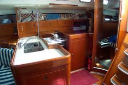 Located on the starboard side the L-shaped galley is very comfortable either offshore or at the slip. Features are:Large double S/S sink, great counter and storage space, Hot and Cold Pressurized water plus a manual salt water foot pump. Excellent light and ventilation is provided by the opening ports and hatches.
