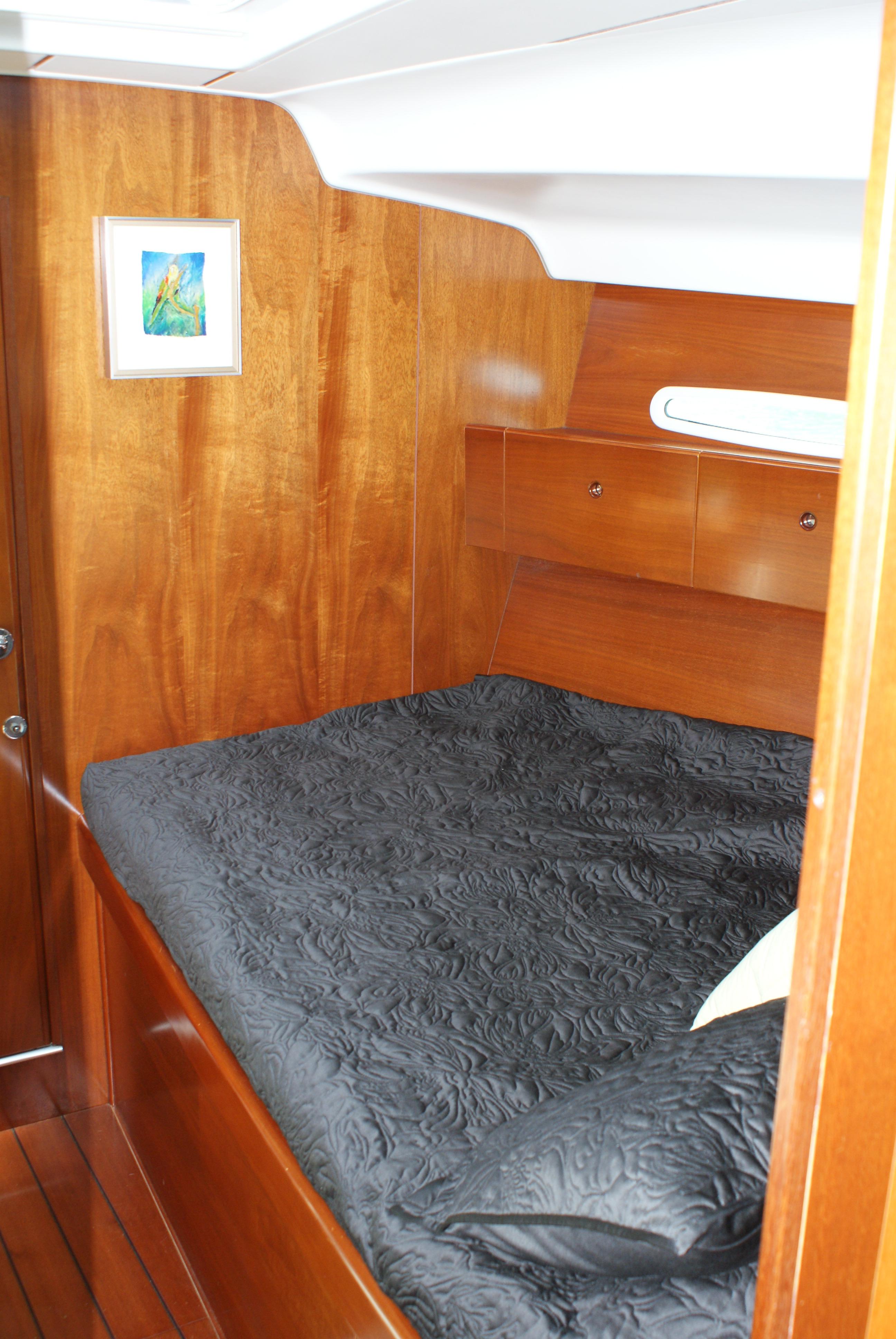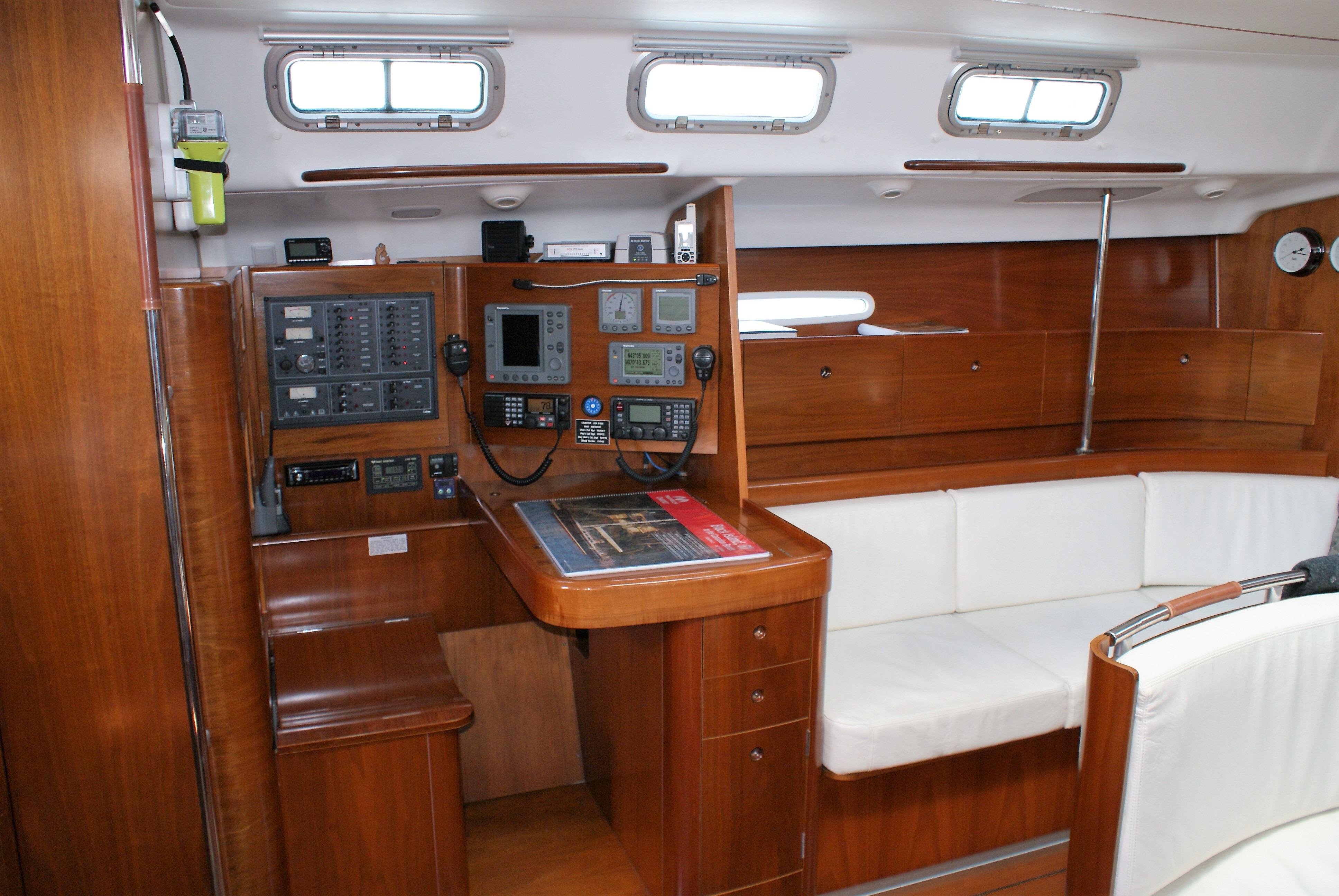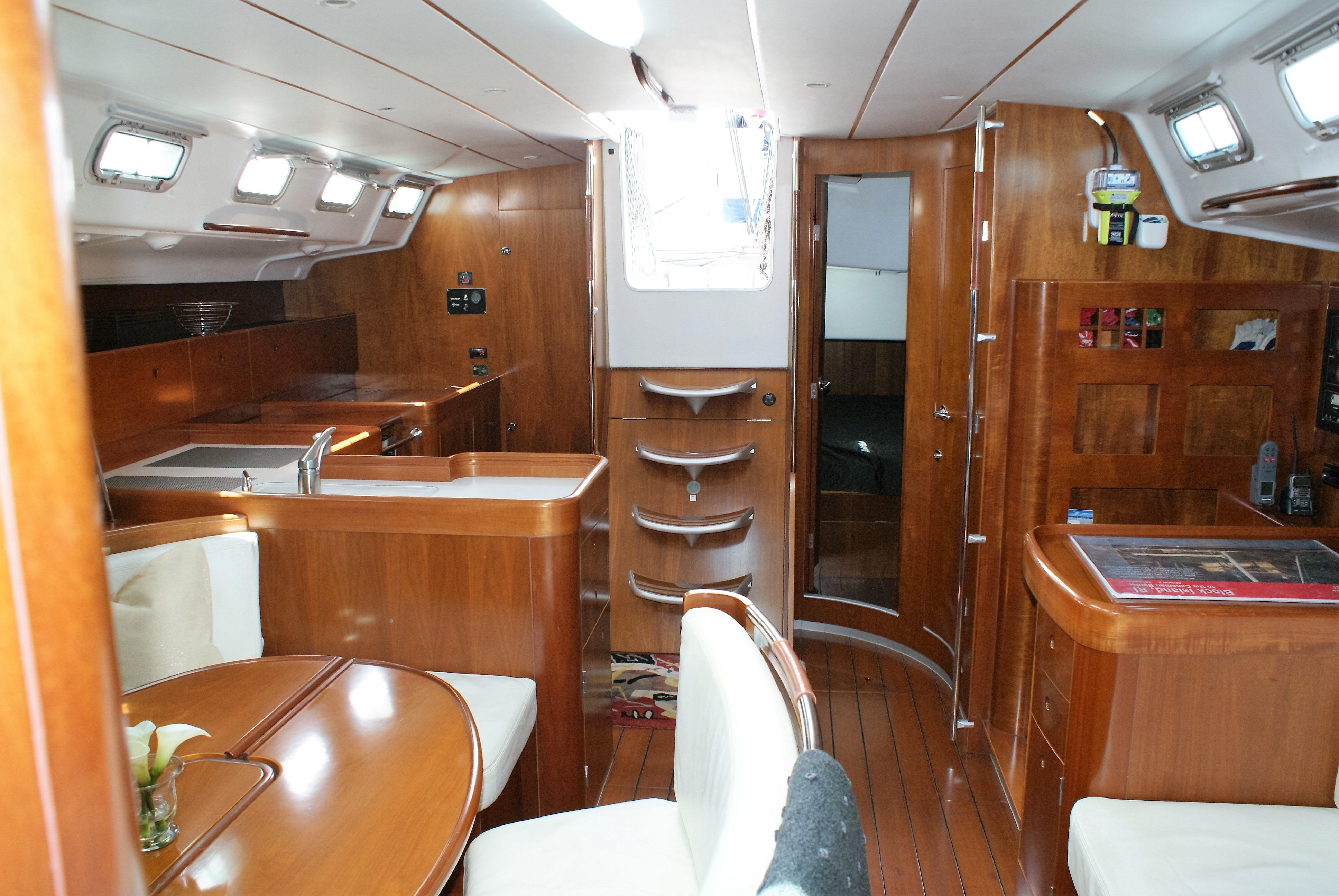 The master stateroom is forward with a large head and shower forward of the berths. There is a pullman double berth to starboard, and a settee to port. Aft of the master cabin is the main salon. The oval table has seating all-round and can be adjusted for heel angle for dining under way. Just aft of the salon table is the L-shaped Galley. The Nav station is opposite the galley to port. A large head and shower is aft of the Nav station, followed by a double guest cabin. Opposite of the guest cabin on the starboard side is a huge storage cabin located aft of the galley providing excellent storage. Beautifully varnished interior with abundant natural ventilation and lighting throughout. Storage is outstanding with her many drawers, cabinets and hanging lockers in every cabin.