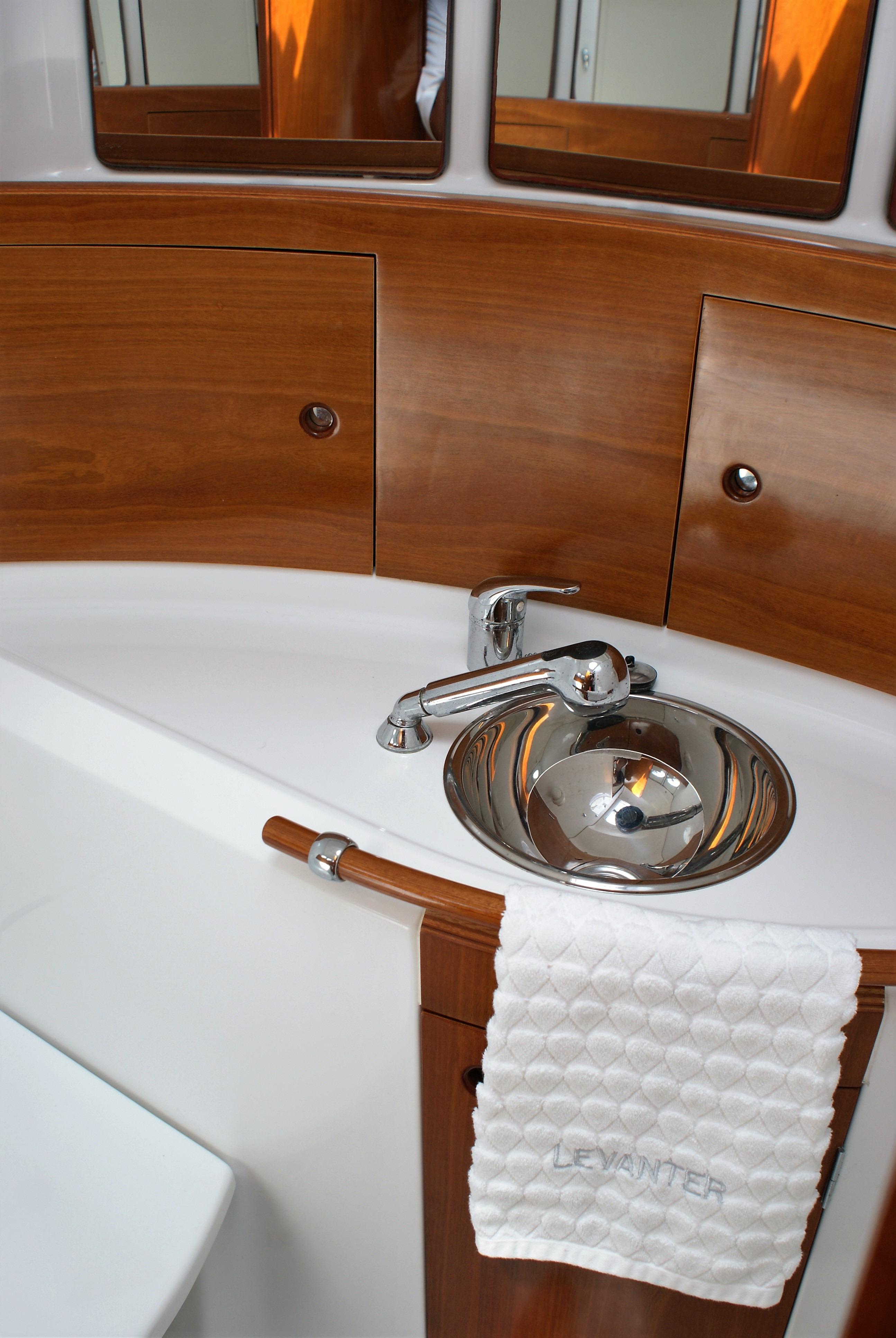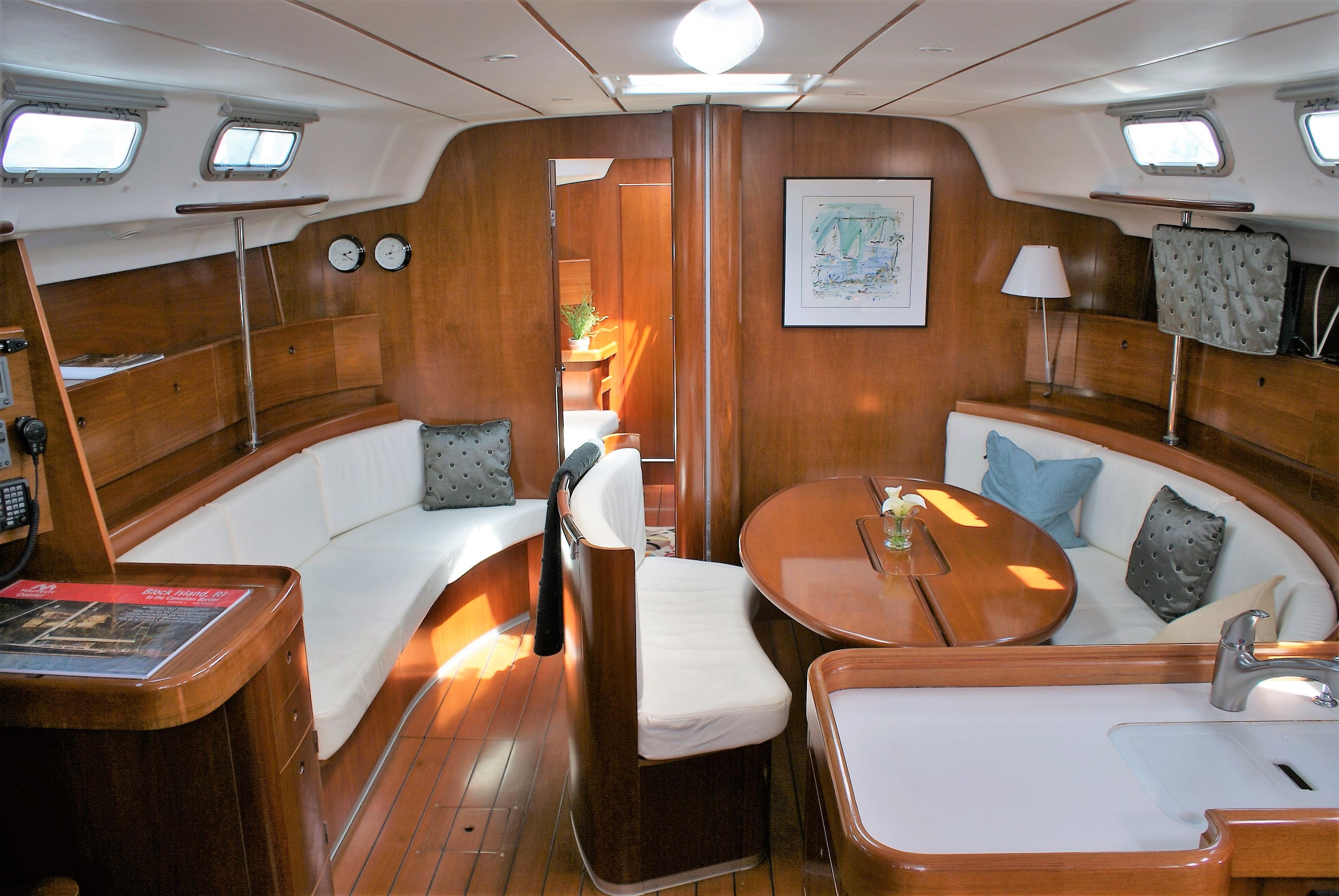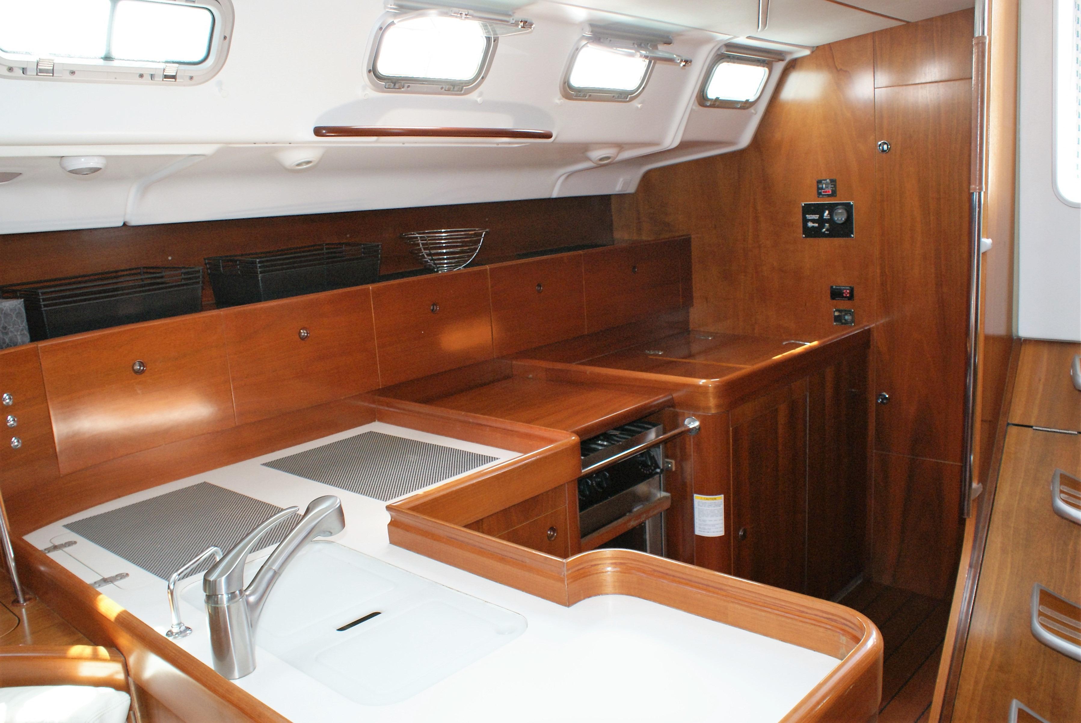 The master stateroom is forward with a large head and shower forward of the berths. There is a pullman double berth to starboard, and a settee to port. Aft of the master cabin is the main salon. The oval table has seating all-round and can be adjusted for heel angle for dining under way. Just aft of the salon table is the L-shaped Galley. The Nav station is opposite the galley to port. A large head and shower is aft of the Nav station, followed by a double guest cabin. Opposite of the guest cabin on the starboard side is a huge storage cabin located aft of the galley providing excellent storage. Beautifully varnished interior with abundant natural ventilation and lighting throughout. Storage is outstanding with her many drawers, cabinets and hanging lockers in every cabin.