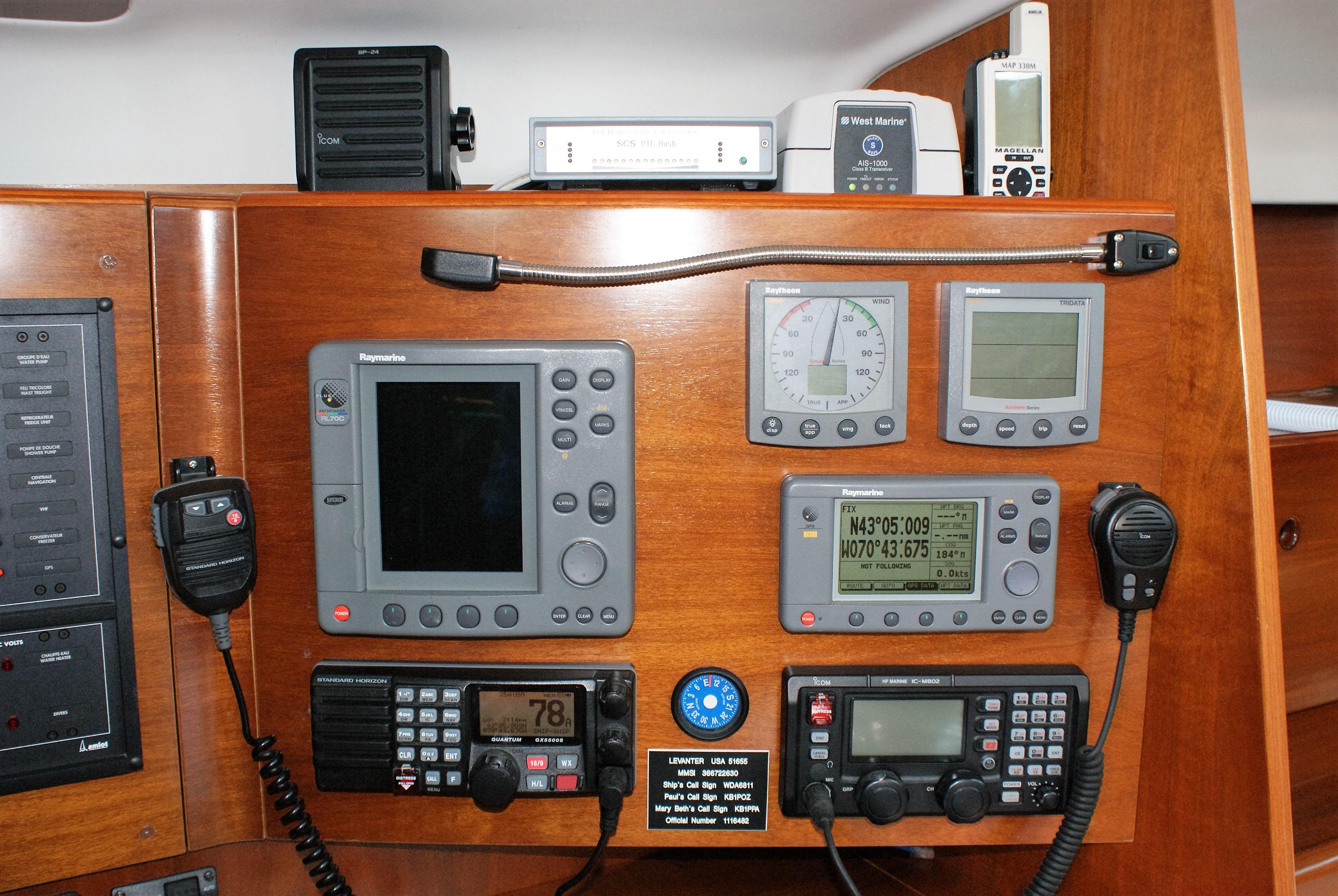 Electronics at the helm are mounted on the binnacle in a pod and in the designed spaces on the combing and pedestal base.