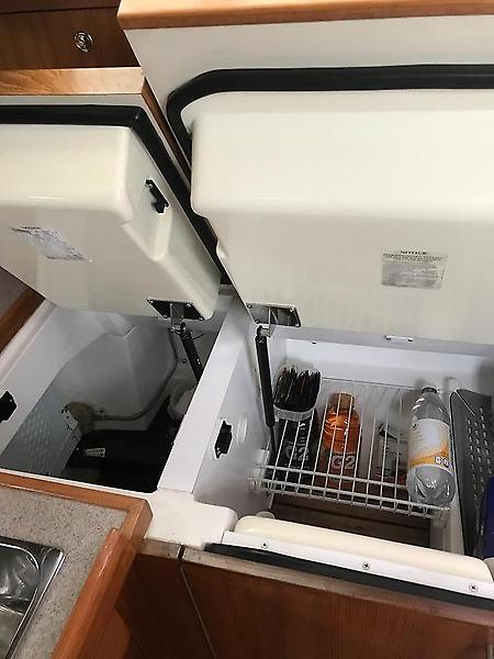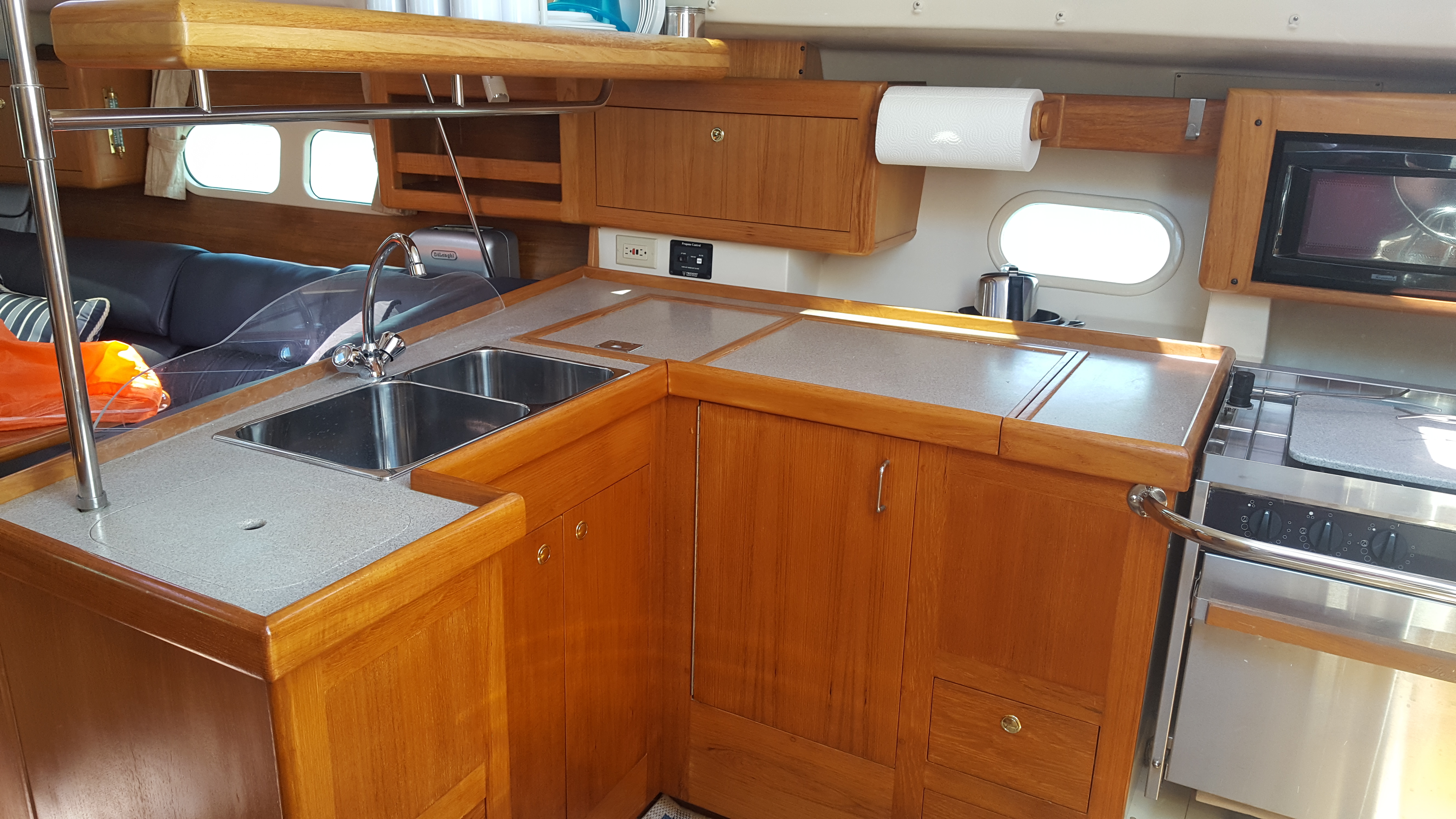 The galley to Starboard has a Force 10 3-burner stove, Kenmore microwave, 12v Adler-Barbour refrigerator/freezer, and a double stainless steel sink. There are plenty of storage shelves and drawers. The Corian counter tops are also lined with teak.