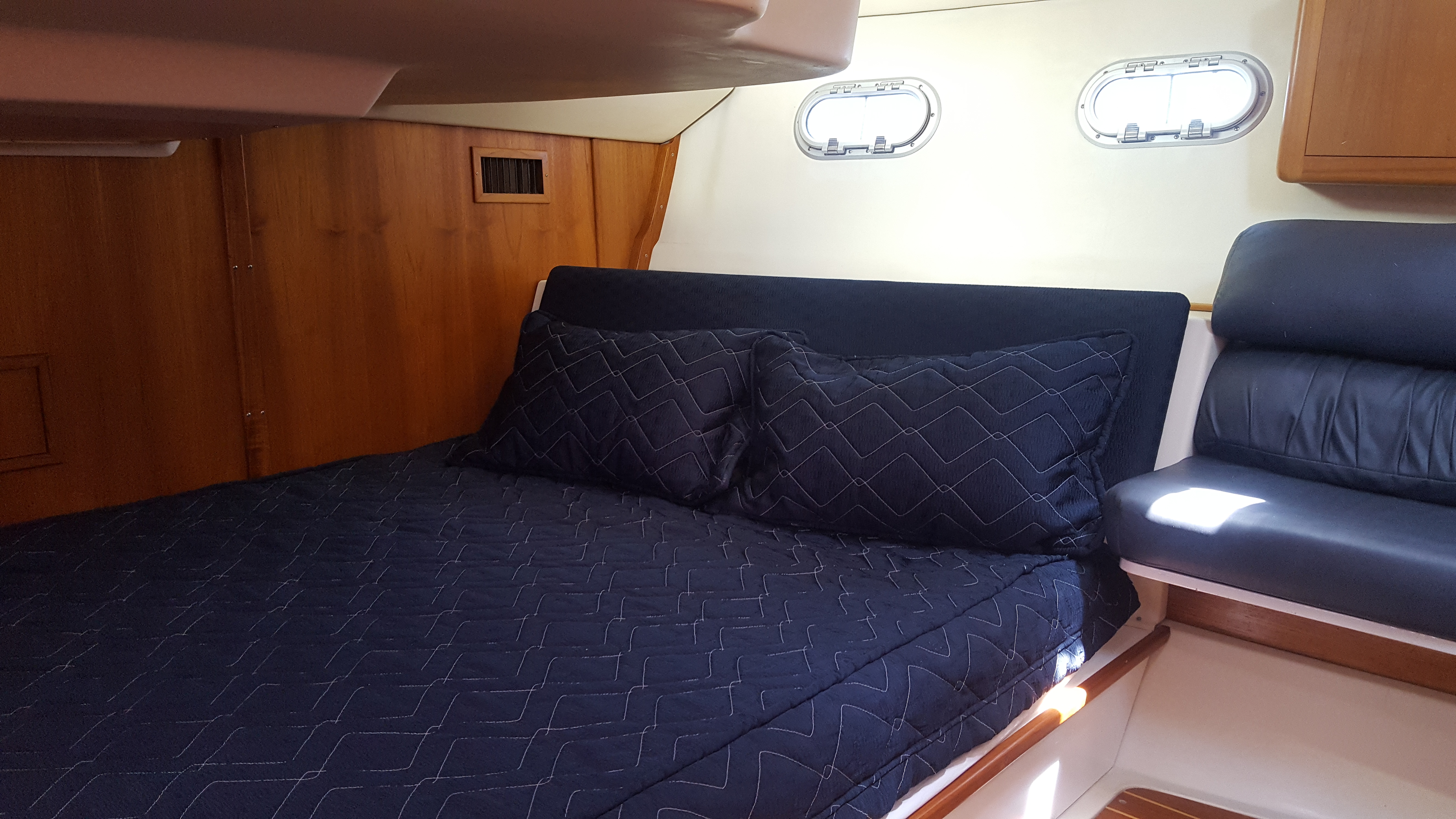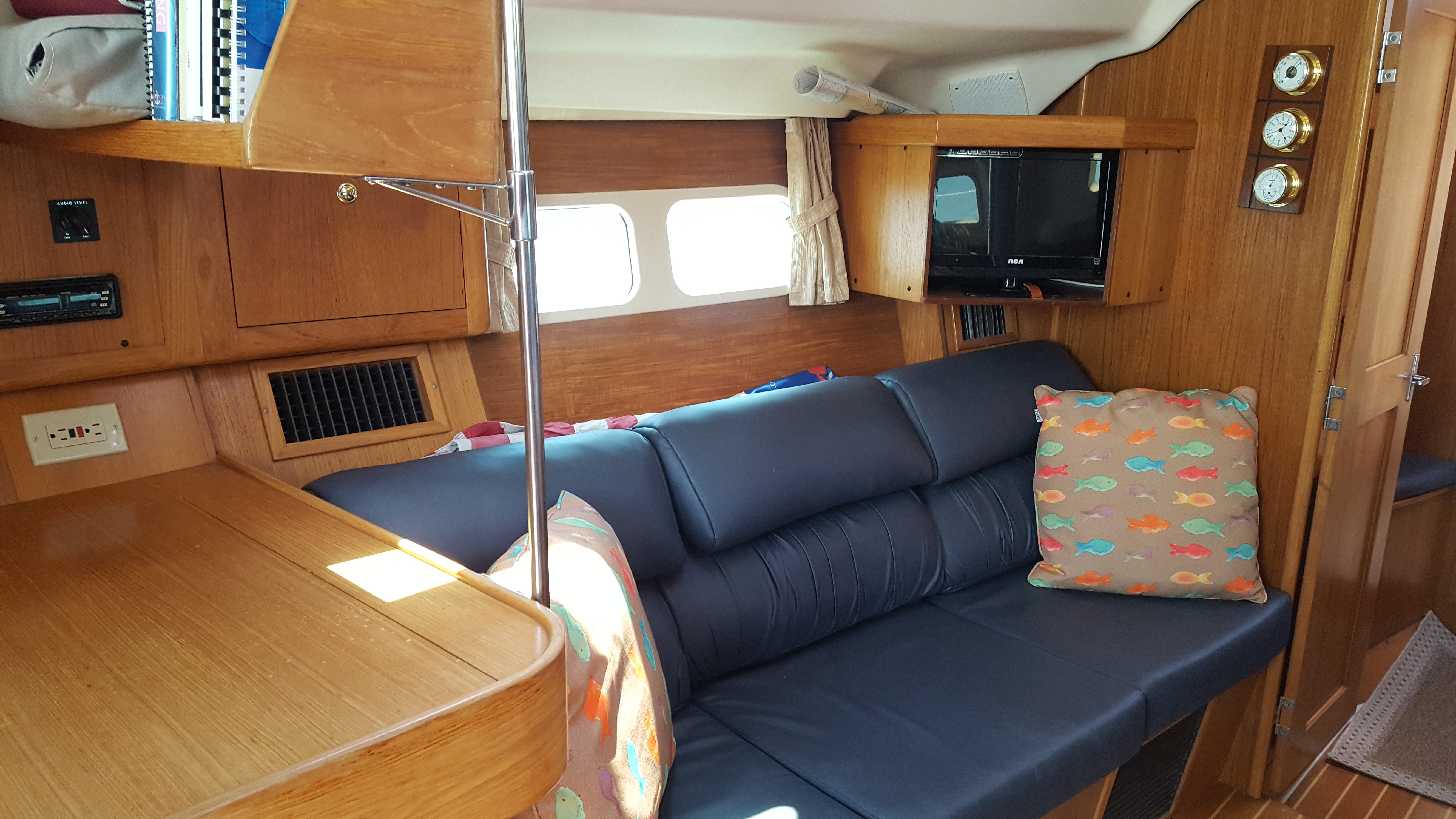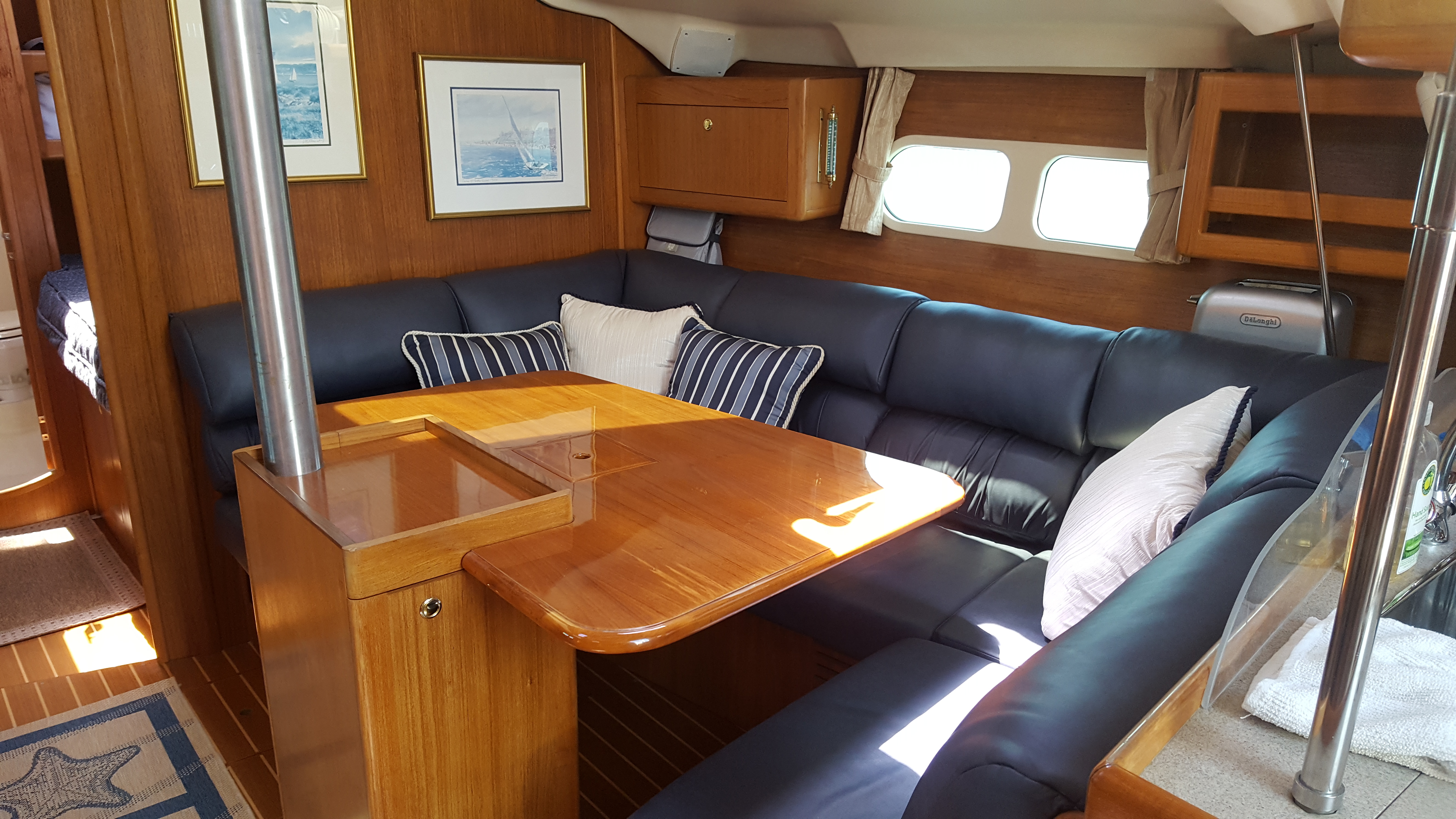 Down below, the cabin is spacious with numerous windows that provide natural light and ventilation. The cabin features a teak and holly sole and new salon settee cushions.