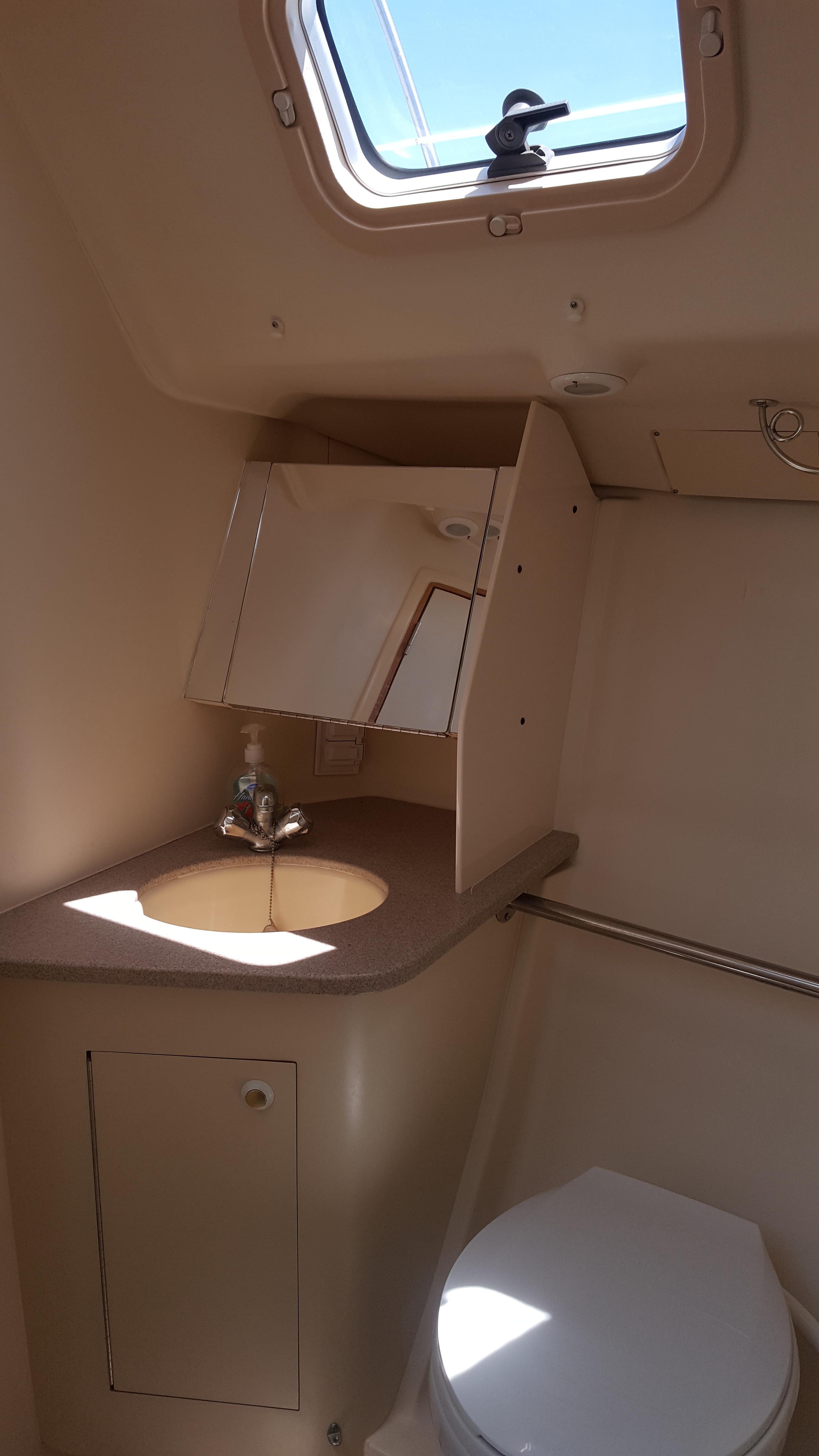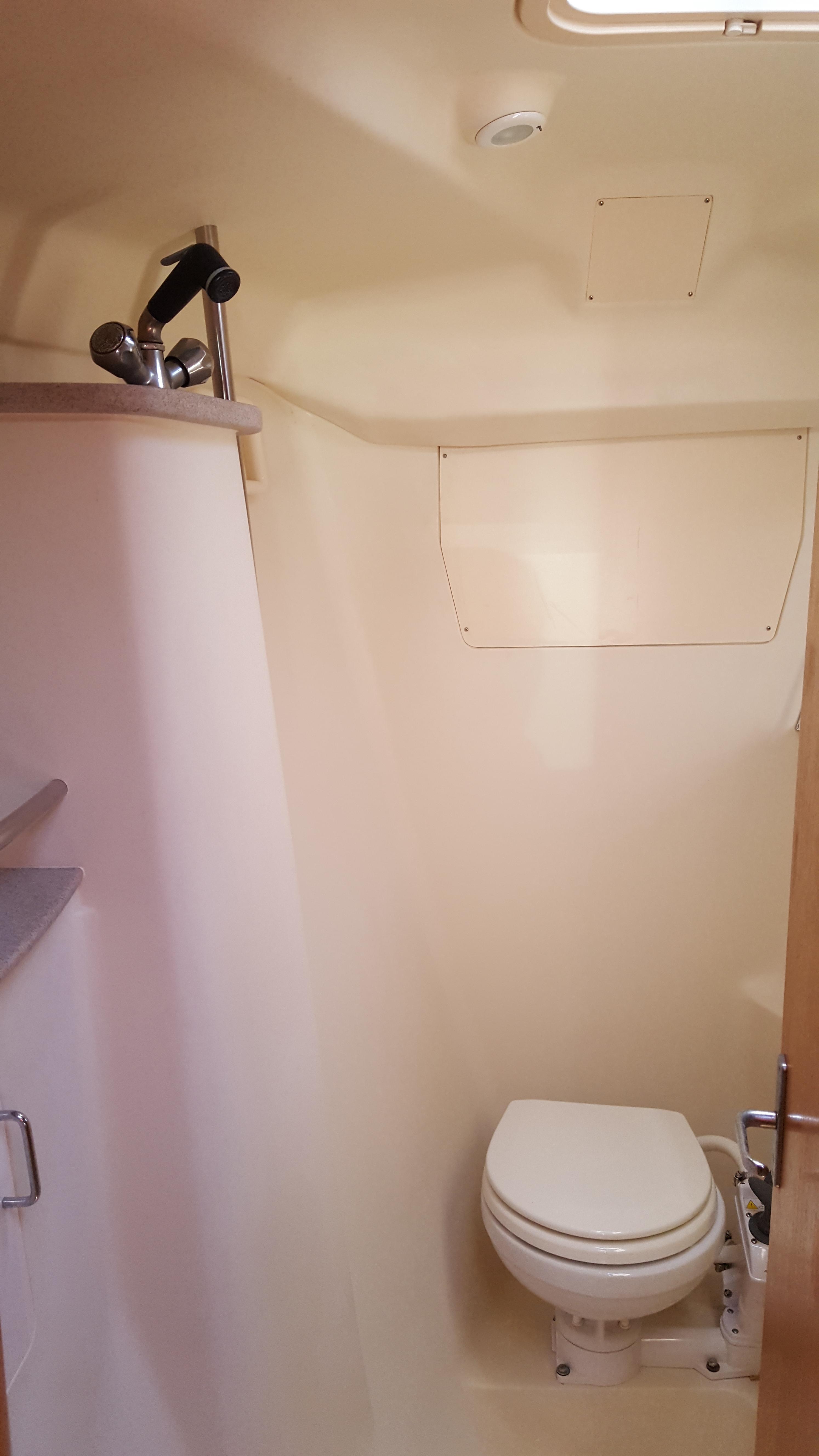 The heads are both equipped with manual marine heads with macerator pumps and automatic shower sump pumps.