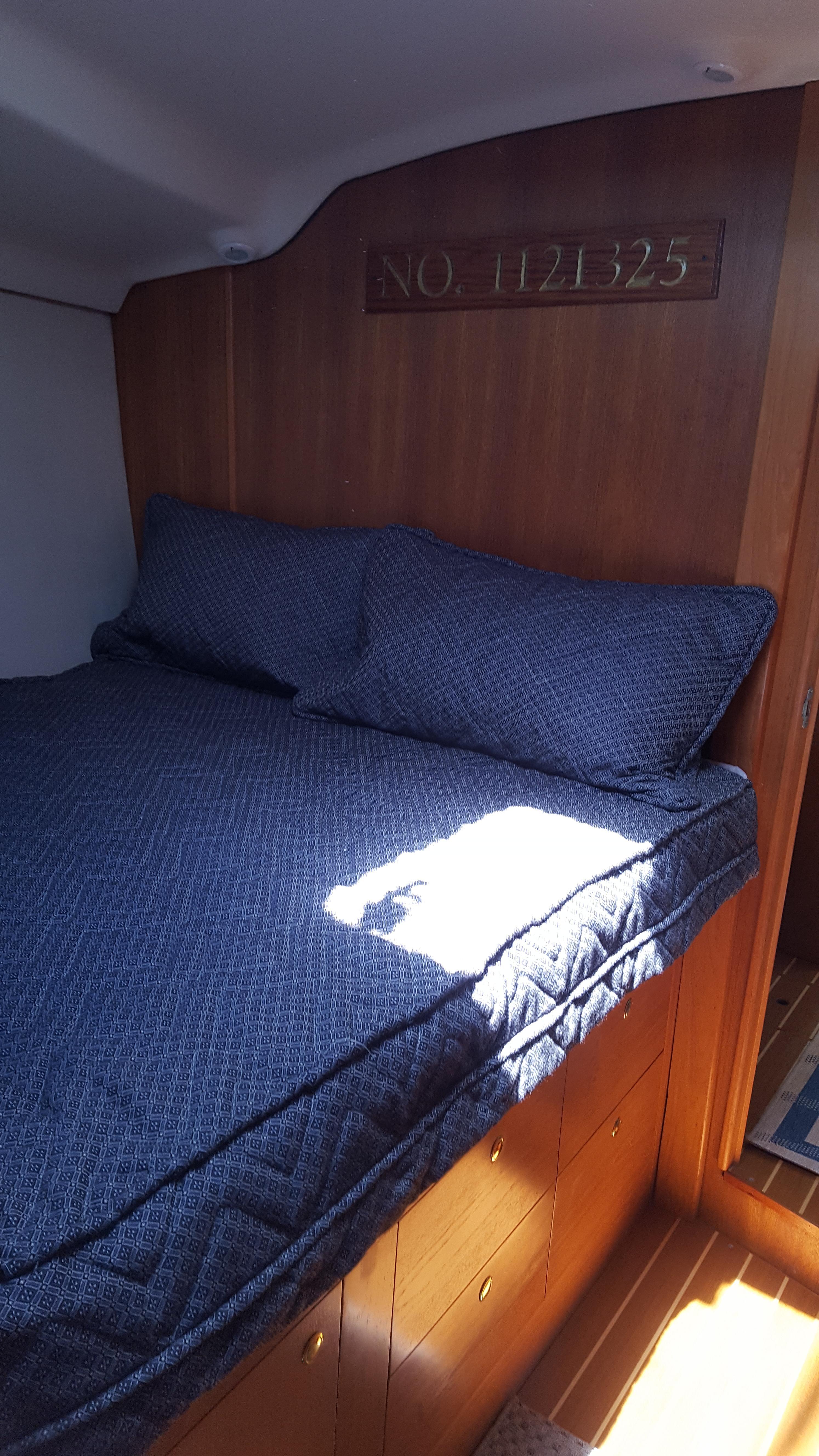 The forward guest suite has a queen size berth to starboard with storage drawers below the berth and shelves for storage on both port and starboard. The head is forward in the guest suite.