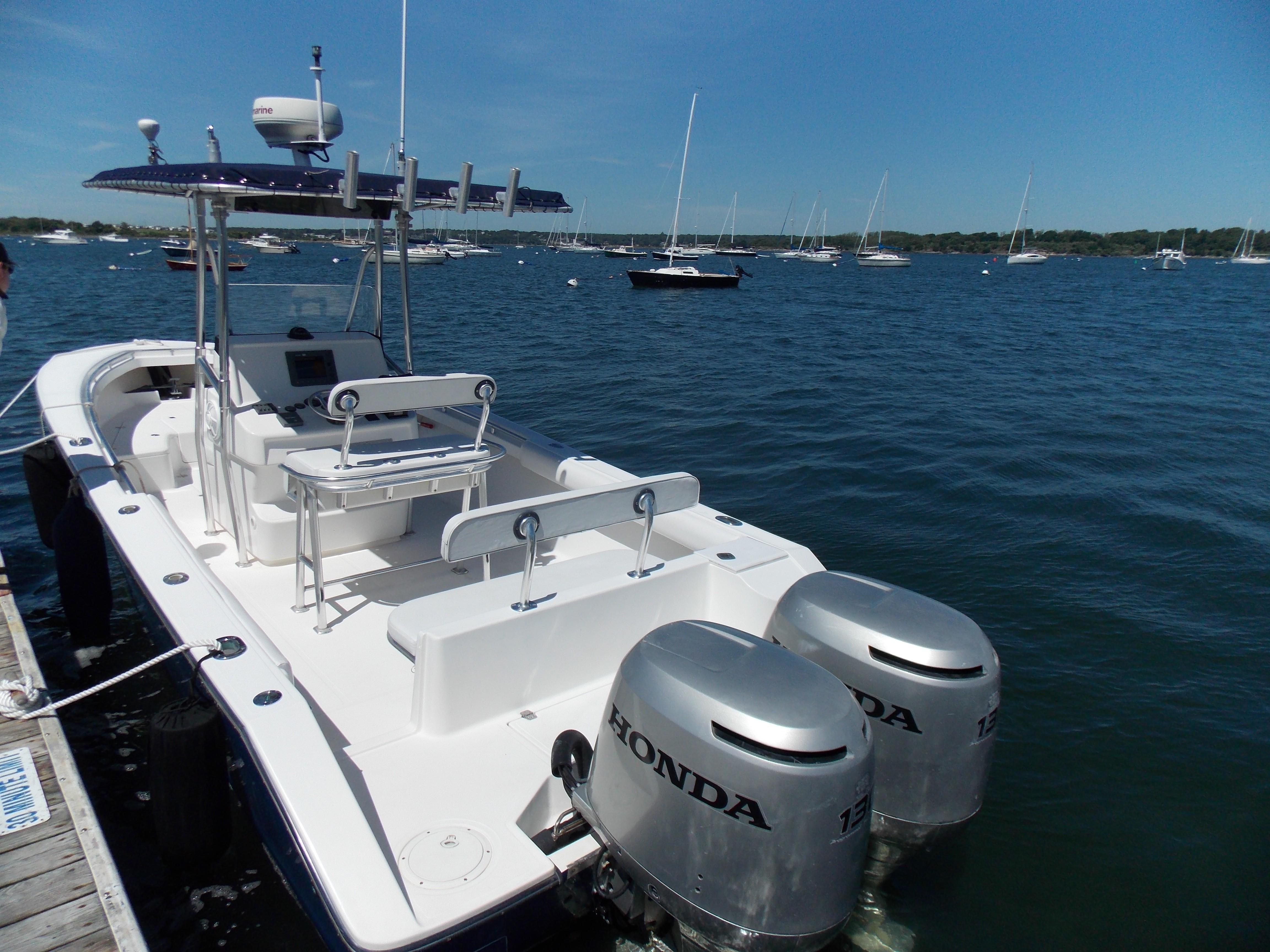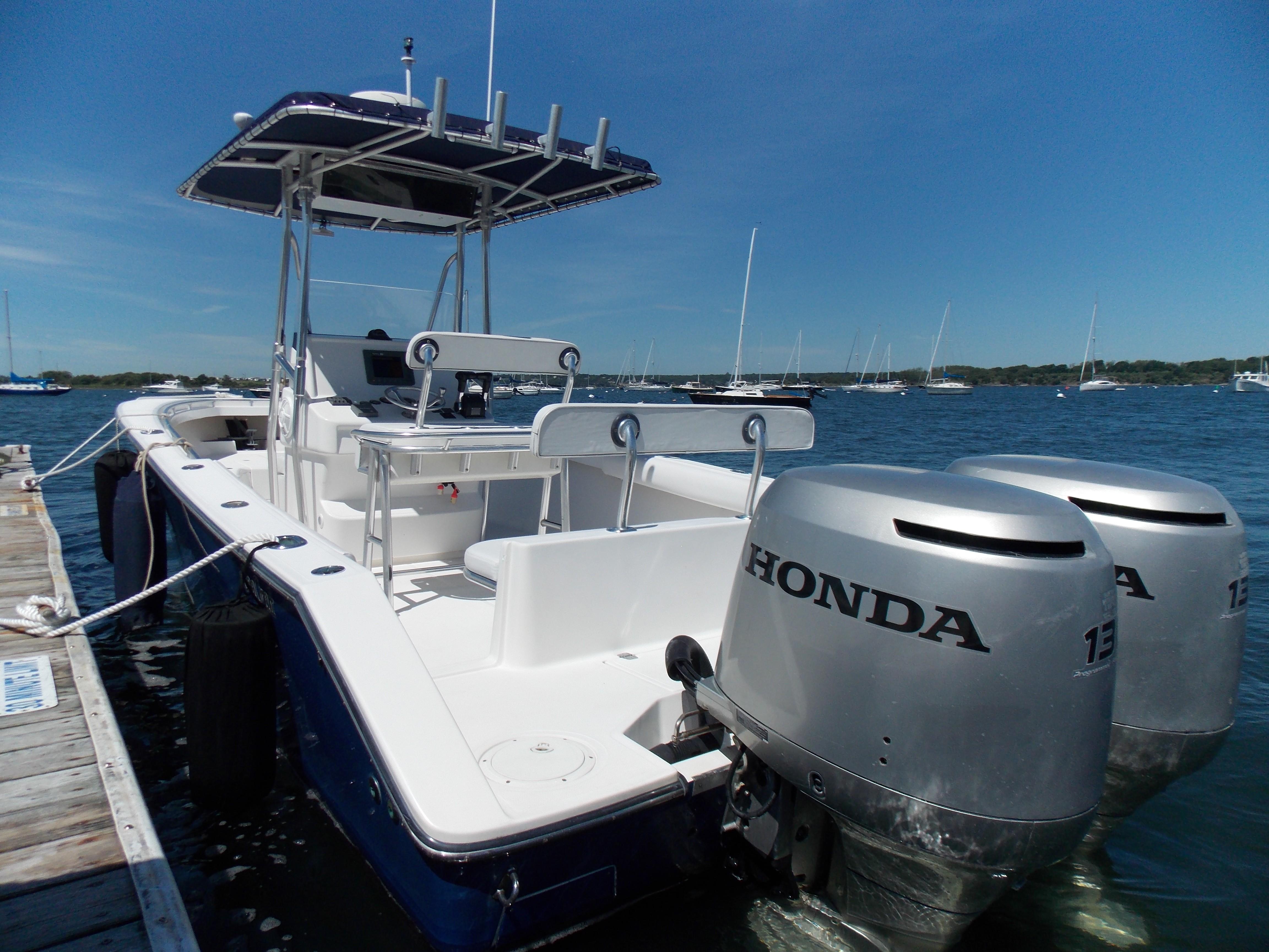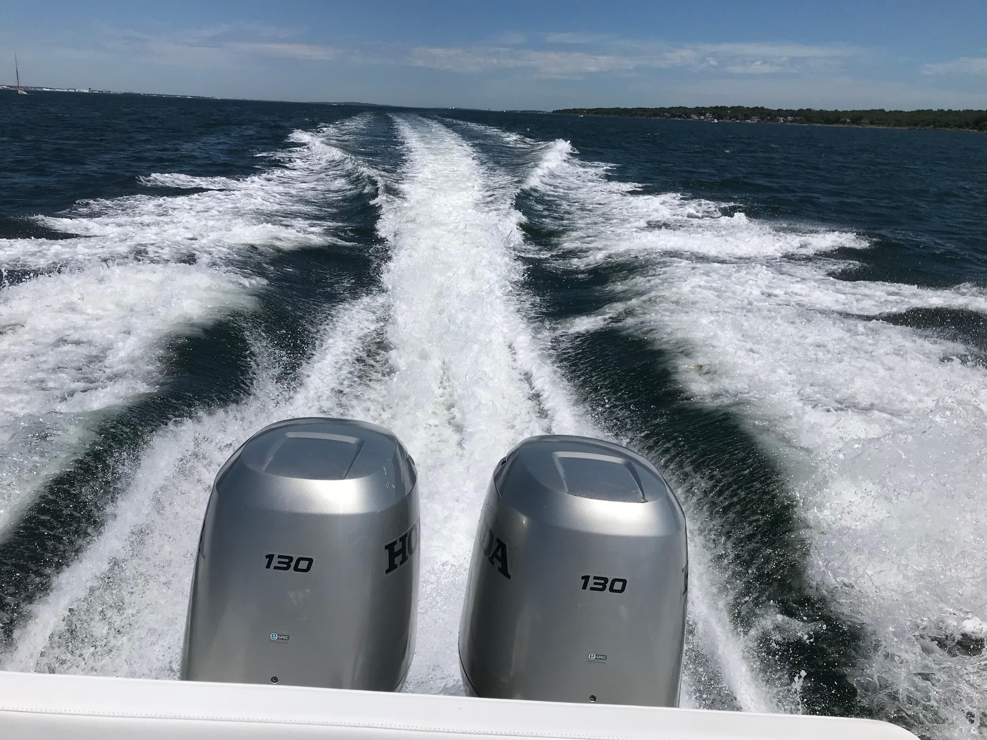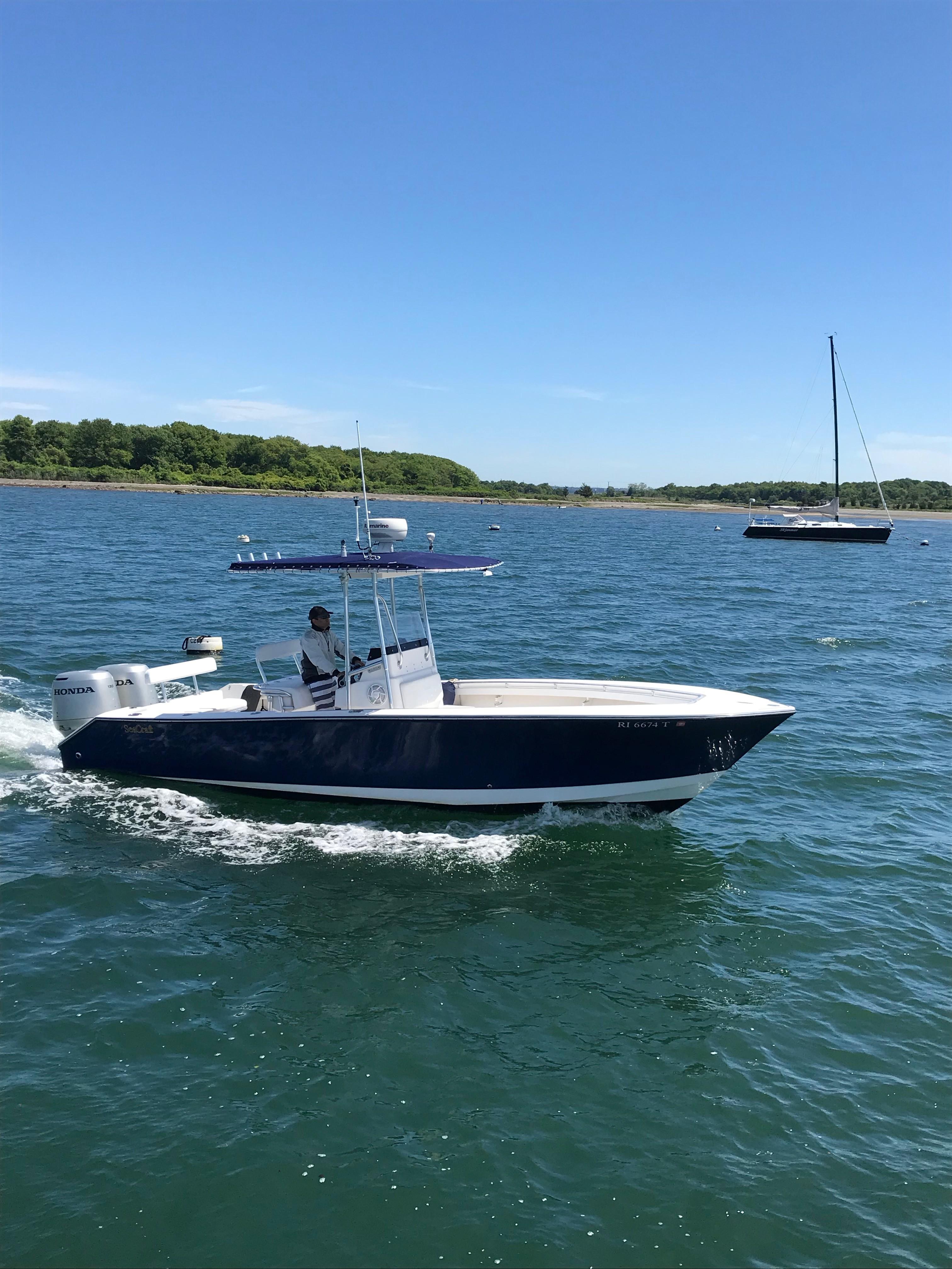 The owner reports the boat handles 2-3 foot chop with ease at 25+ knots and the boat feels larger when it counts. This boat has been an all-around performer for everything from cruising around Narragansett bay to 30 miles night runs fishing stripers off Block Island and beyond. Although not the fastest center console she is smooth and very efficient to run. If you want to do 40 knots and burn 30 gallons per hour this is not your boat. If you want to cruise at 27 knots all day long, she is well worth a look.