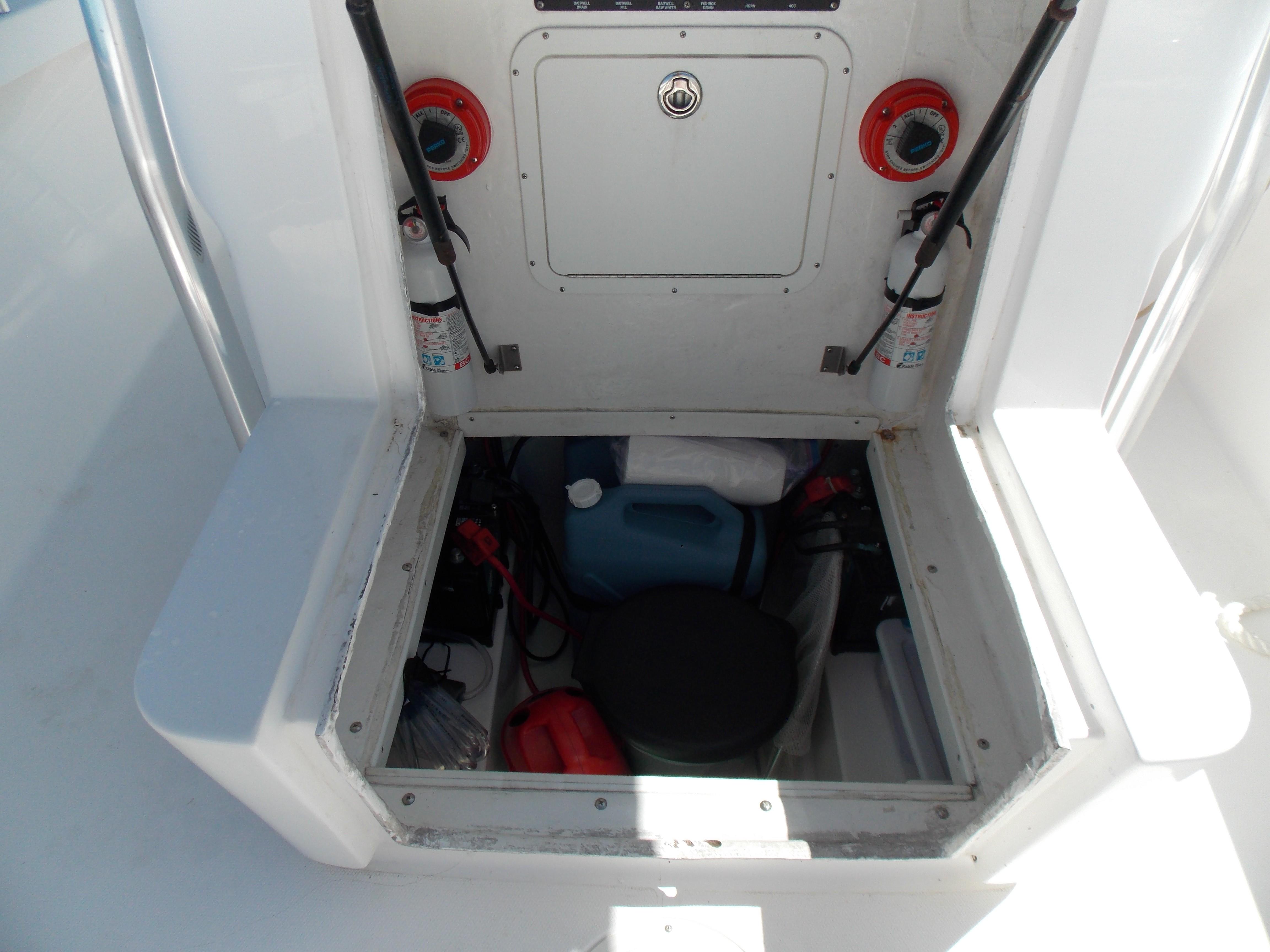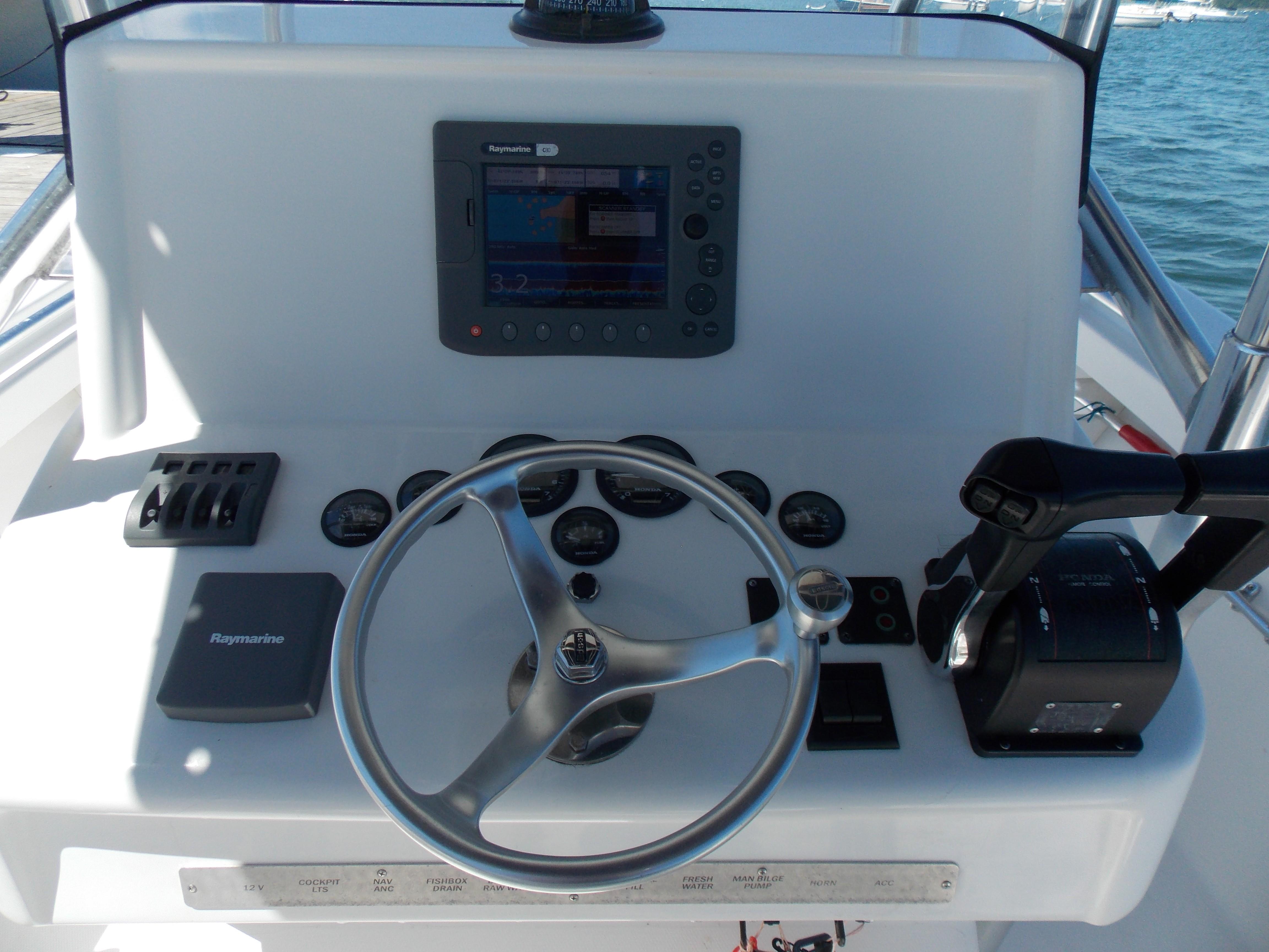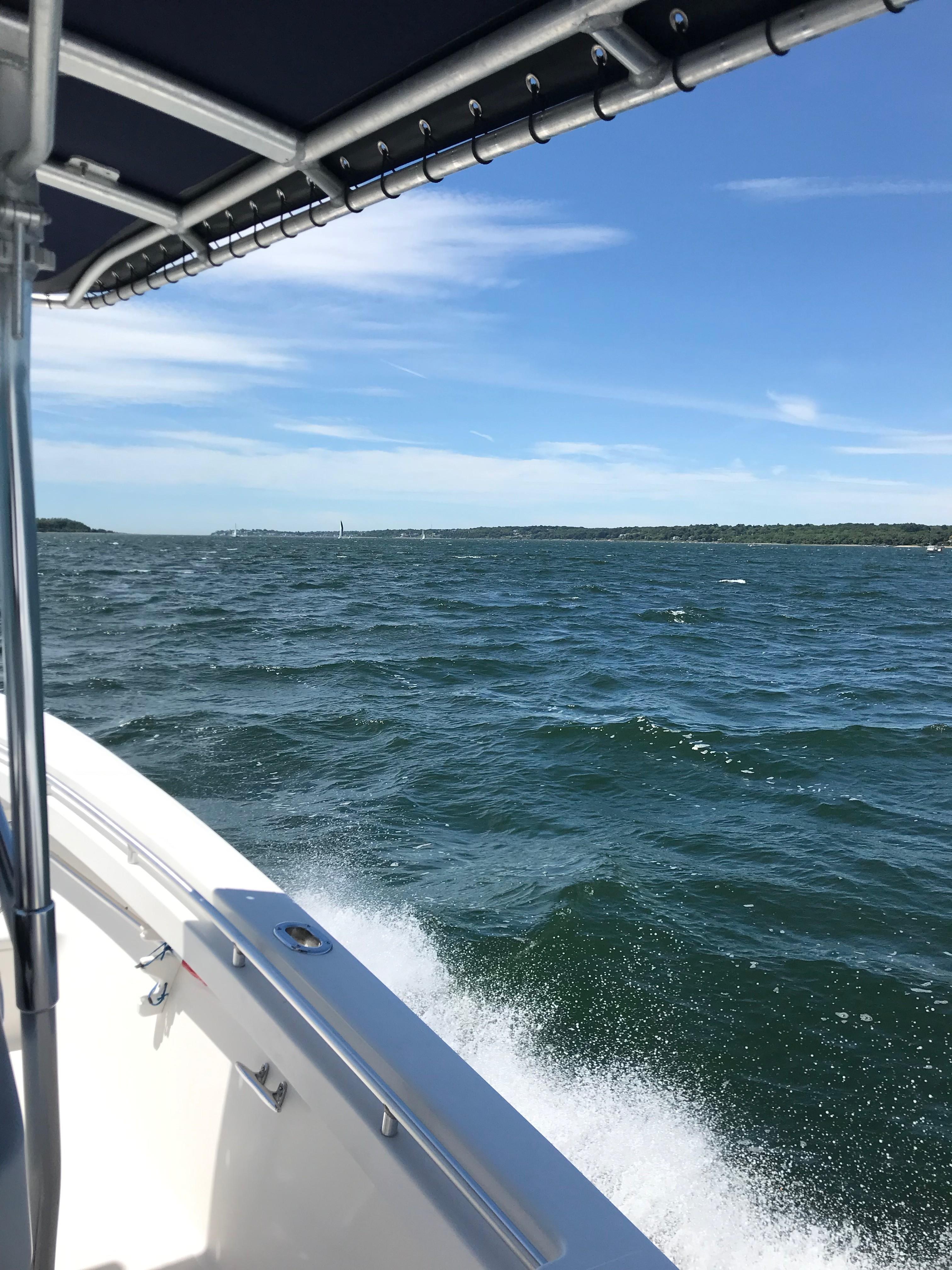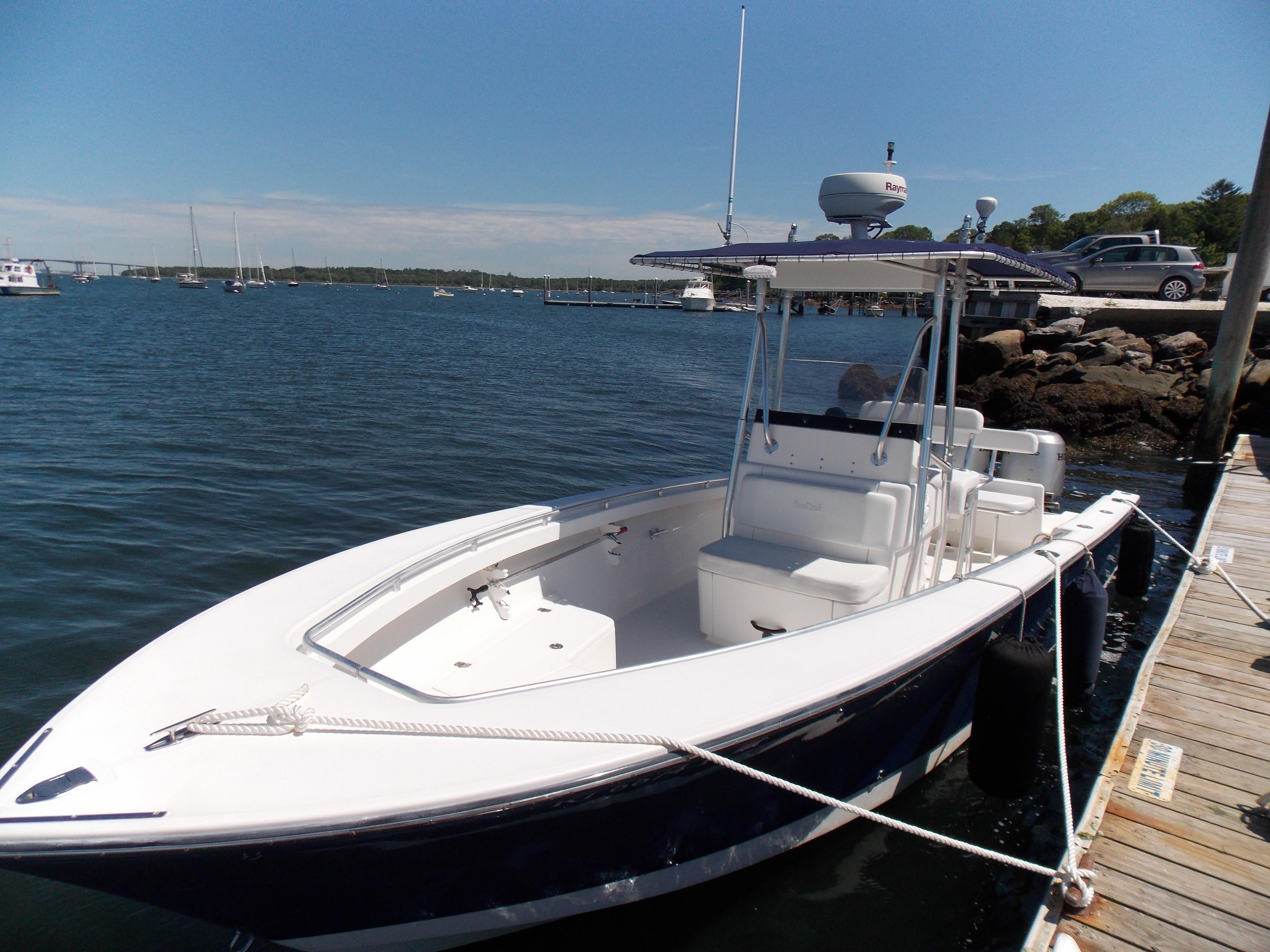 The owner reports the boat handles 2-3 foot chop with ease at 25+ knots and the boat feels larger when it counts. This boat has been an all-around performer for everything from cruising around Narragansett bay to 30 miles night runs fishing stripers off Block Island and beyond. Although not the fastest center console she is smooth and very efficient to run. If you want to do 40 knots and burn 30 gallons per hour this is not your boat. If you want to cruise at 27 knots all day long, she is well worth a look.