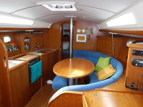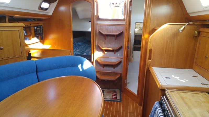- The main saloon has a curved dinette to starboard, galley to port, and the head aft of the galley to port. There is storage under the settee and dinette, as well as behind and above them. A teak and holly sole and teak bulkheads give the boat a rich feel inside.