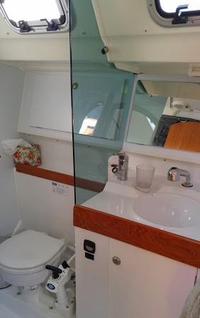 - The head has a marine toilet w/holding tank, sink w/ hot and cold water, shower, and storage for supplies.