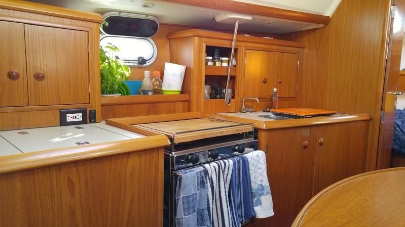 - The galley is on the port side and includes a 2 burner propane stove with oven, SS sink with hot and cold pressure water, 12v fridge w/freezer, microwave, plenty of storage and counter space.