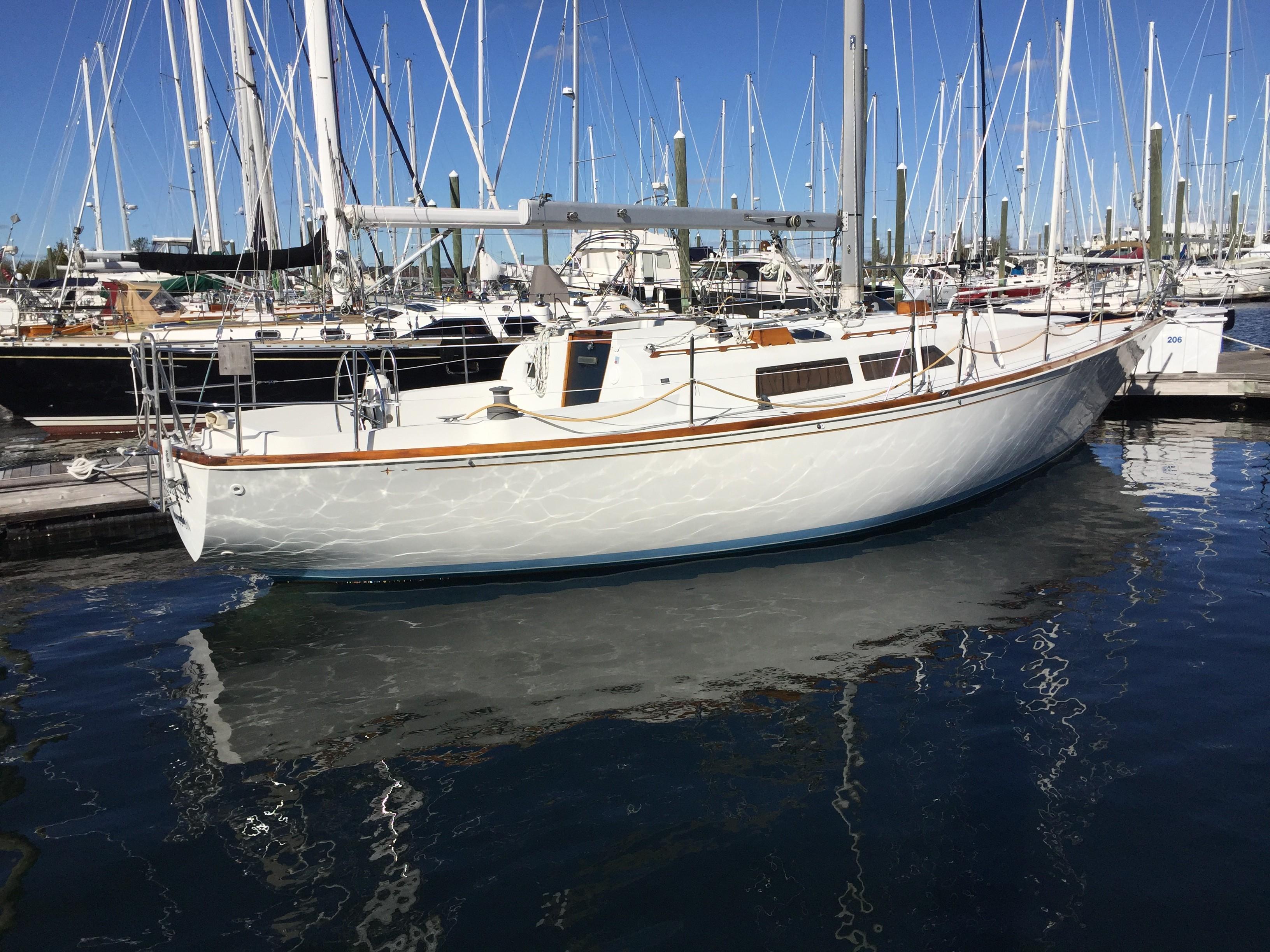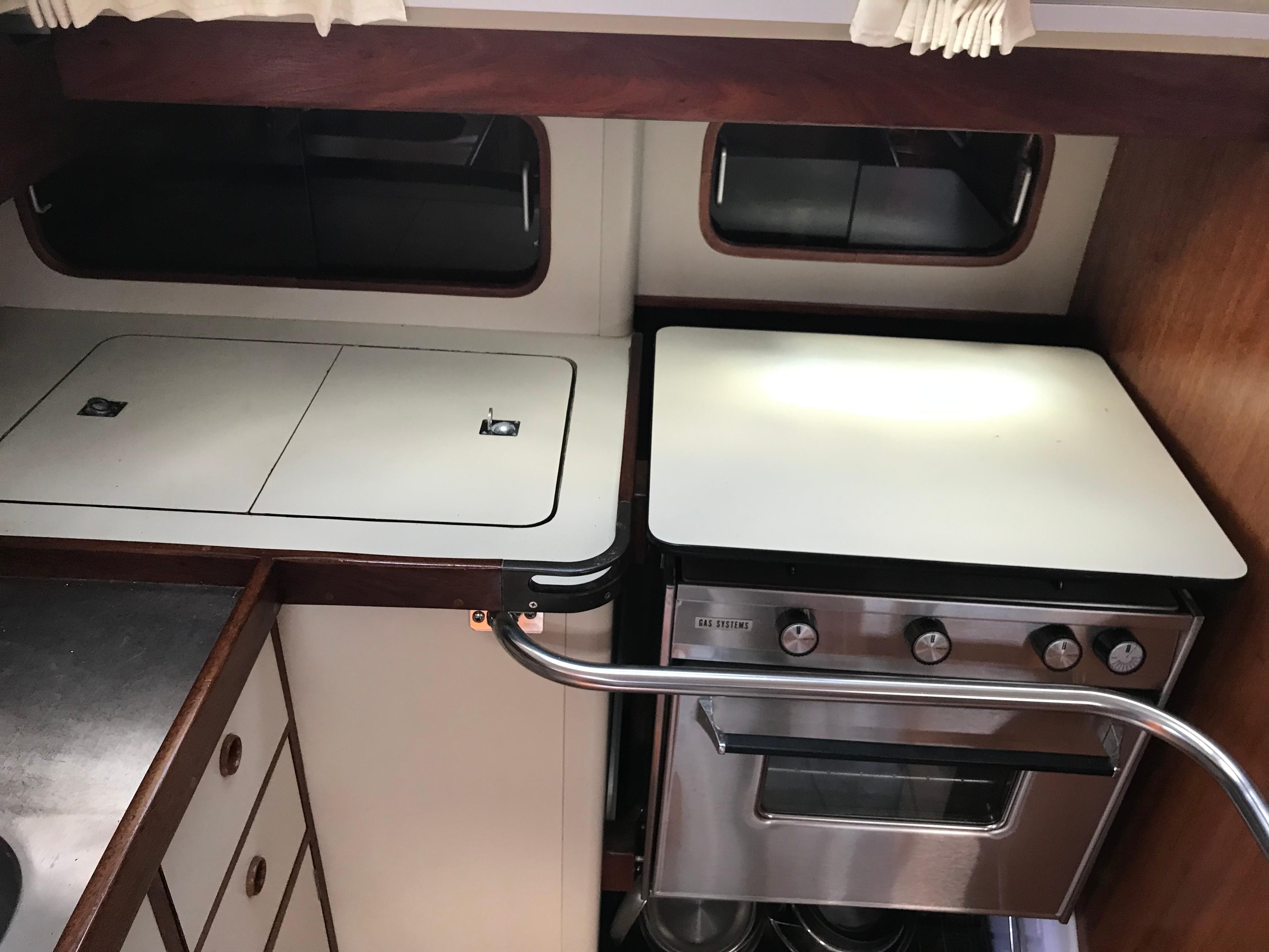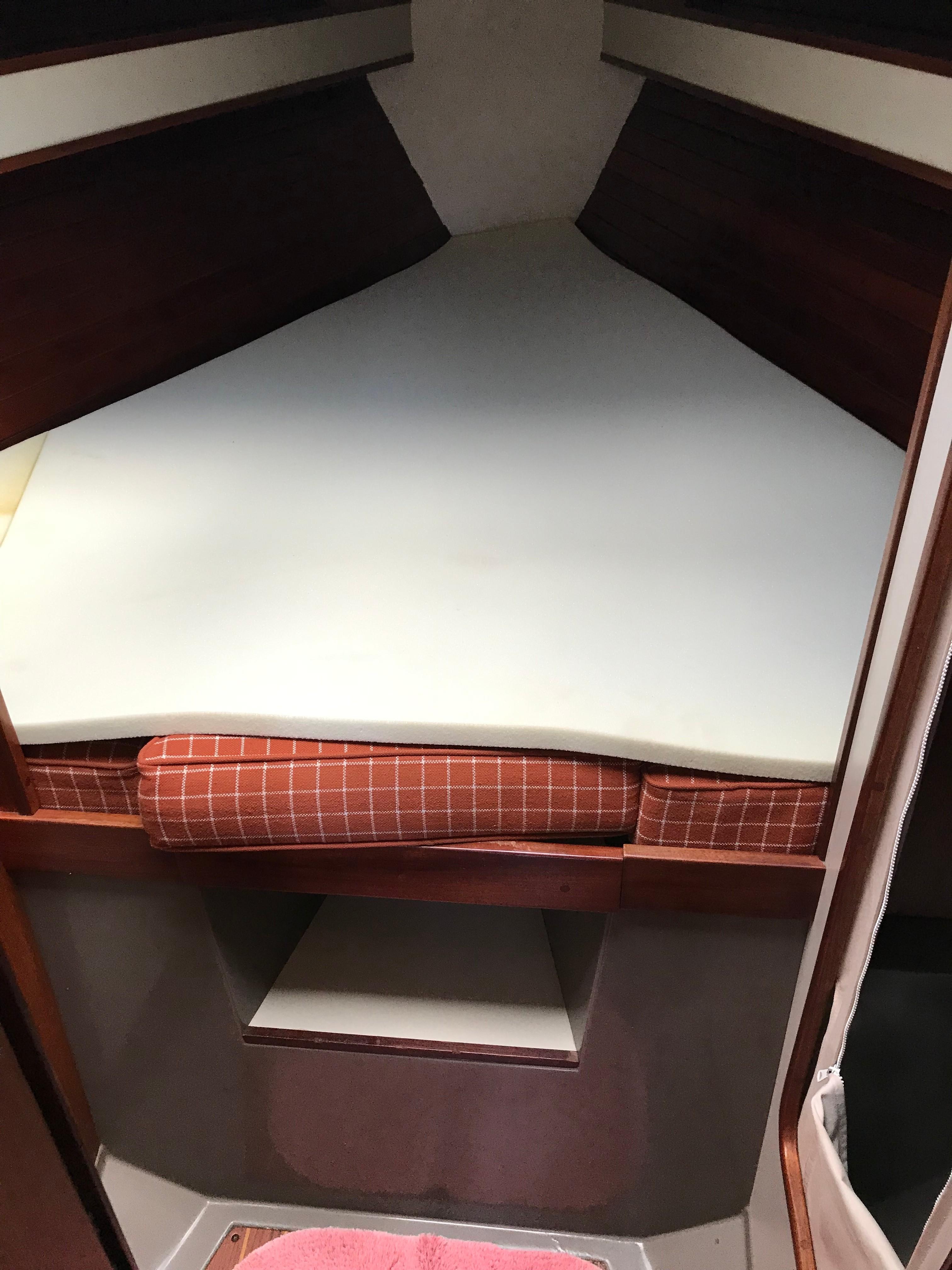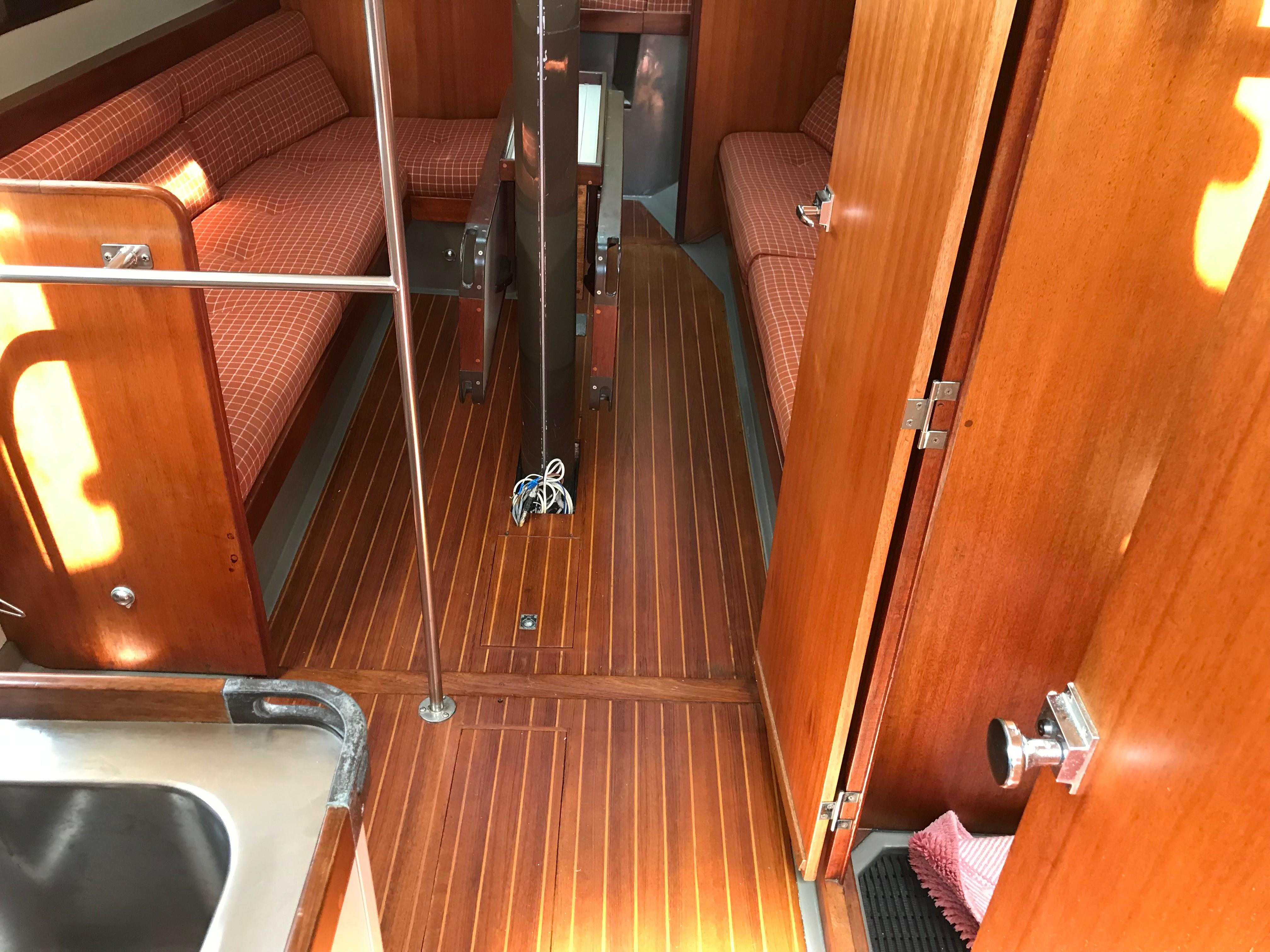 - Beginning forward, you'll find a comfortable V-berth with storage shelves outboard. This stateroom also boasts a good sized hanging locker to starboard and a bureau to port. A door separates this area from the main saloon next aft. To port this saloon has an L-shaped settee with a custom extension to convert it to a very ample double berth. A straight settee is to starboard and a dropleaf dining table is mounted on the centerline. Aft of the straight settee is another hanging locker and drawers. Both sides of the saloon have enclosed storage lockers outboard. Continuing aft is the head compartment with sink, vanity, marine toilet and shower. Storage has also been provided in this area. The nav station is to starboard at the companionway. The galley is to port, across from the head compartment. It is followed by a double quarterberth.