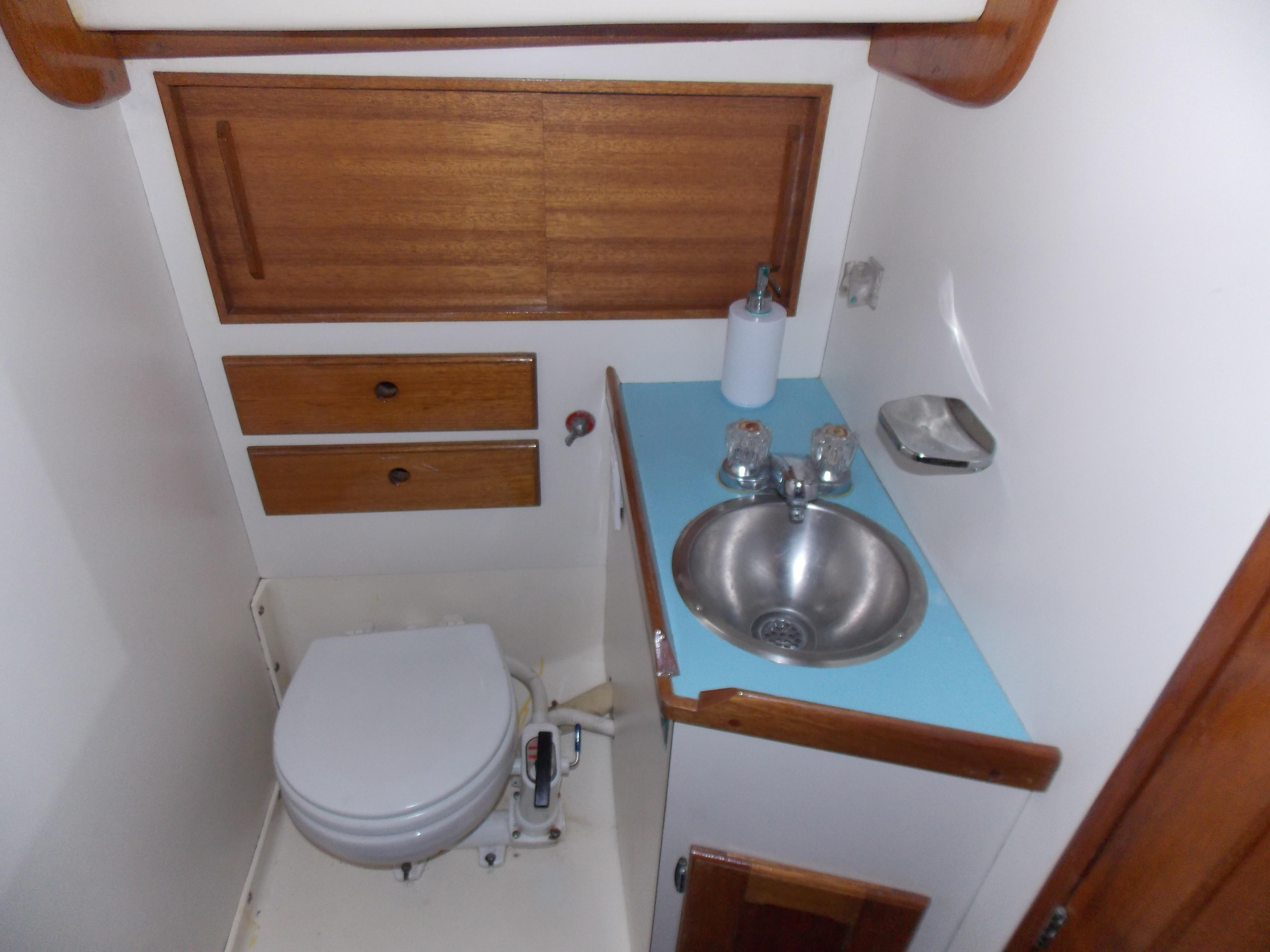 - Manual marine head with holding tank, deck pump out, macerator pump and overboard discharge