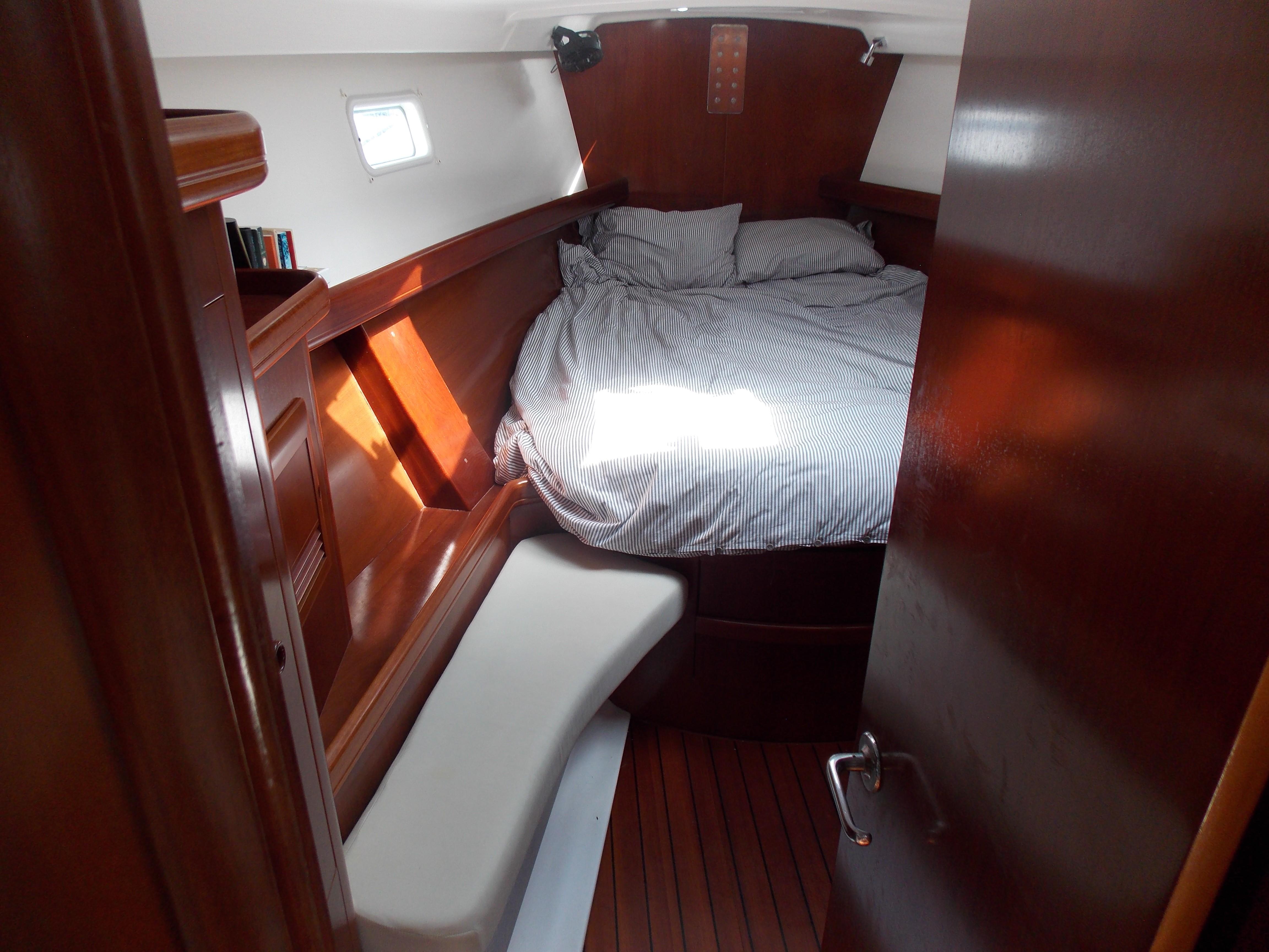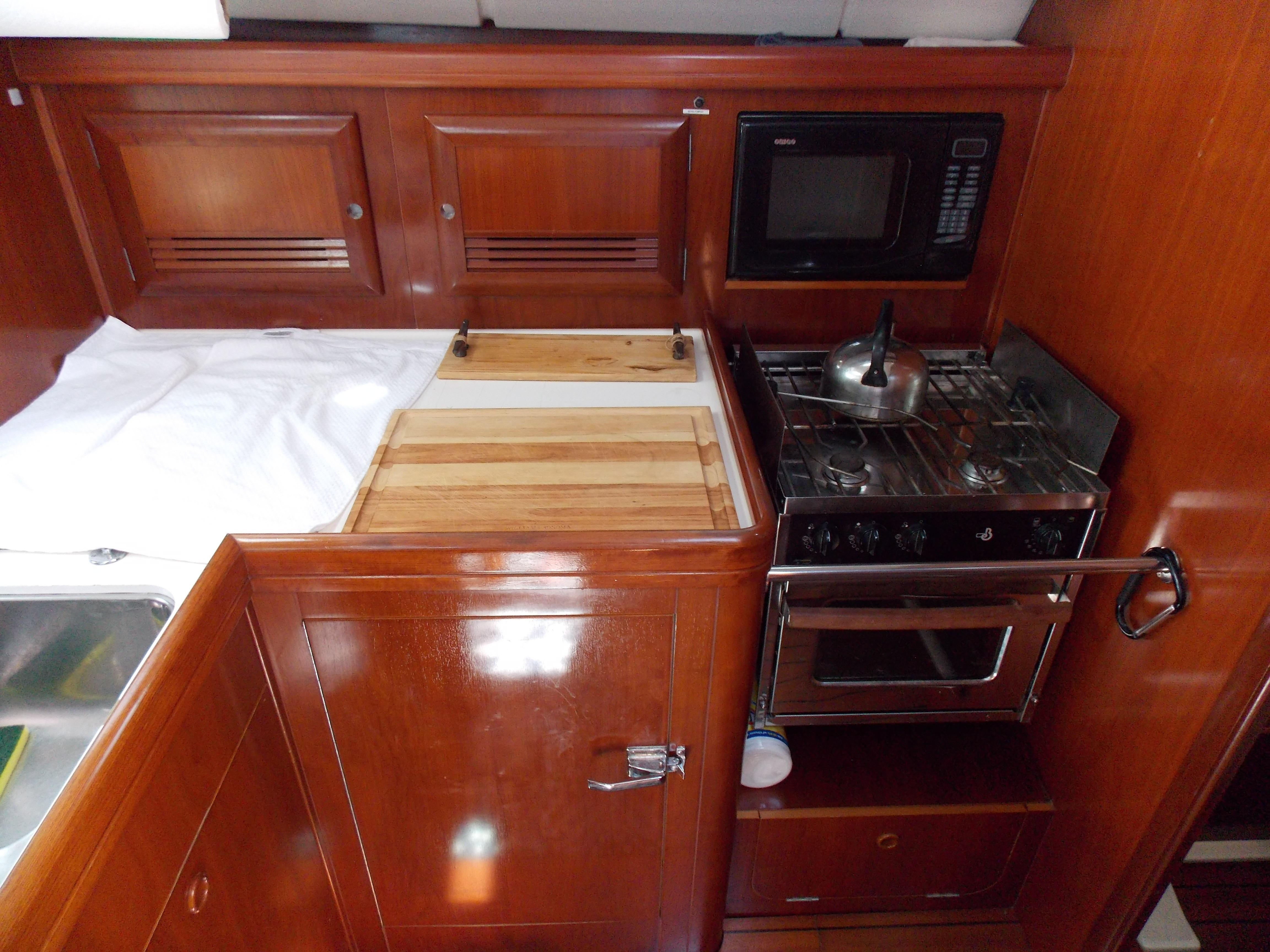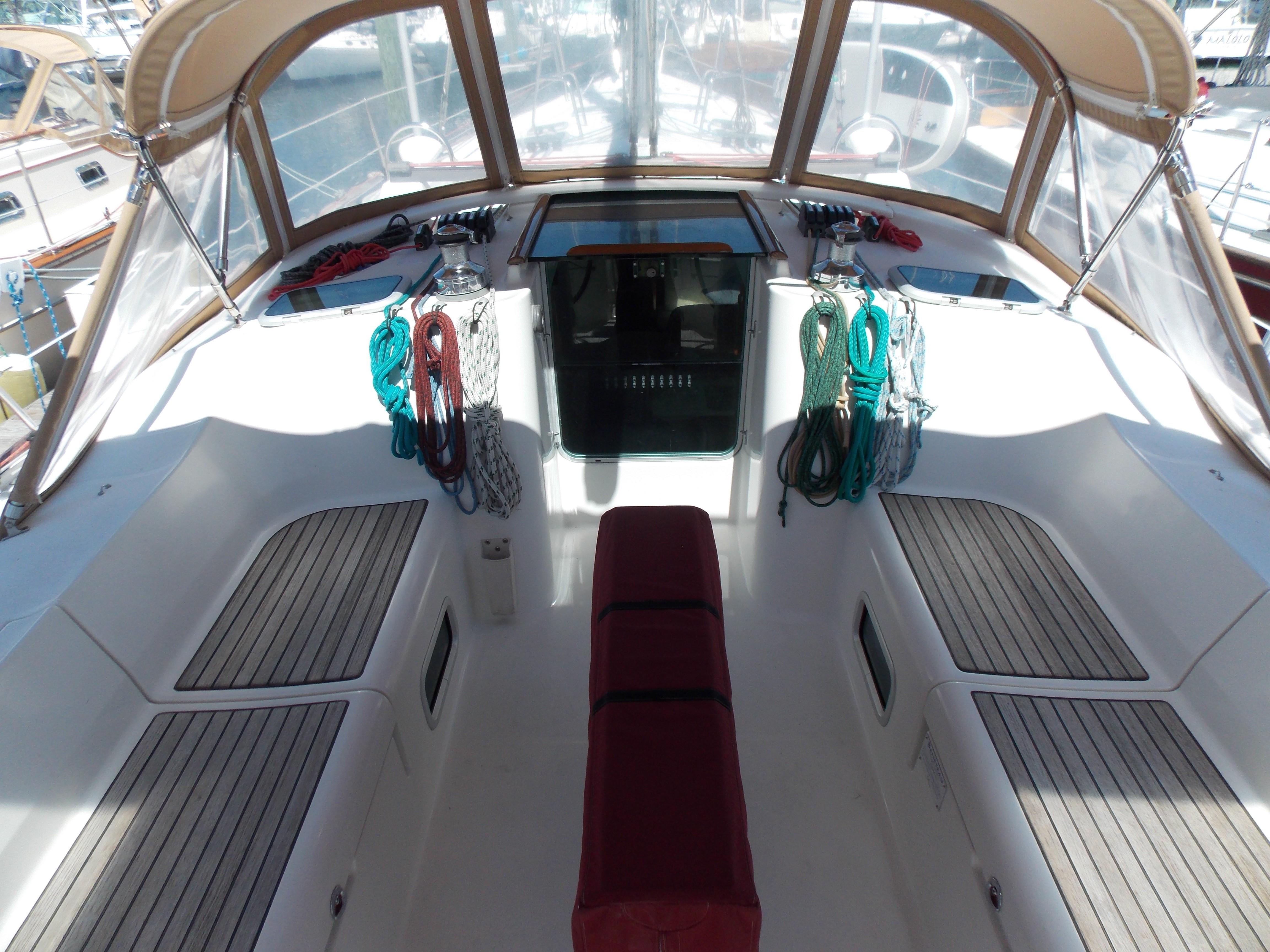 The boat has 3 cabins, with a full stateroom forward, twin bunk rooms aft. The galley has a dual stainless steel sink, a side opening fridge, freezer and a two burner stove with convention oven. The salon is large, seating for 6-8 guests with two settees , a table and an island seat amidships. Her interior joiner work is well cared for with a bright shining finish. The large cockpit seats 4-6 with custom cushions.